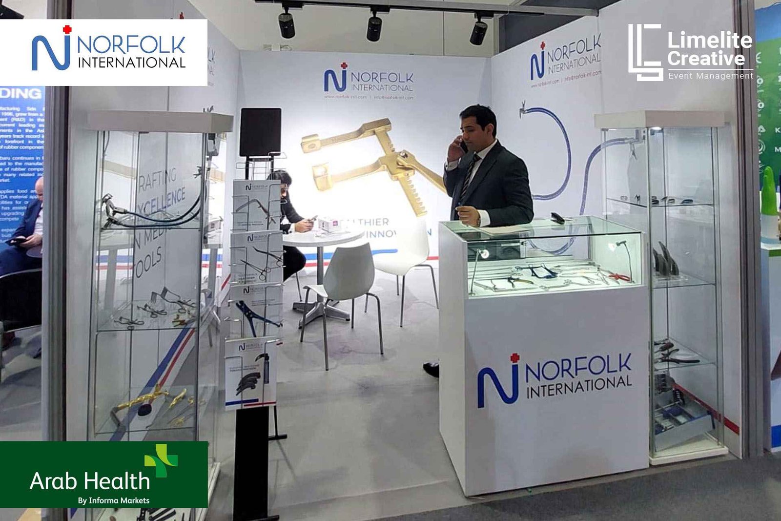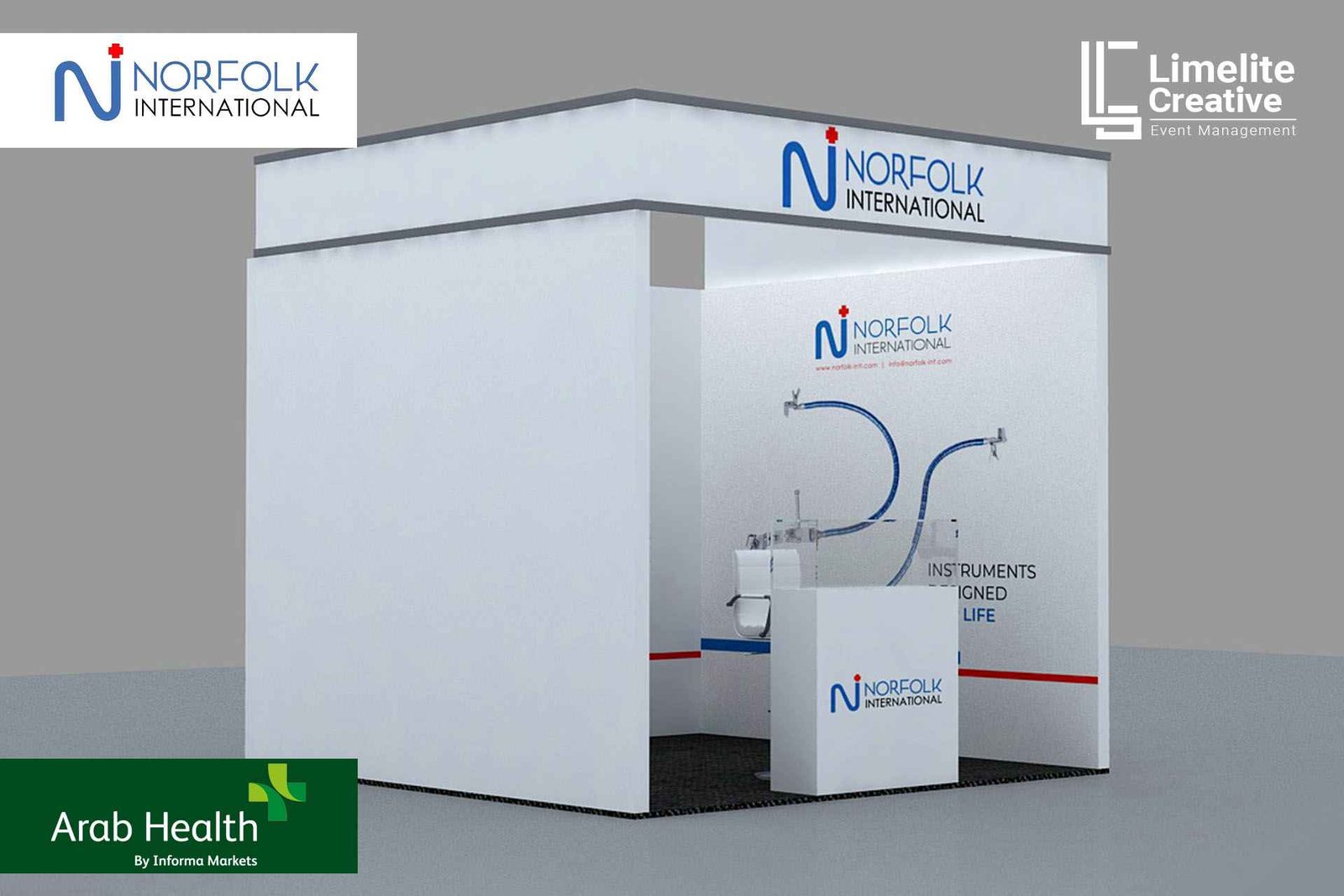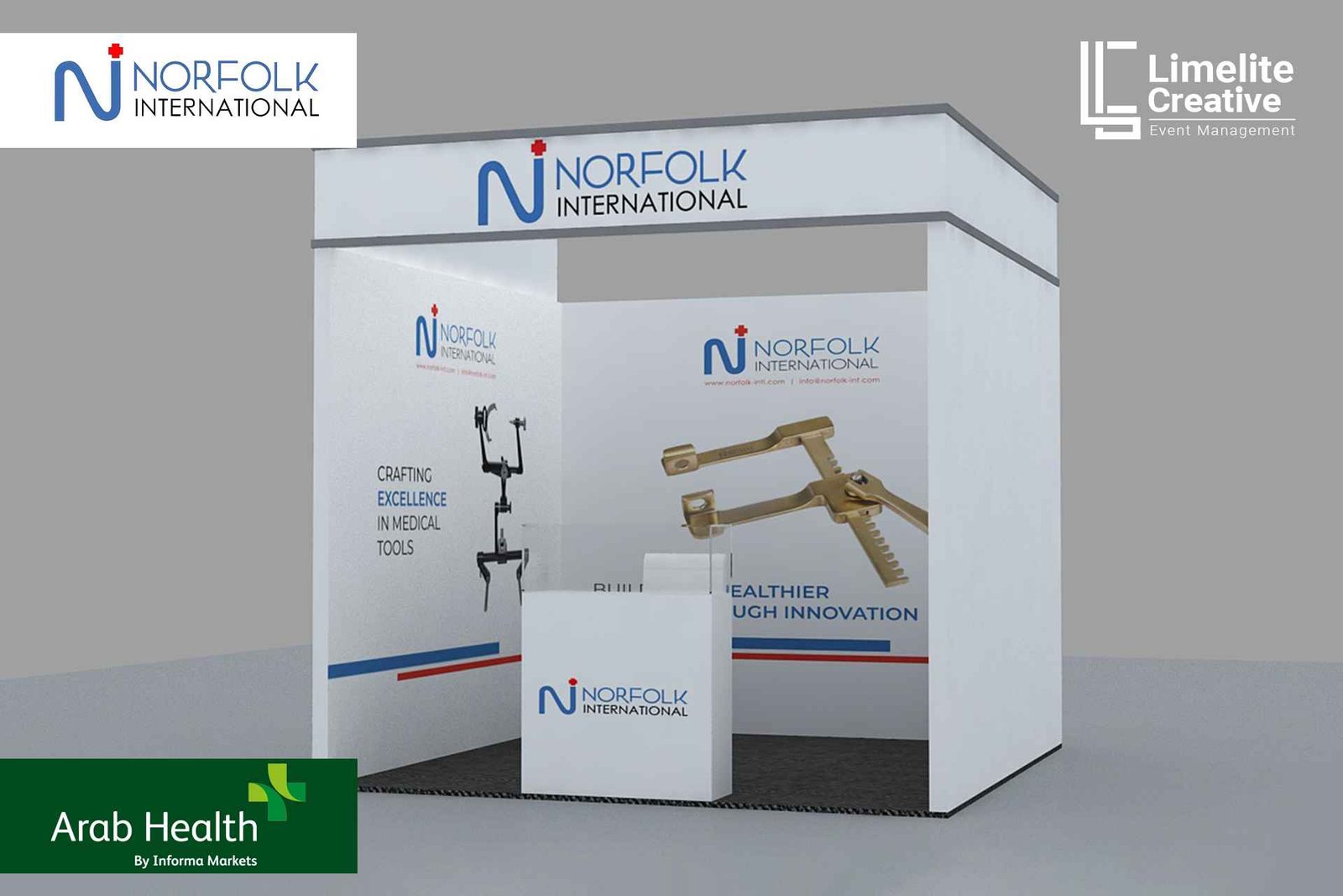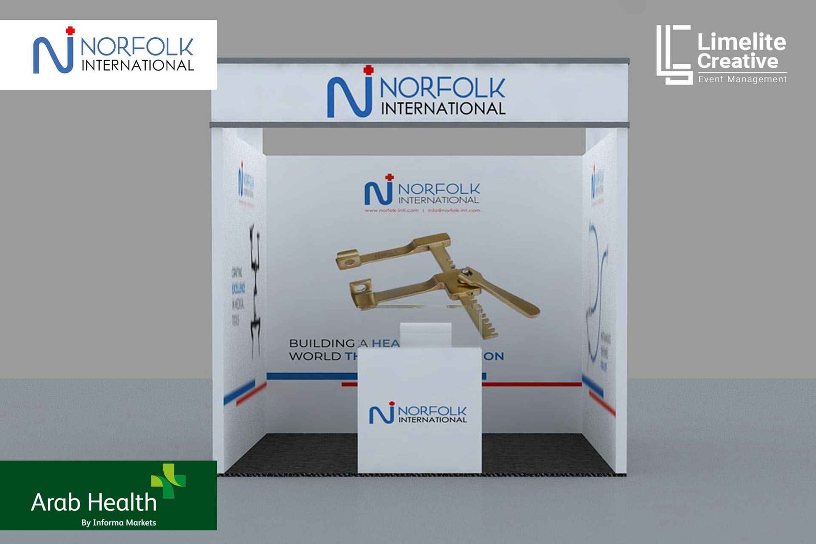 A compact and well-structured 9 sqm booth for Norfolk International at Arab Health 2024, featuring clear branding, product displays, and a professional setup to connect with healthcare professionals and industry partners.