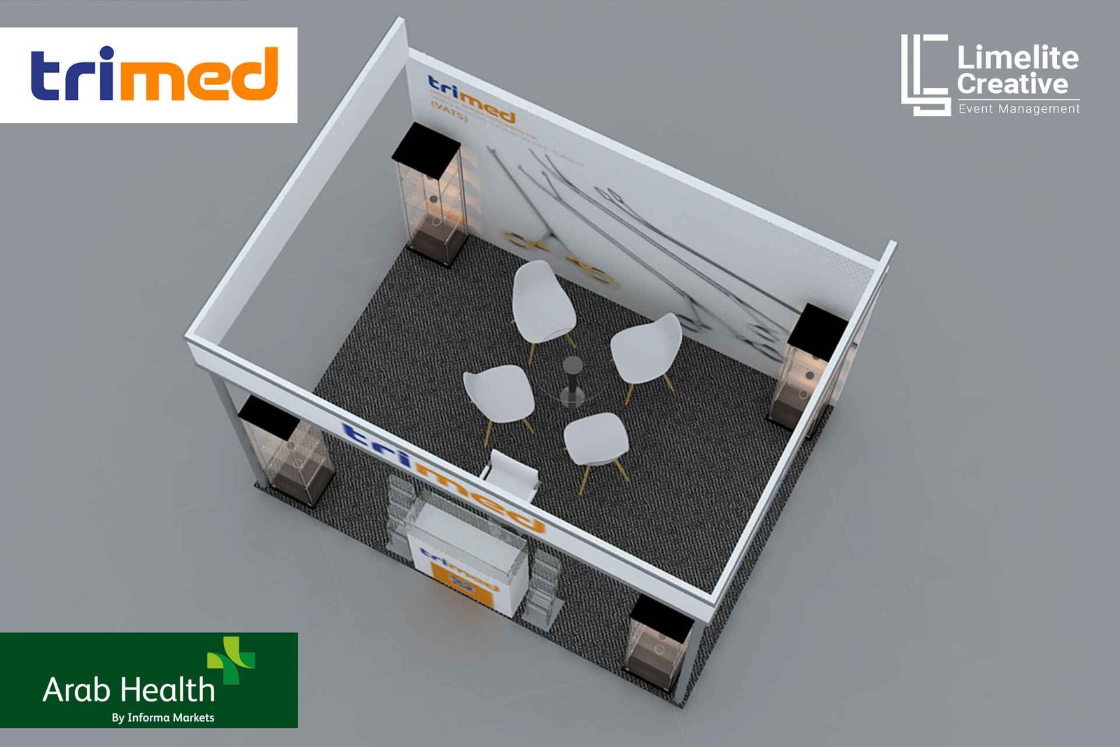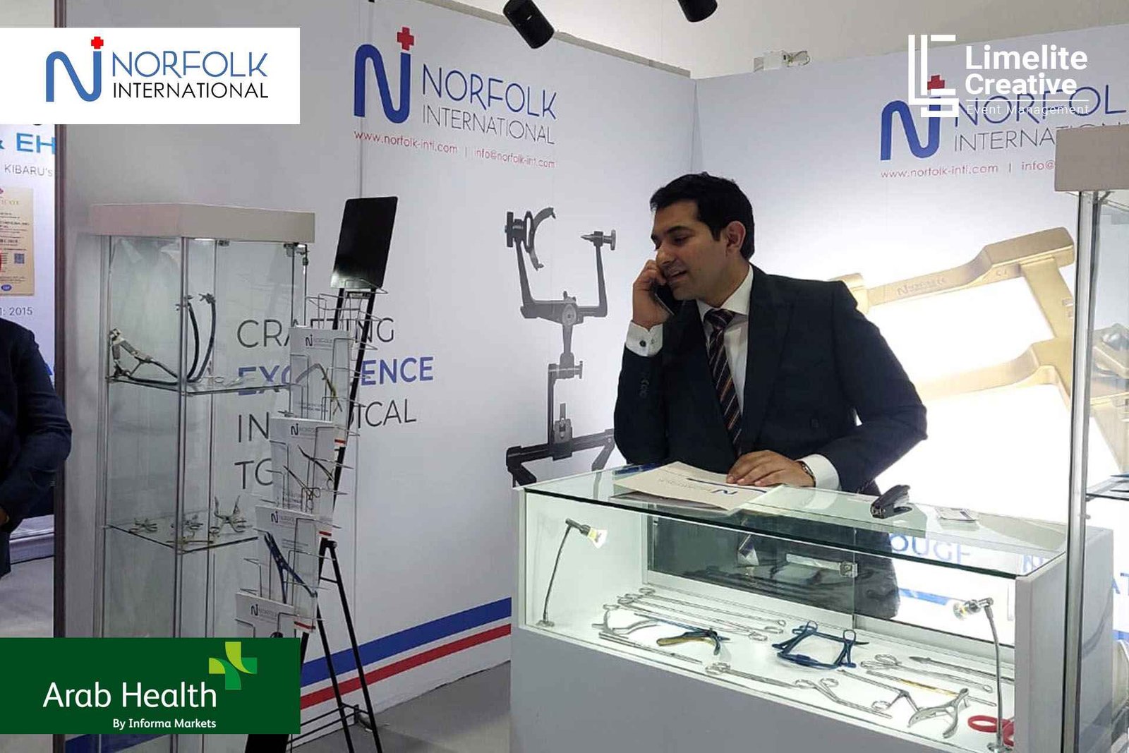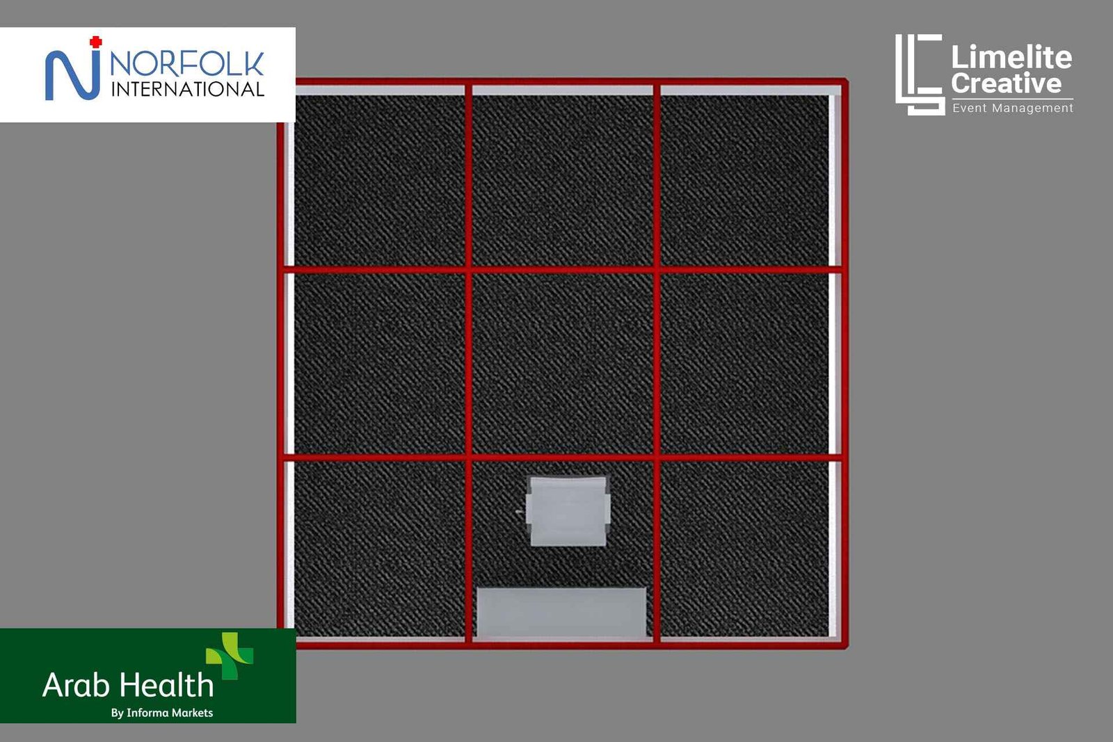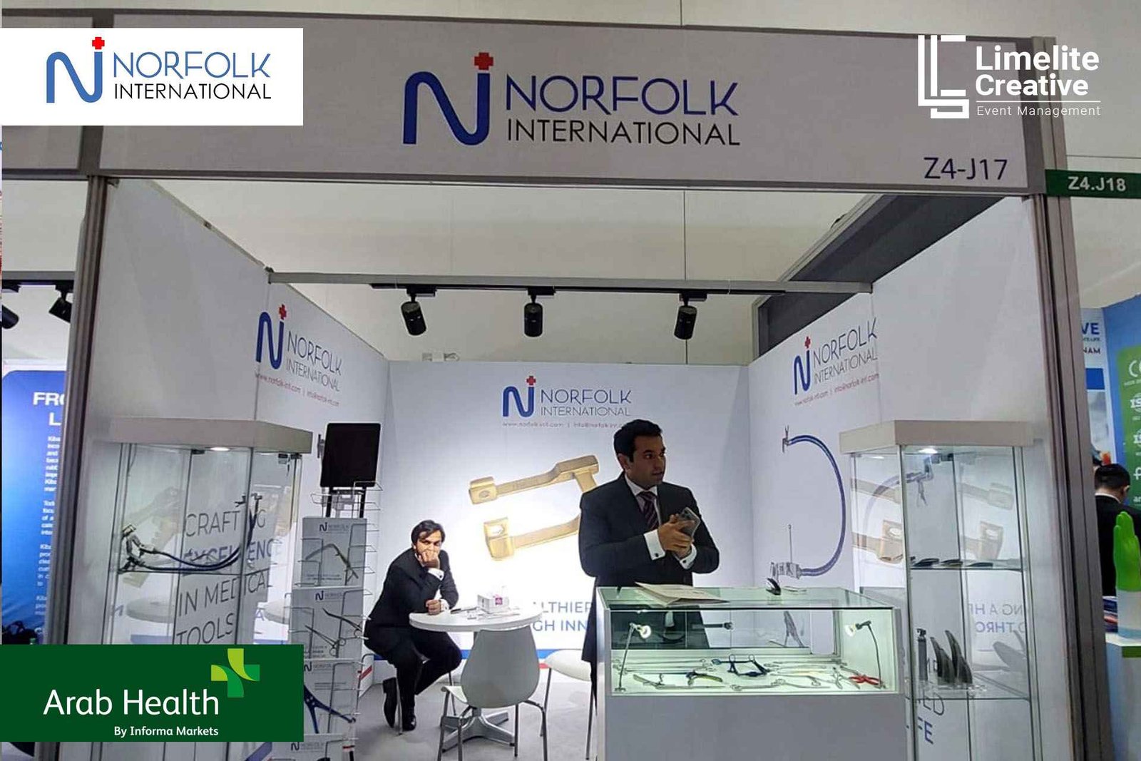 A compact and well-structured 9 sqm booth for Norfolk International at Arab Health 2024, featuring clear branding, product displays, and a professional setup to connect with healthcare professionals and industry partners.