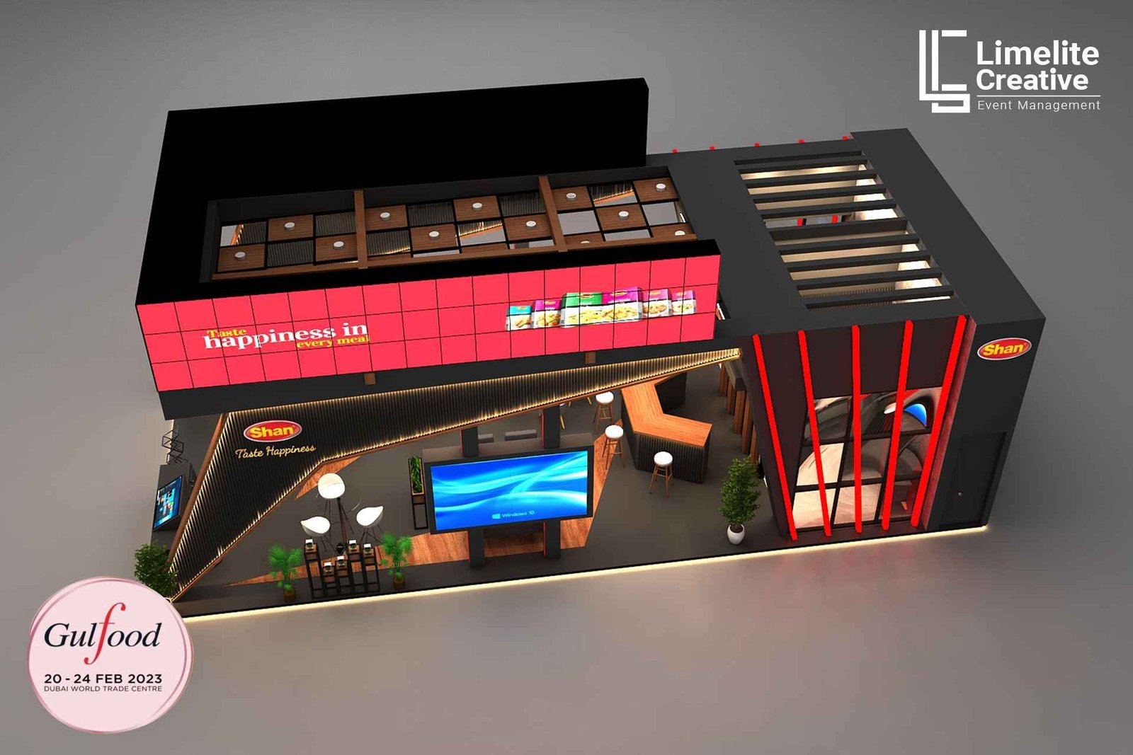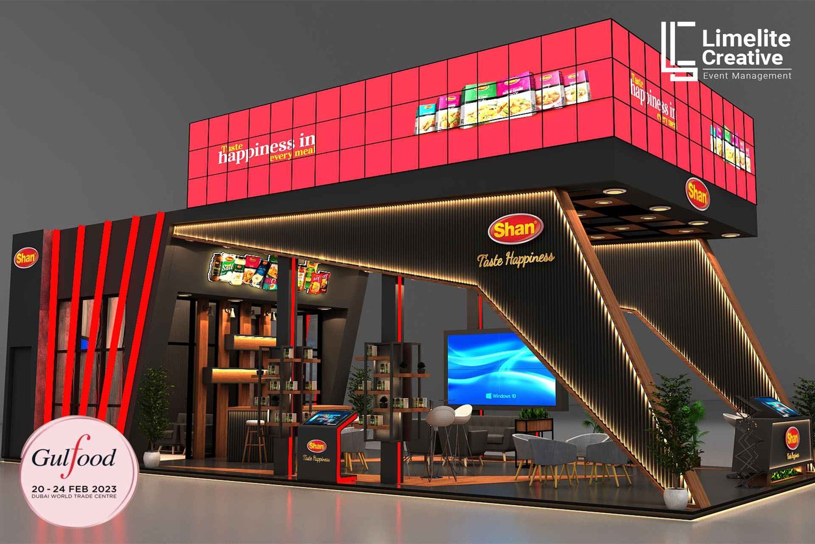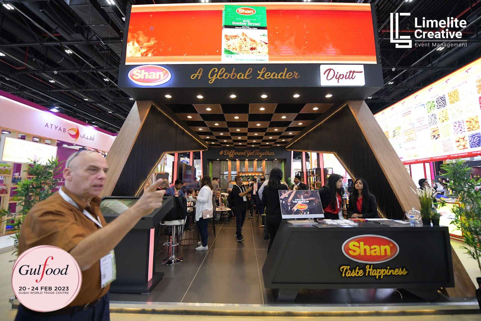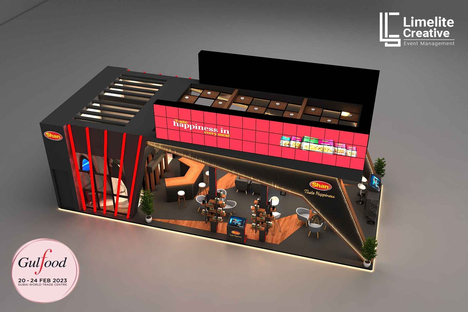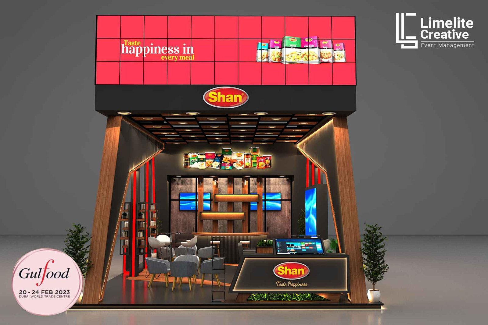 A spacious 14m x 6m booth for Shan Foods at Gulfood 2023, designed with premium branding, vibrant product displays, and an inviting layout to highlight their diverse food range and attract global visitors.