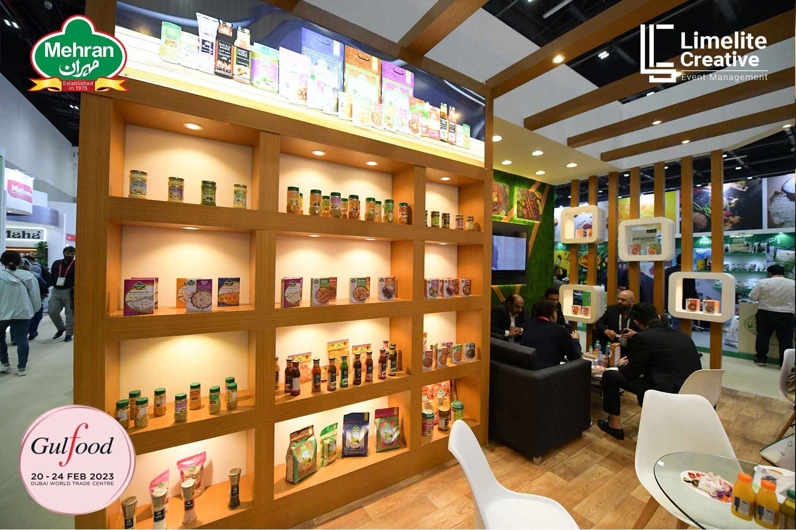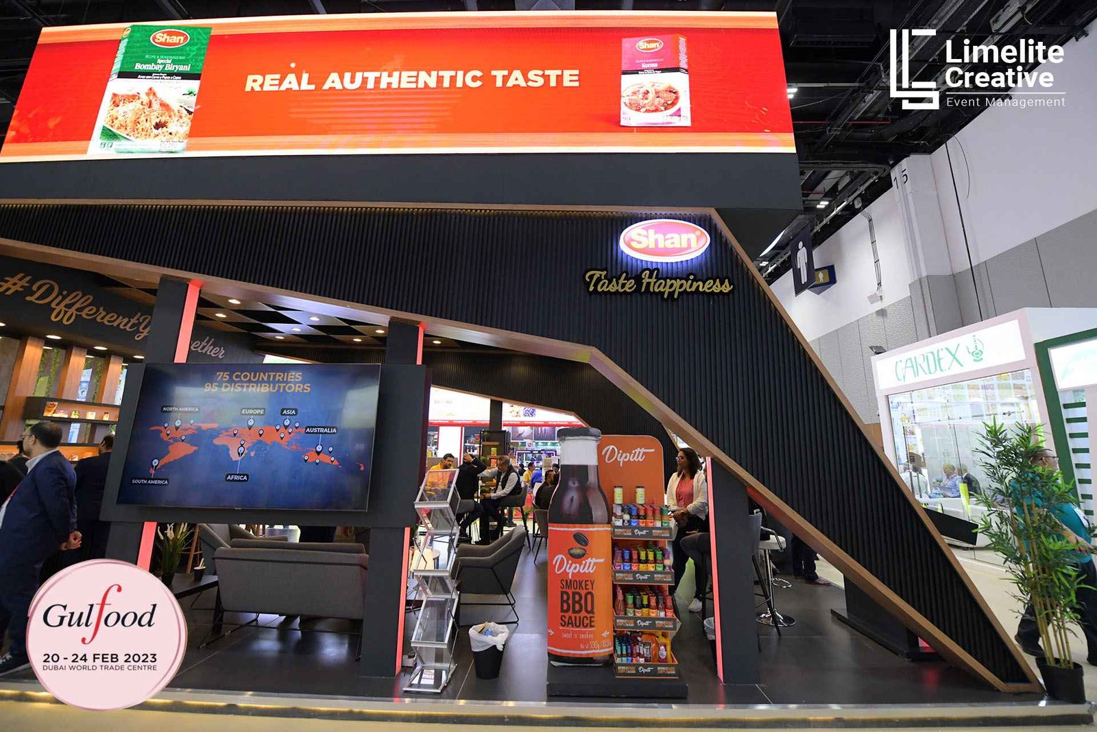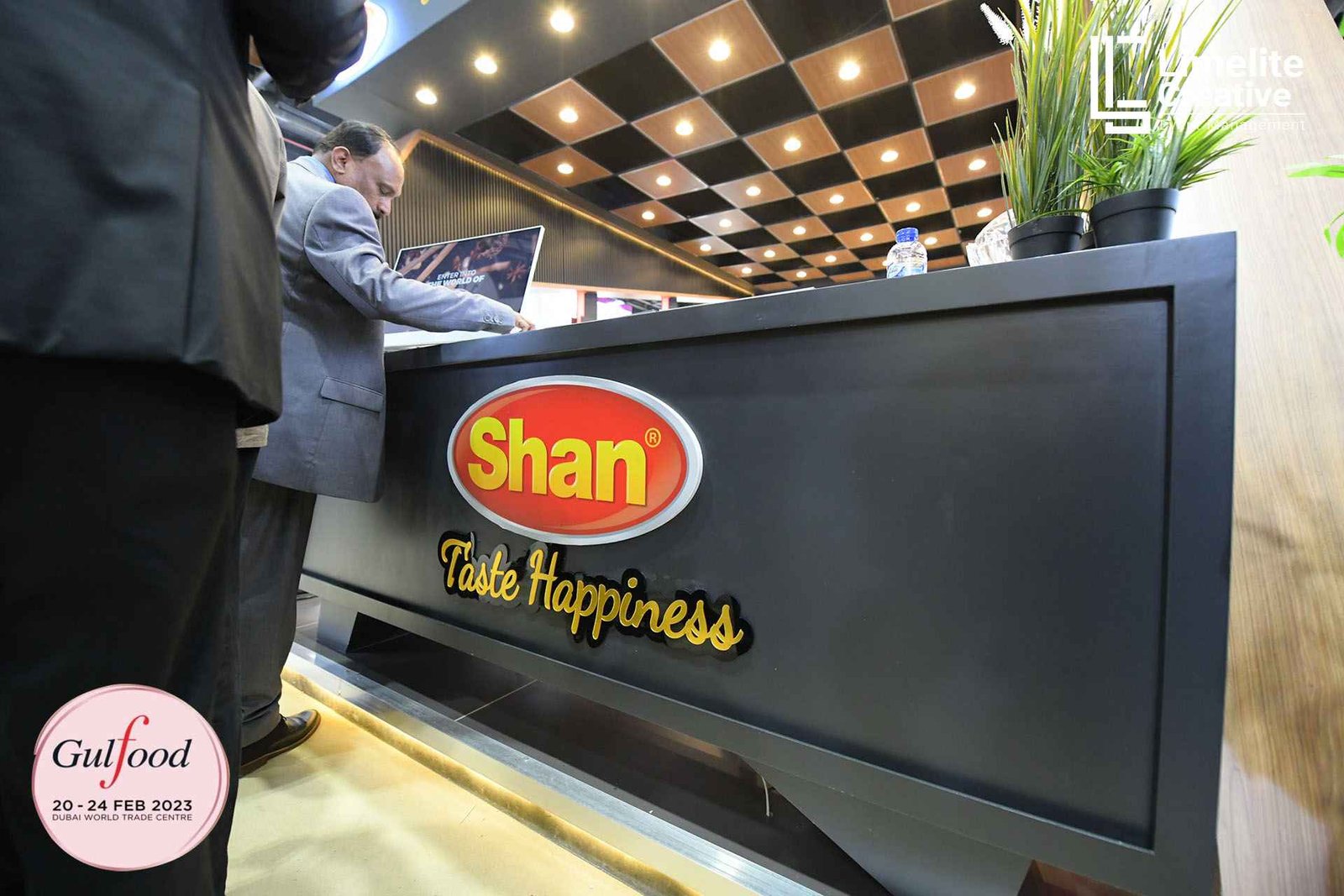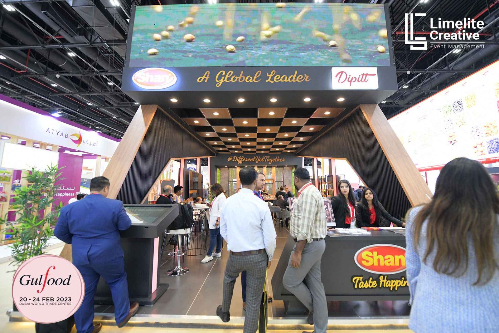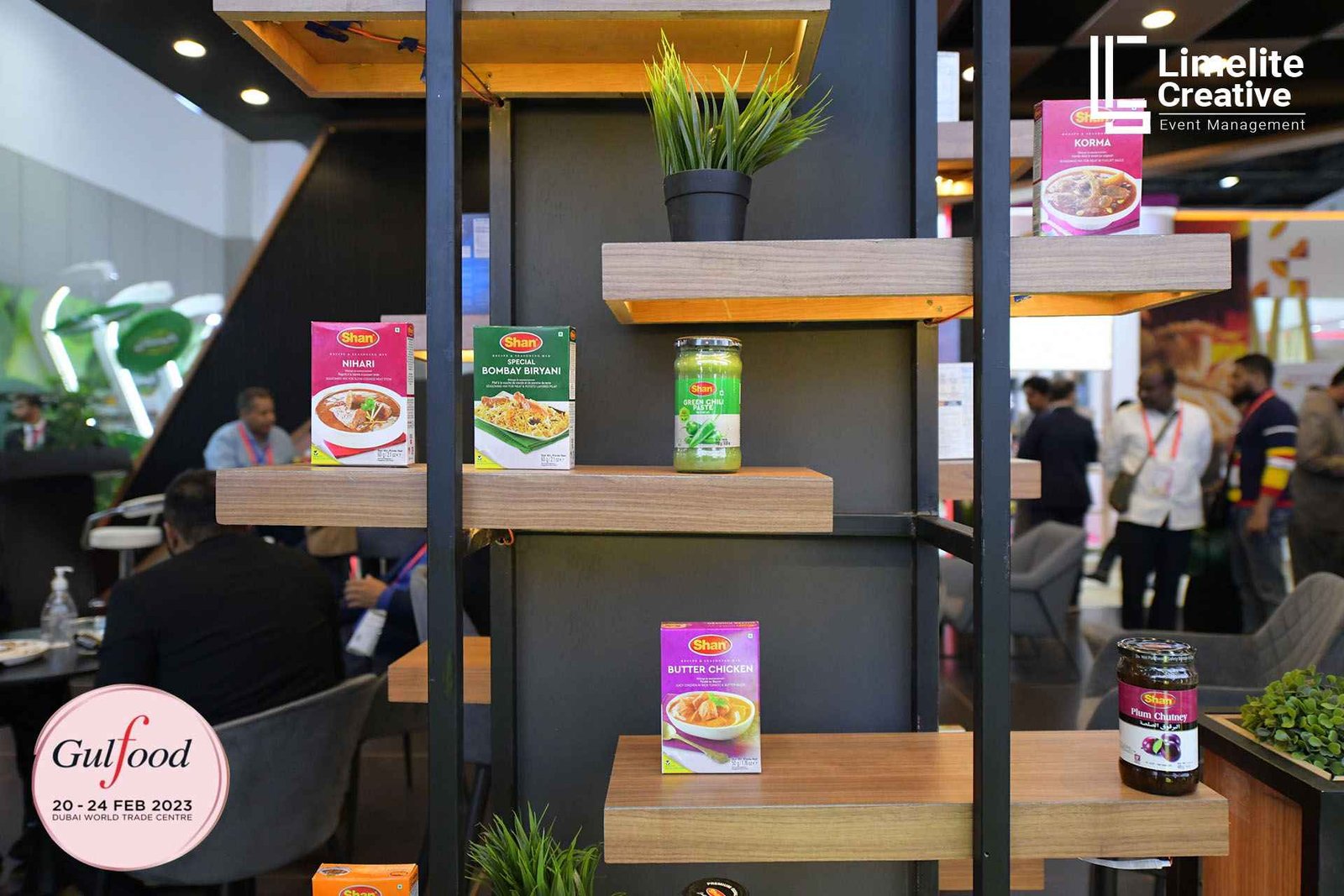 A spacious 14m x 6m booth for Shan Foods at Gulfood 2023, designed with premium branding, vibrant product displays, and an inviting layout to highlight their diverse food range and attract global visitors.
