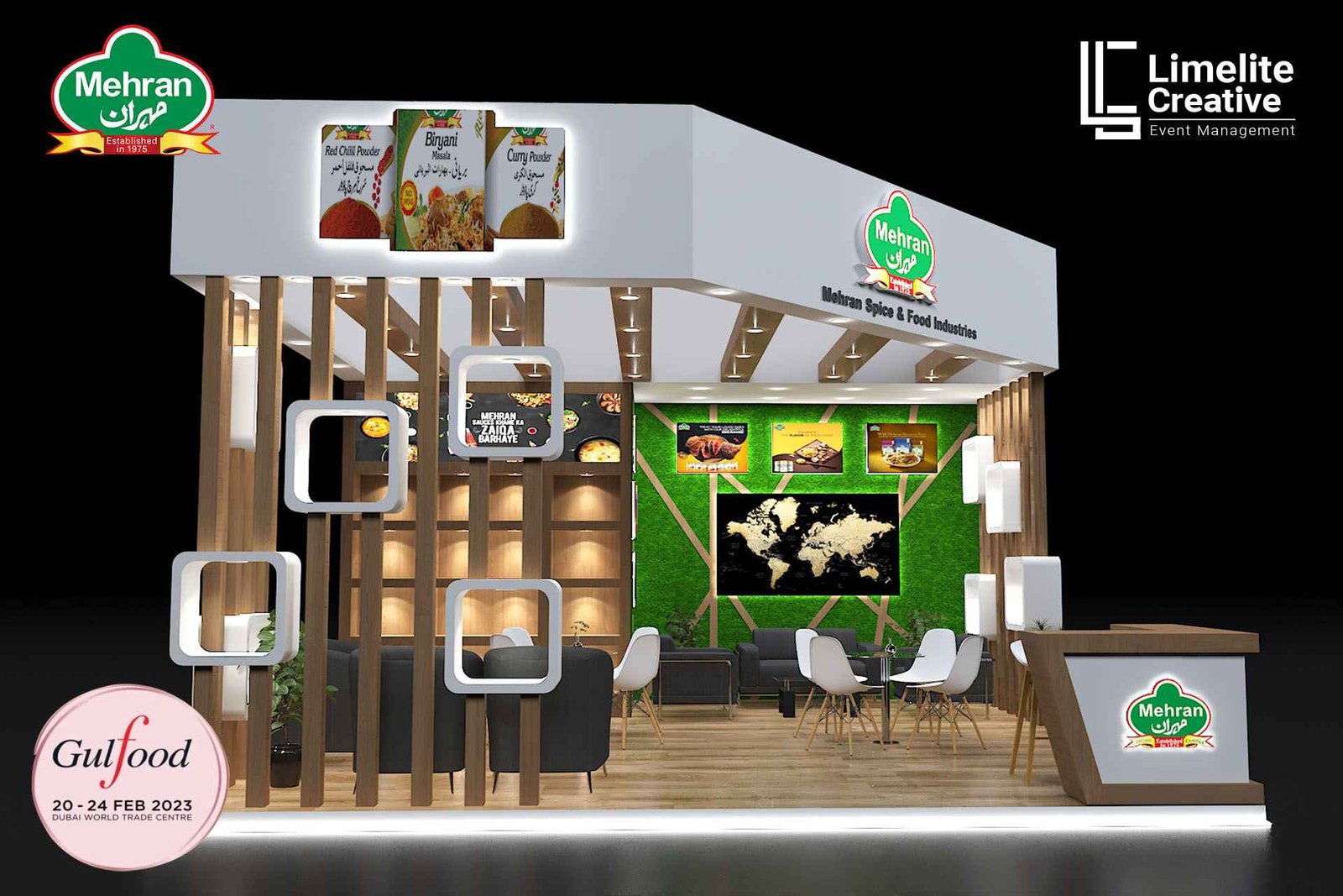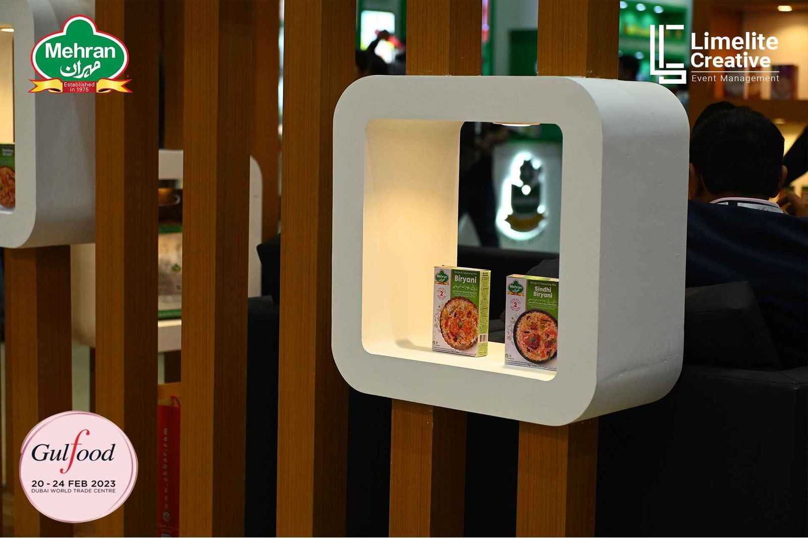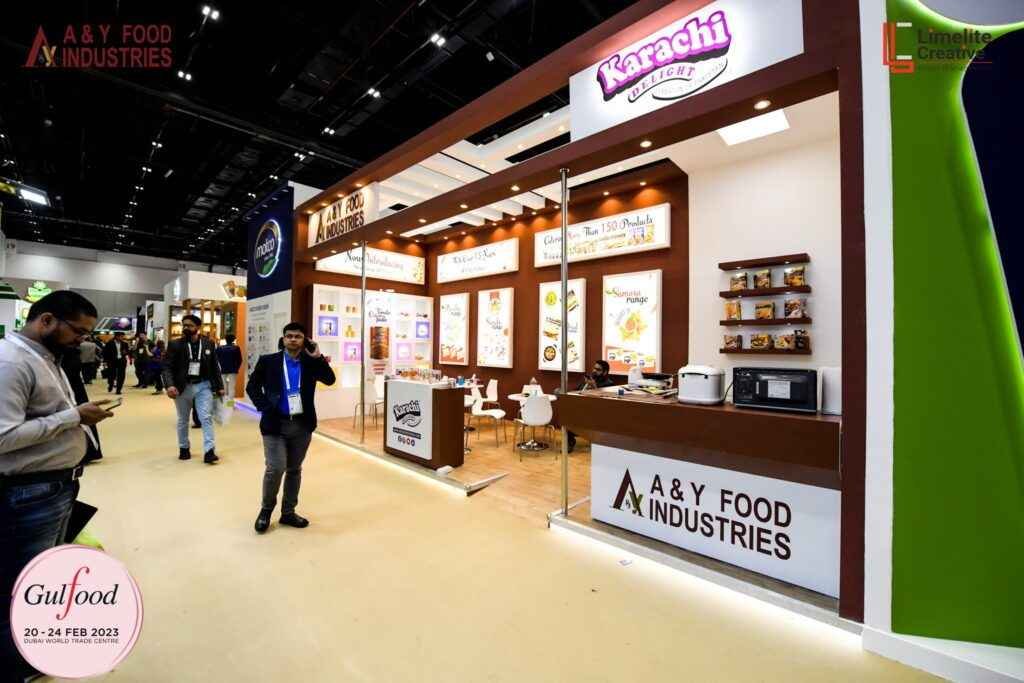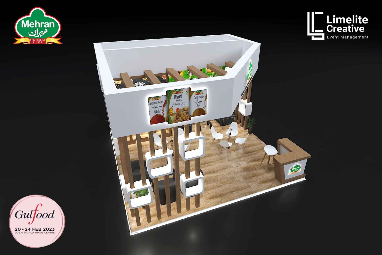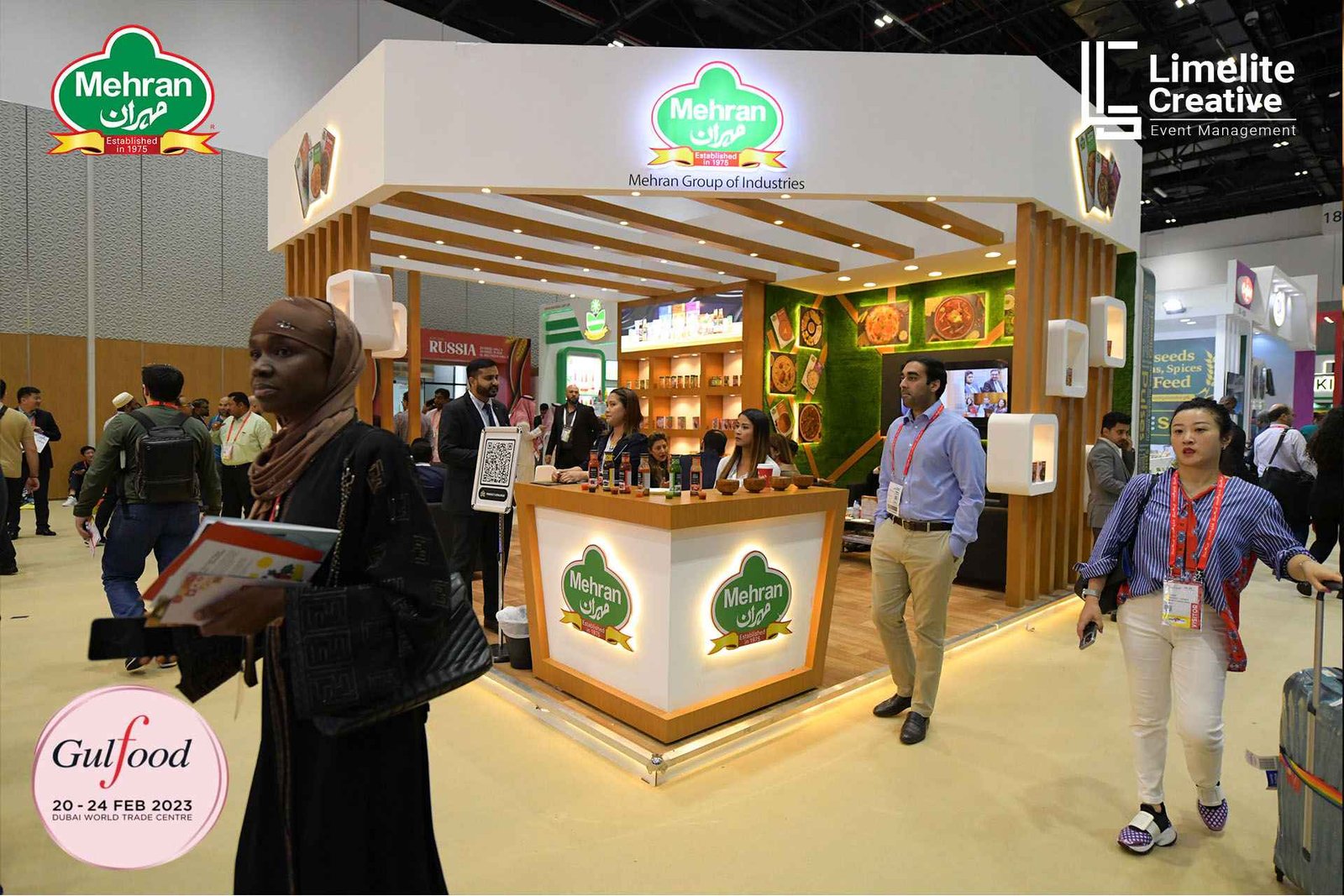 A spacious 14m x 6m booth for Shan Foods at Gulfood 2023, designed with premium branding, vibrant product displays, and an inviting layout to highlight their diverse food range and attract global visitors.
