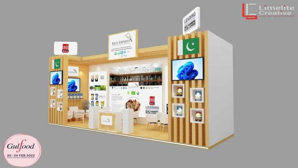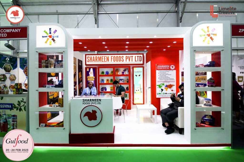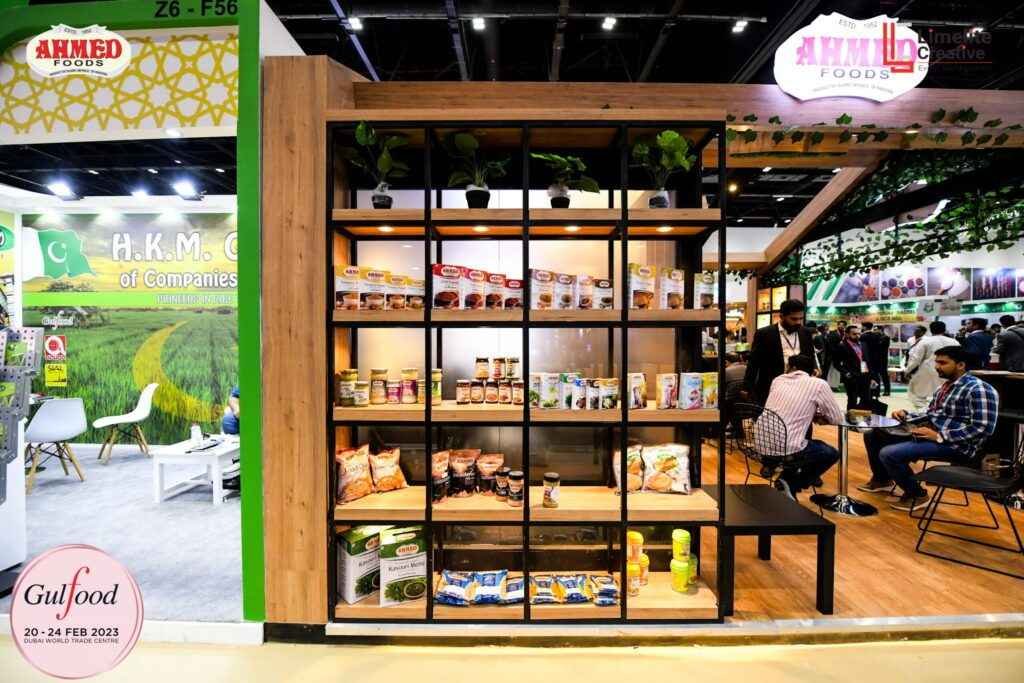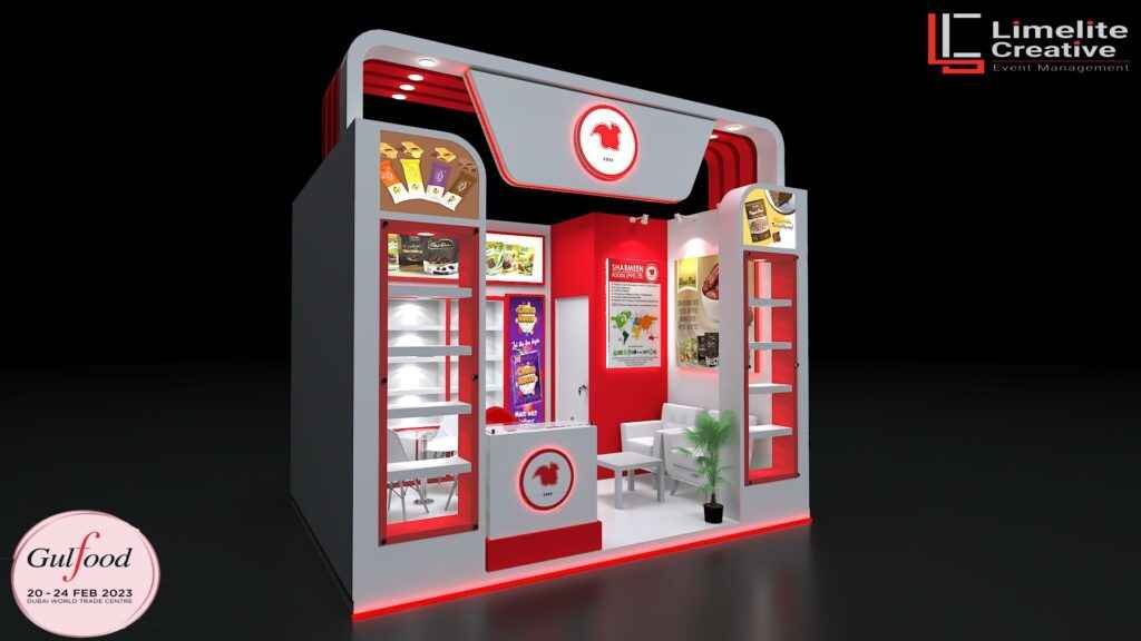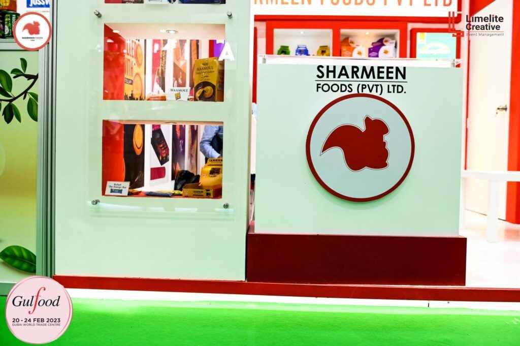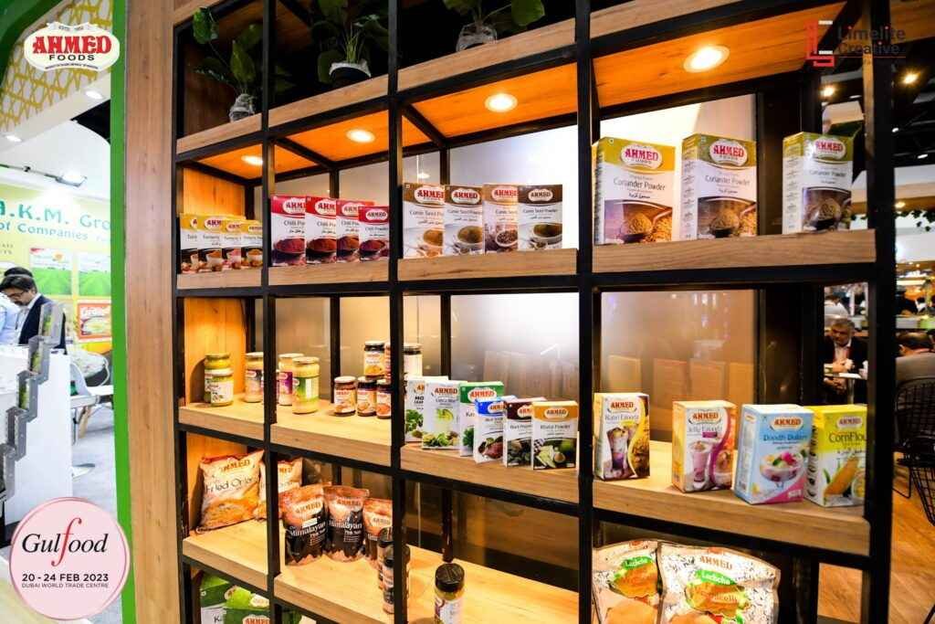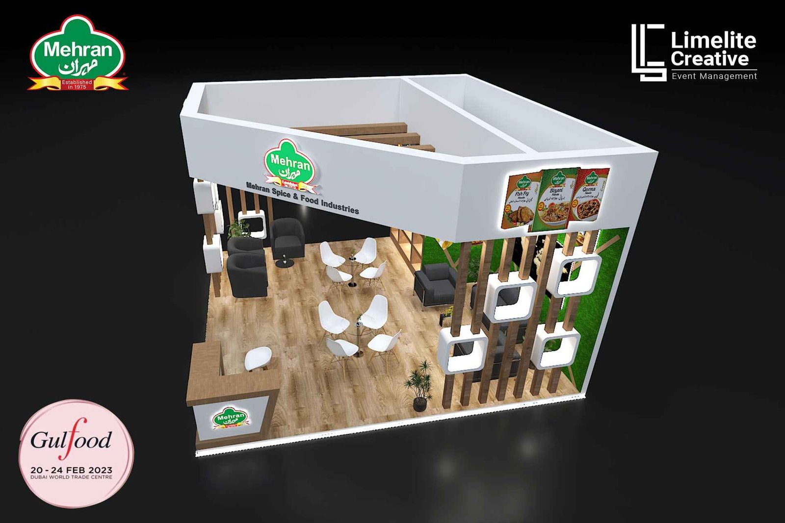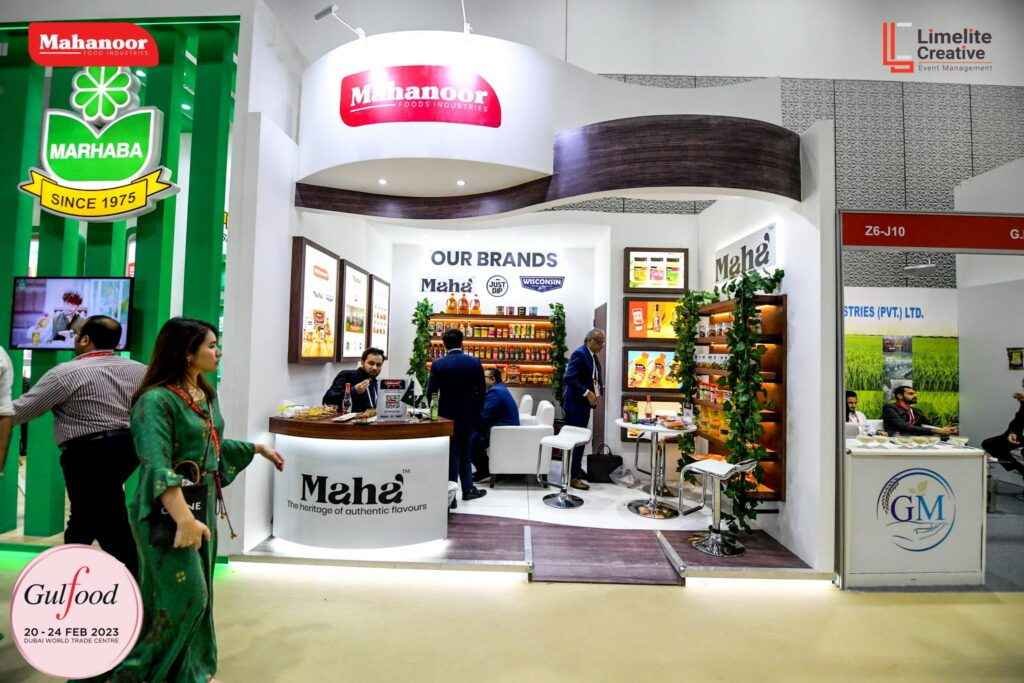 A spacious 14m x 6m booth for Shan Foods at Gulfood 2023, designed with premium branding, vibrant product displays, and an inviting layout to highlight their diverse food range and attract global visitors.
