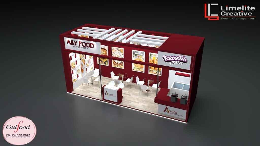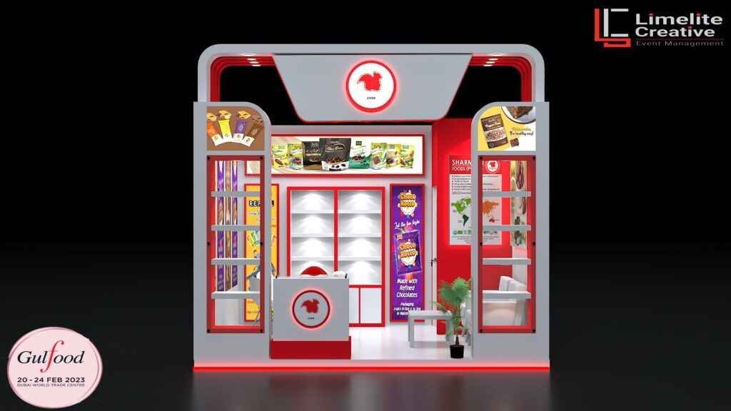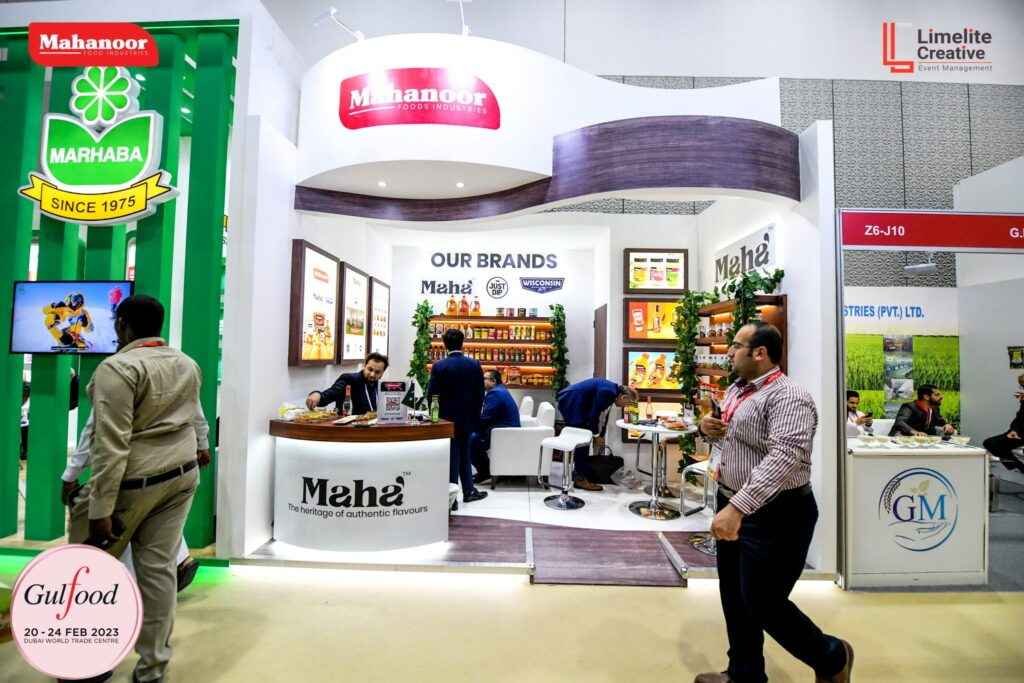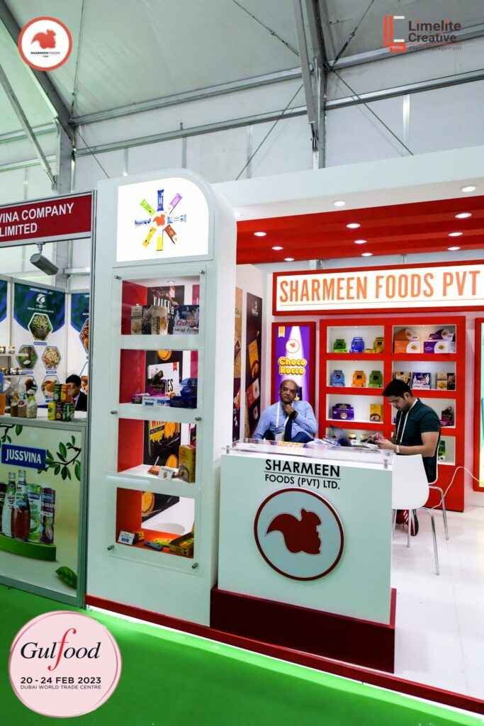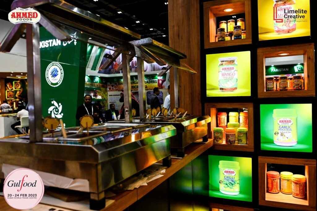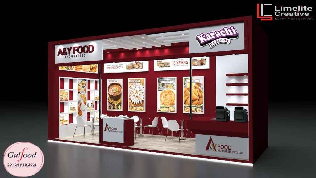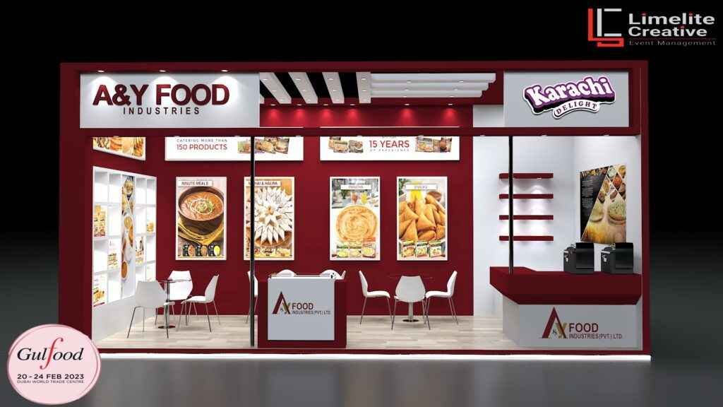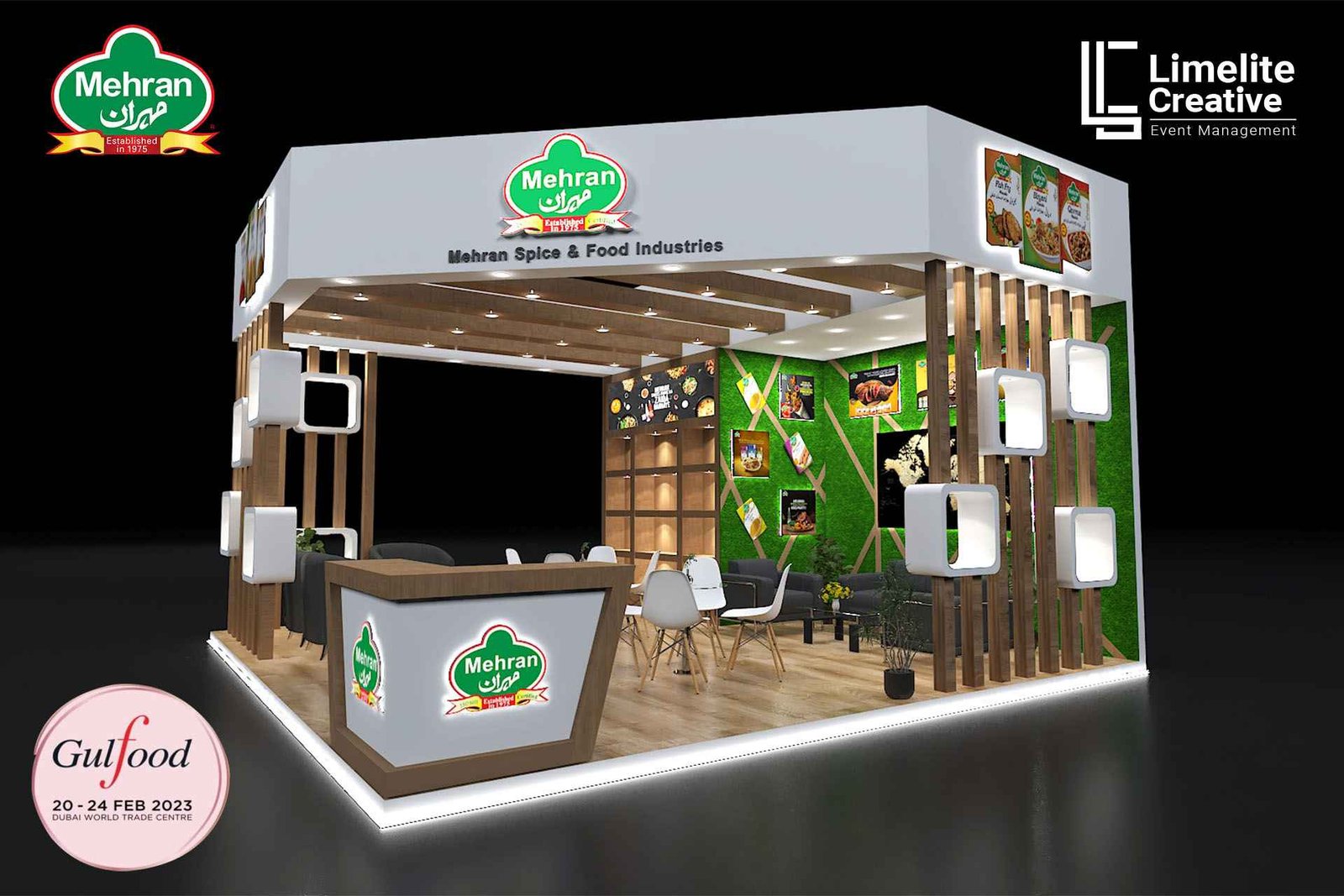 A spacious 14m x 6m booth for Shan Foods at Gulfood 2023, designed with premium branding, vibrant product displays, and an inviting layout to highlight their diverse food range and attract global visitors.