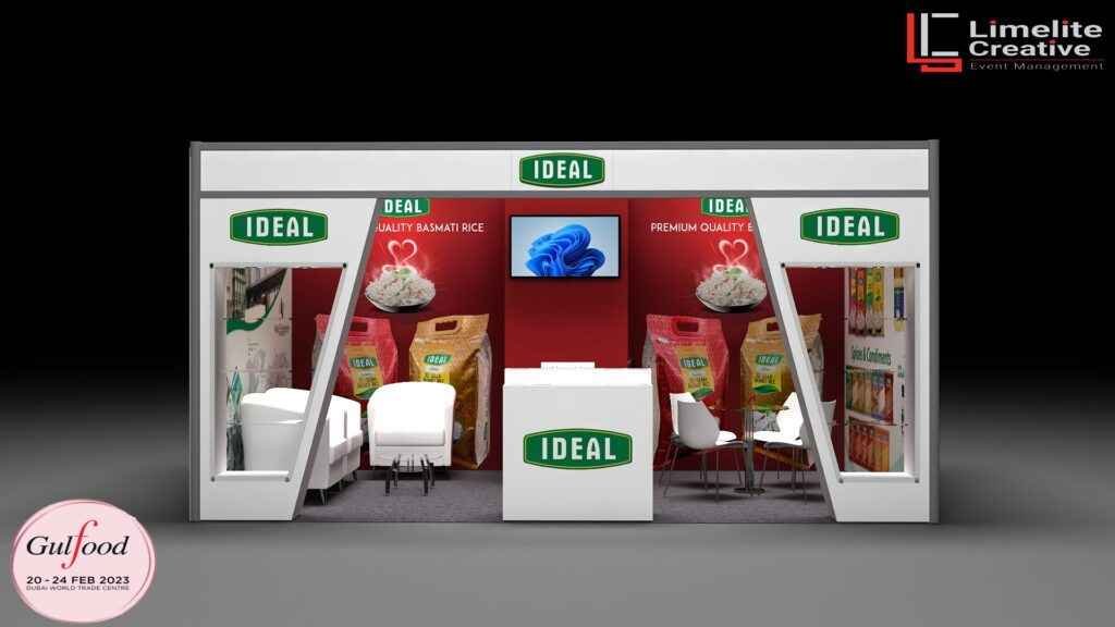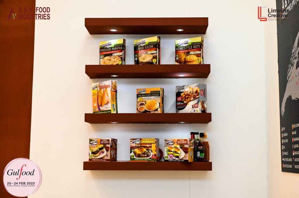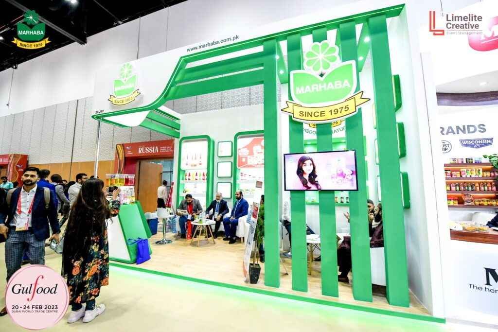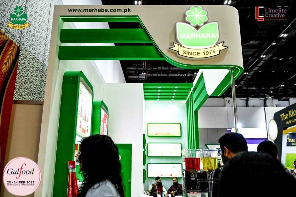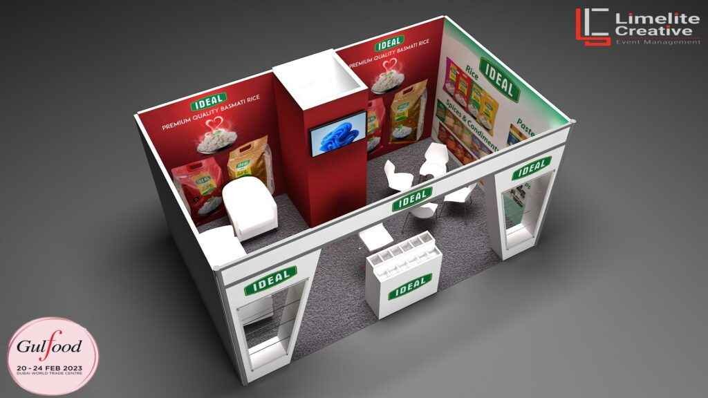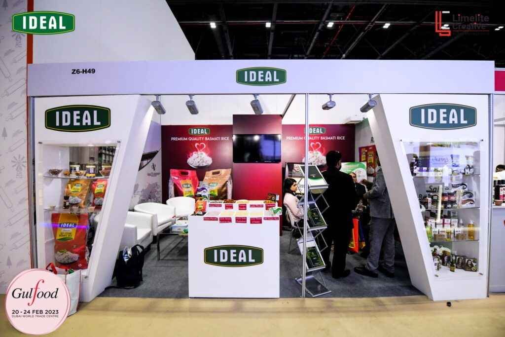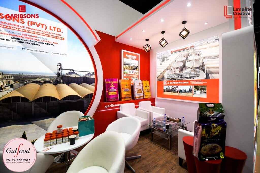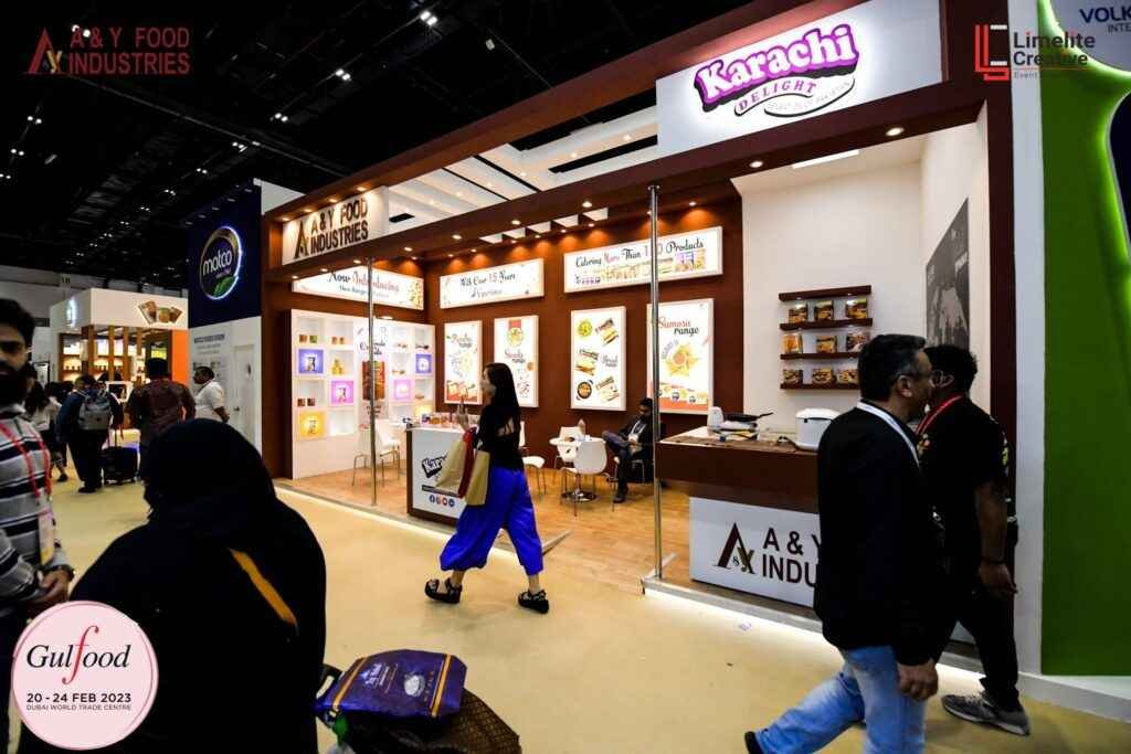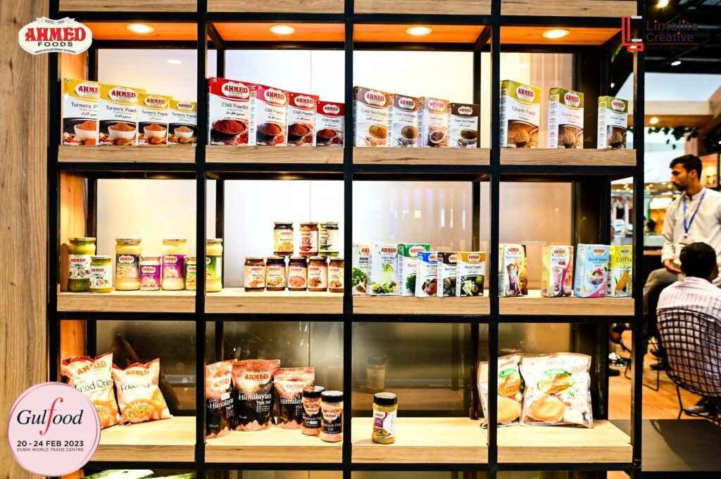 A spacious 14m x 6m booth for Shan Foods at Gulfood 2023, designed with premium branding, vibrant product displays, and an inviting layout to highlight their diverse food range and attract global visitors.