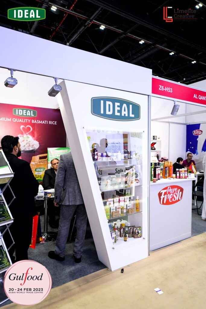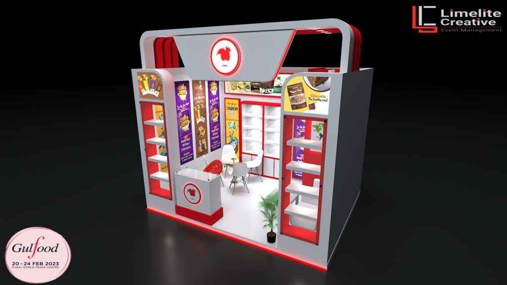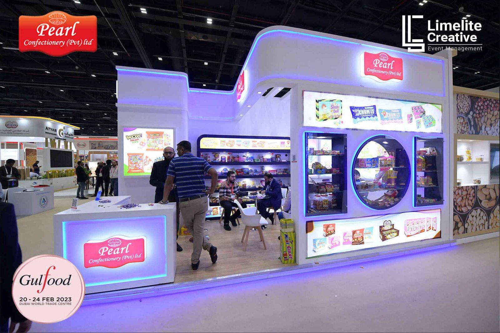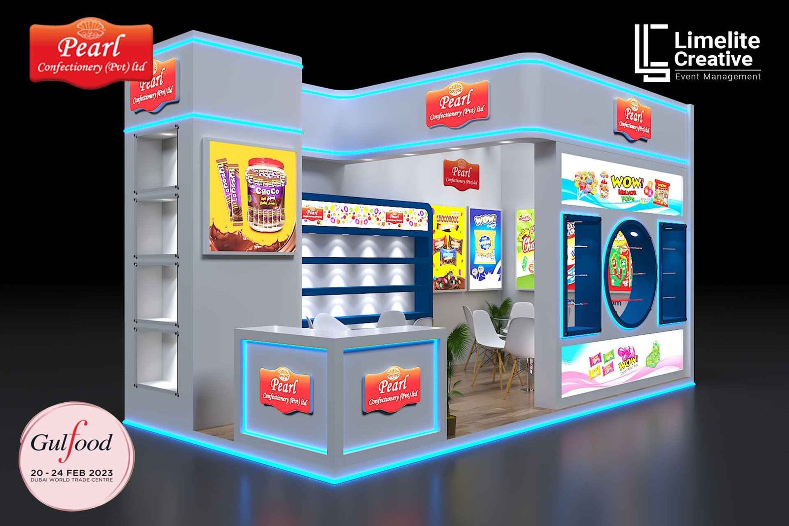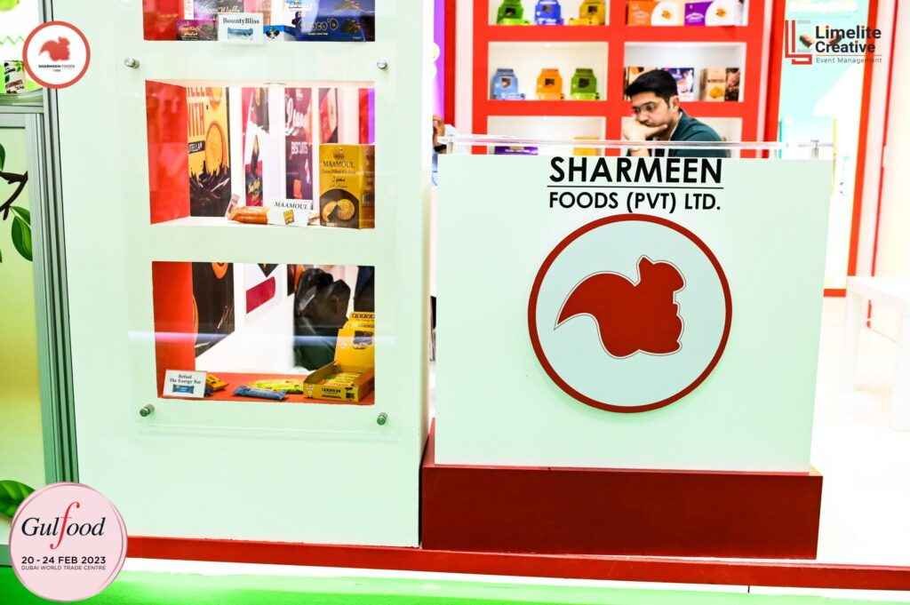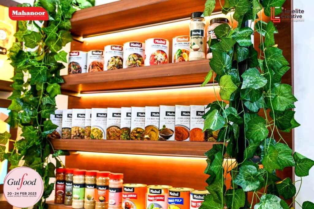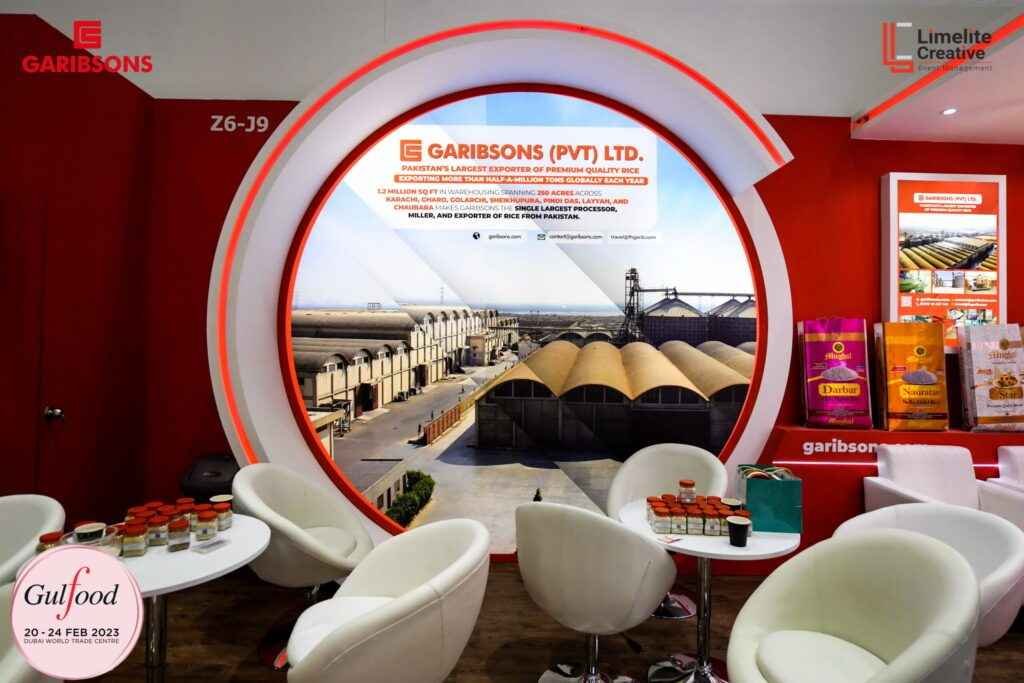 A spacious 14m x 6m booth for Shan Foods at Gulfood 2023, designed with premium branding, vibrant product displays, and an inviting layout to highlight their diverse food range and attract global visitors.