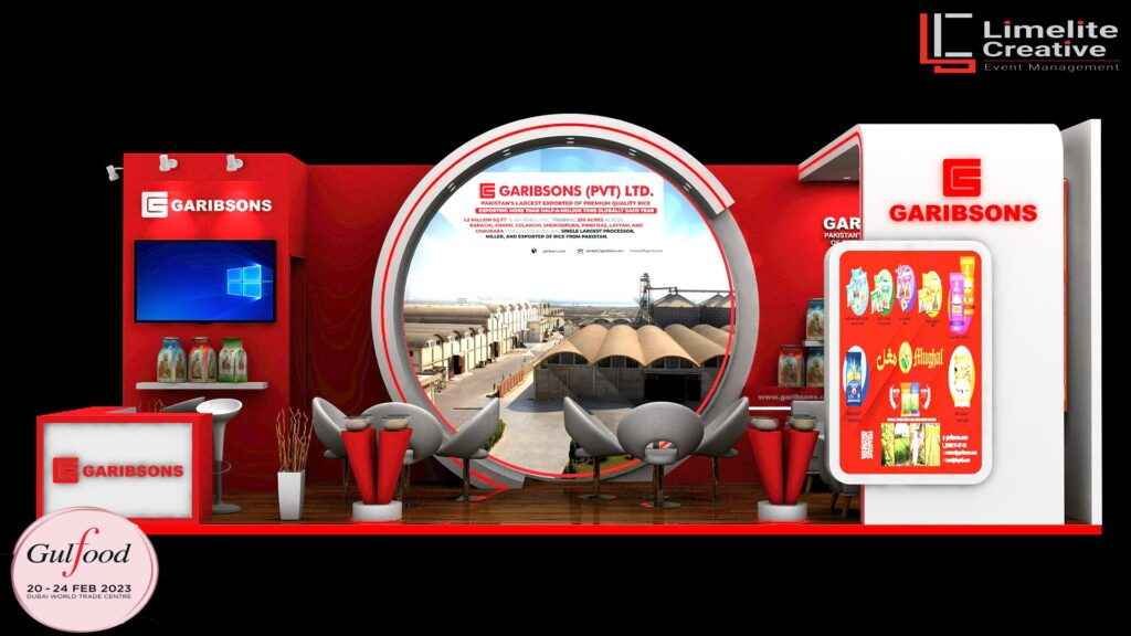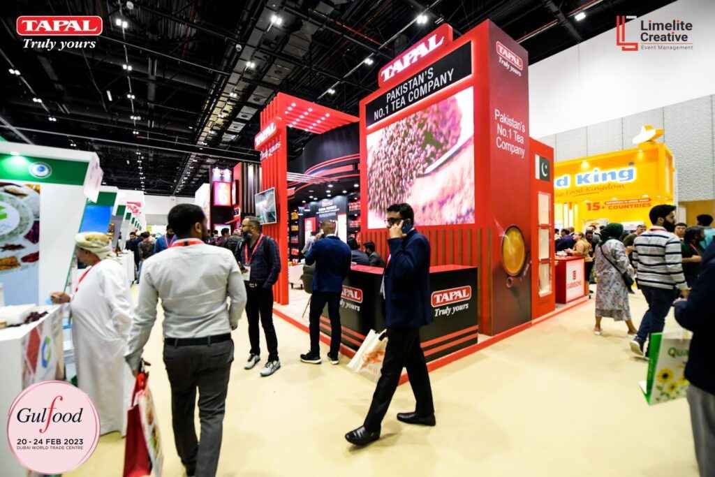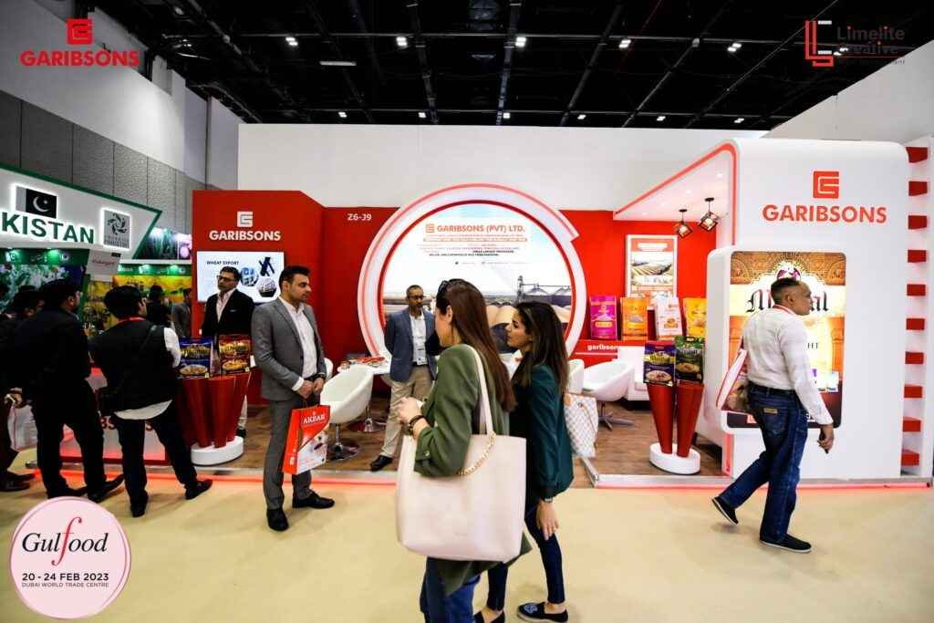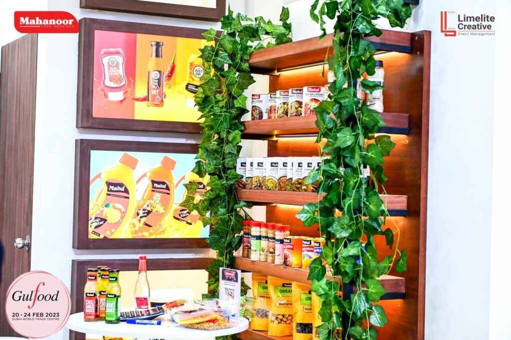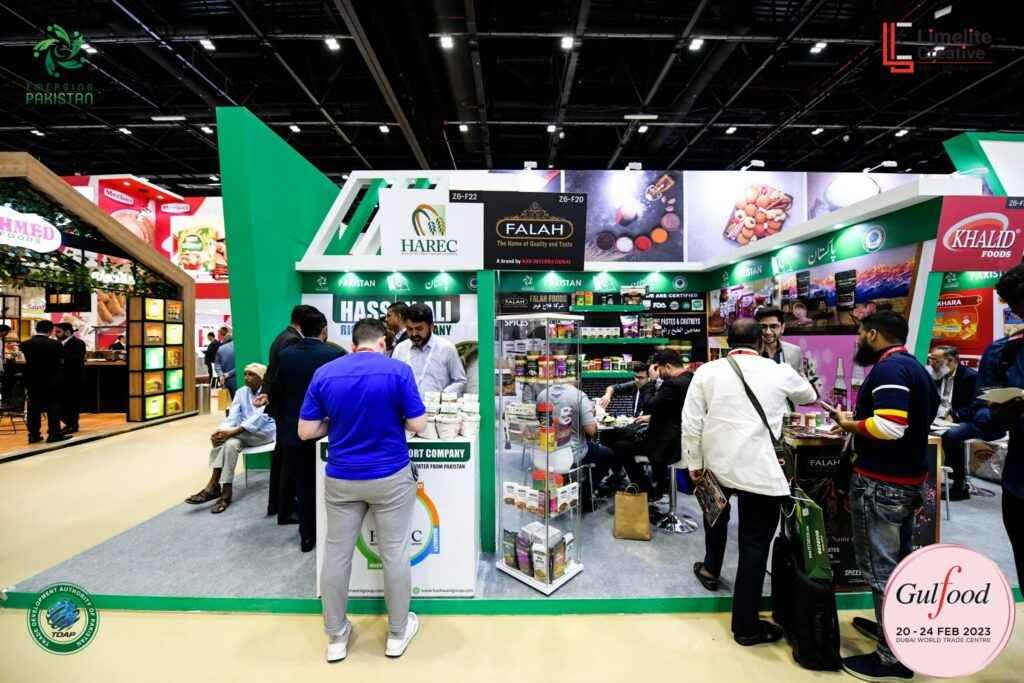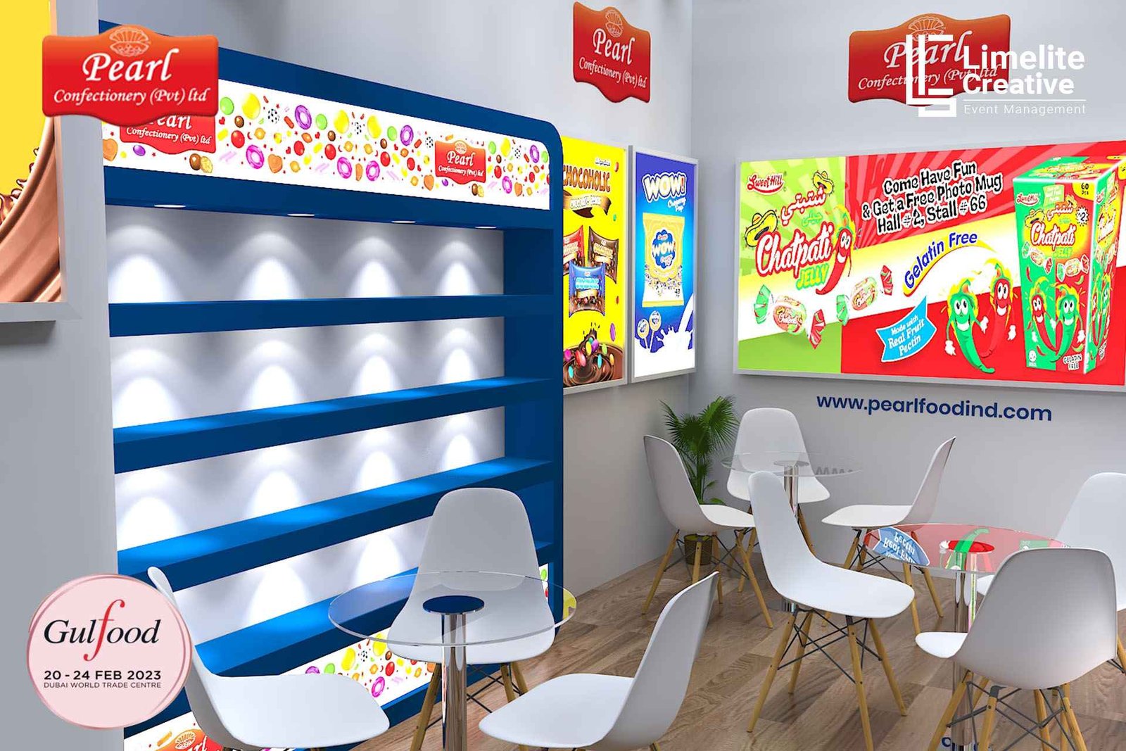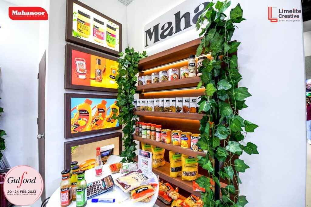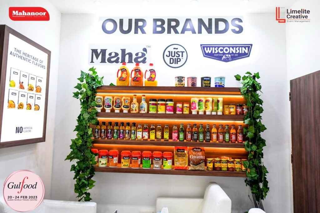 A spacious 14m x 6m booth for Shan Foods at Gulfood 2023, designed with premium branding, vibrant product displays, and an inviting layout to highlight their diverse food range and attract global visitors.