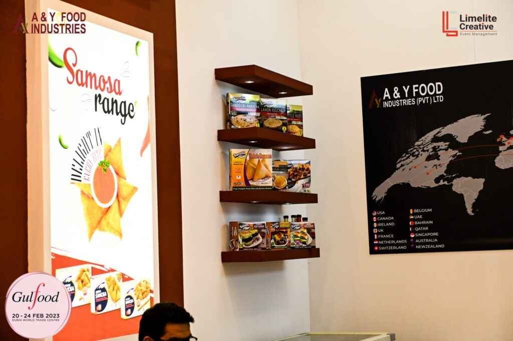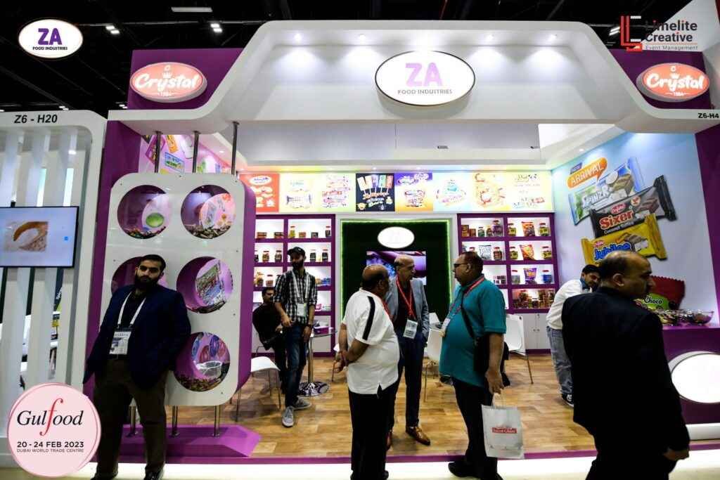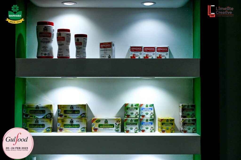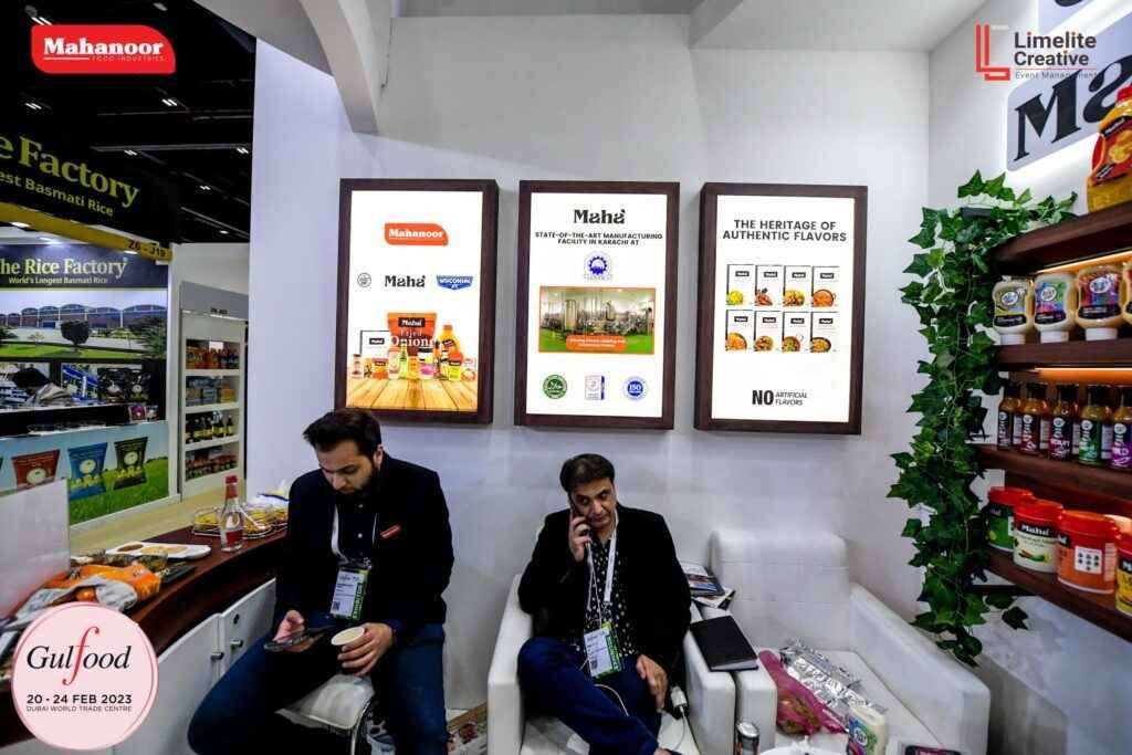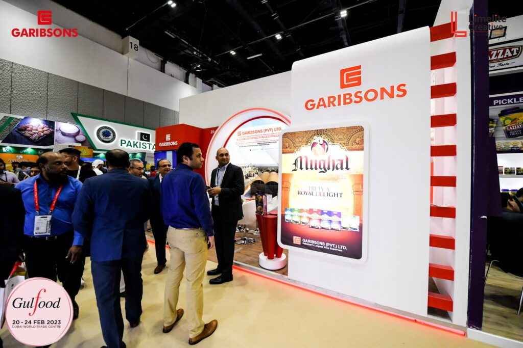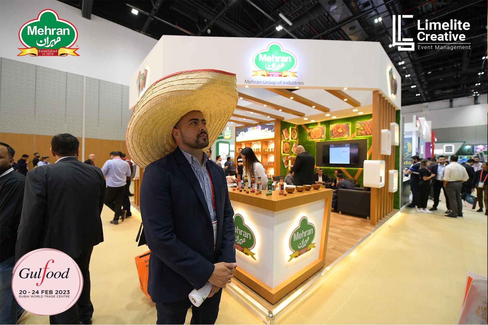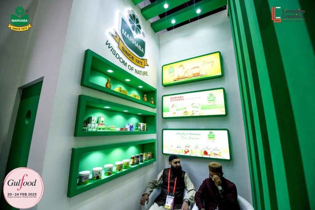 A spacious 14m x 6m booth for Shan Foods at Gulfood 2023, designed with premium branding, vibrant product displays, and an inviting layout to highlight their diverse food range and attract global visitors.