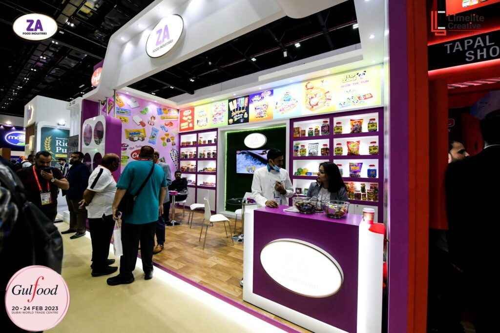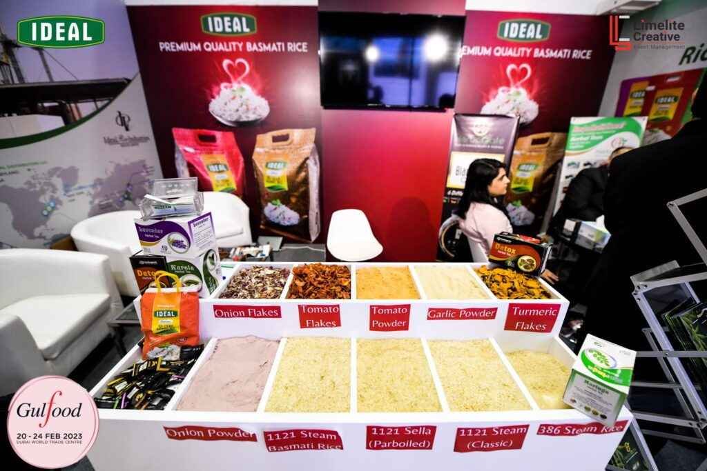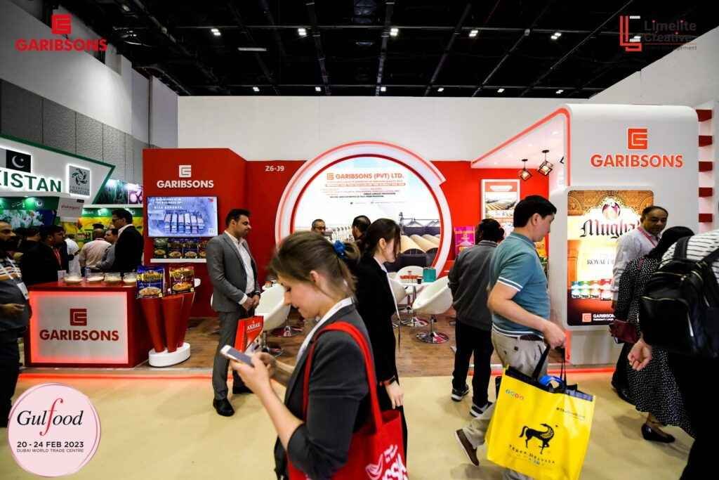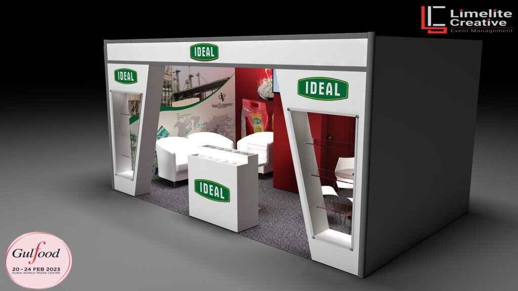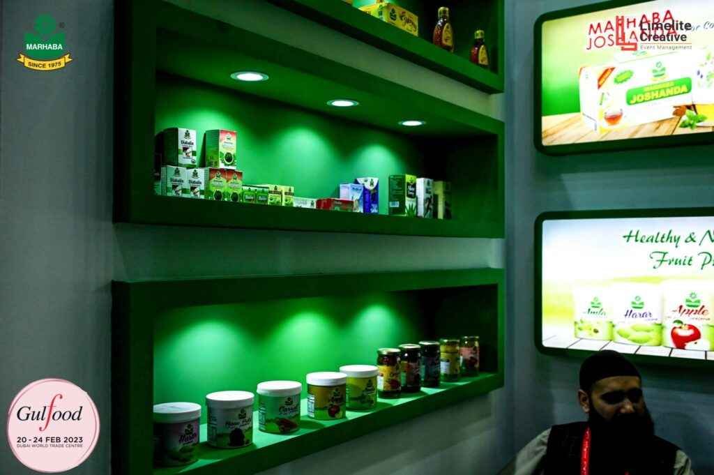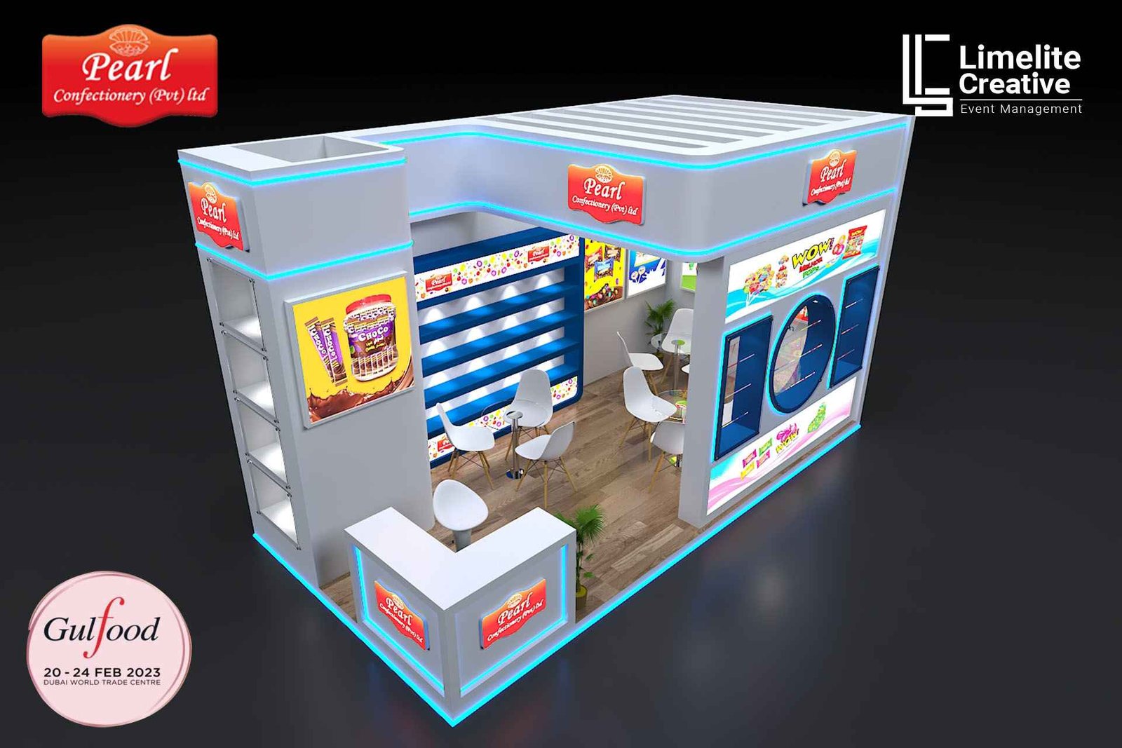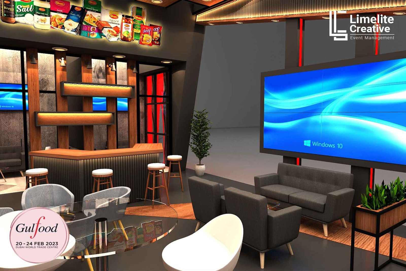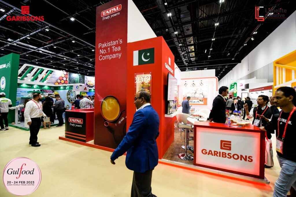 A spacious 14m x 6m booth for Shan Foods at Gulfood 2023, designed with premium branding, vibrant product displays, and an inviting layout to highlight their diverse food range and attract global visitors.