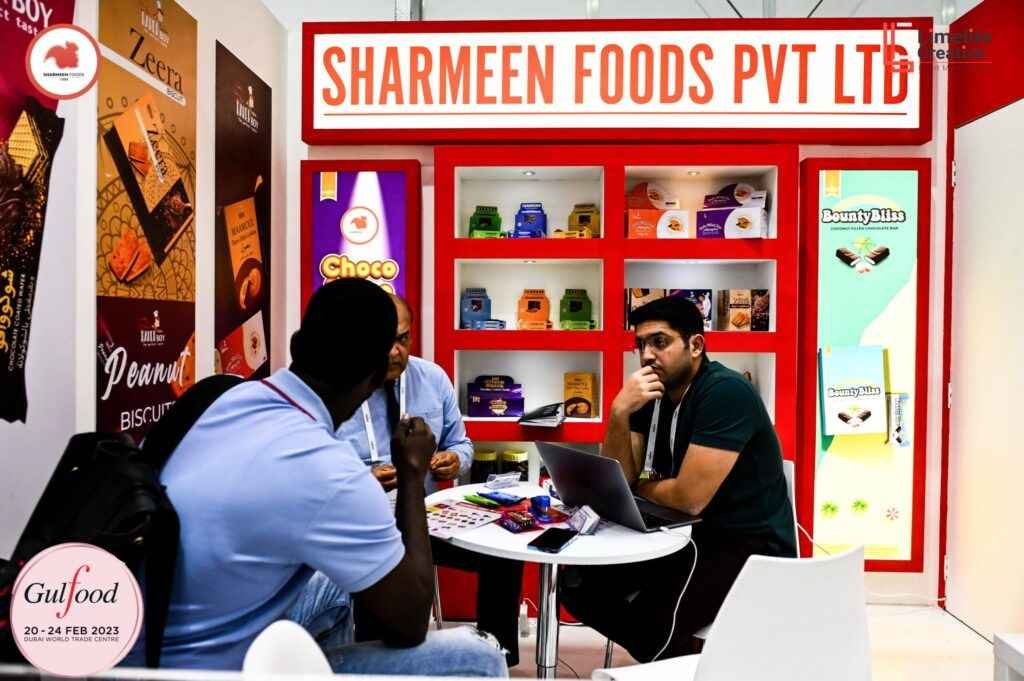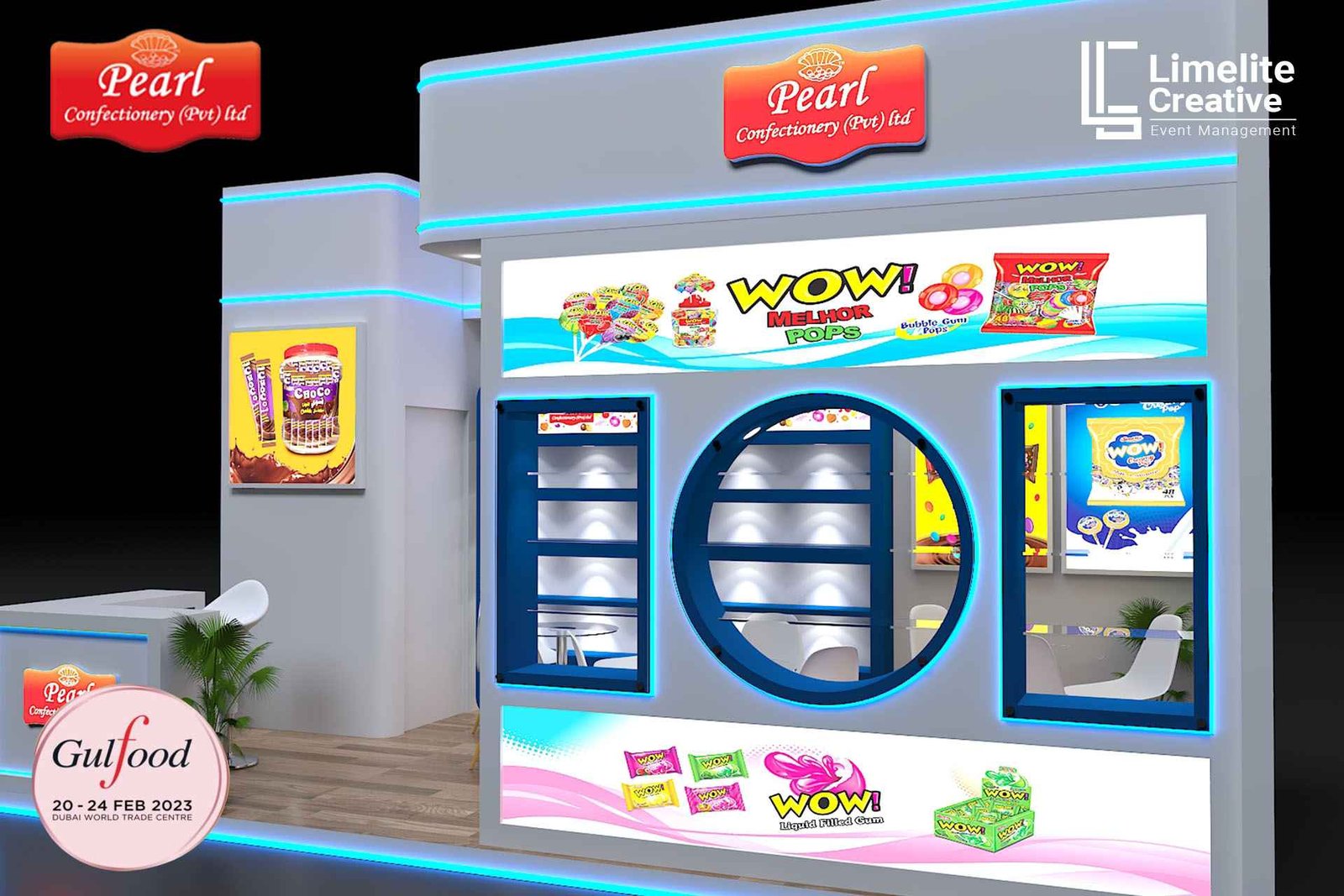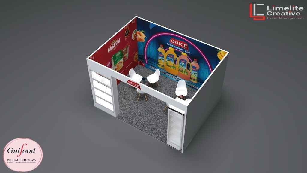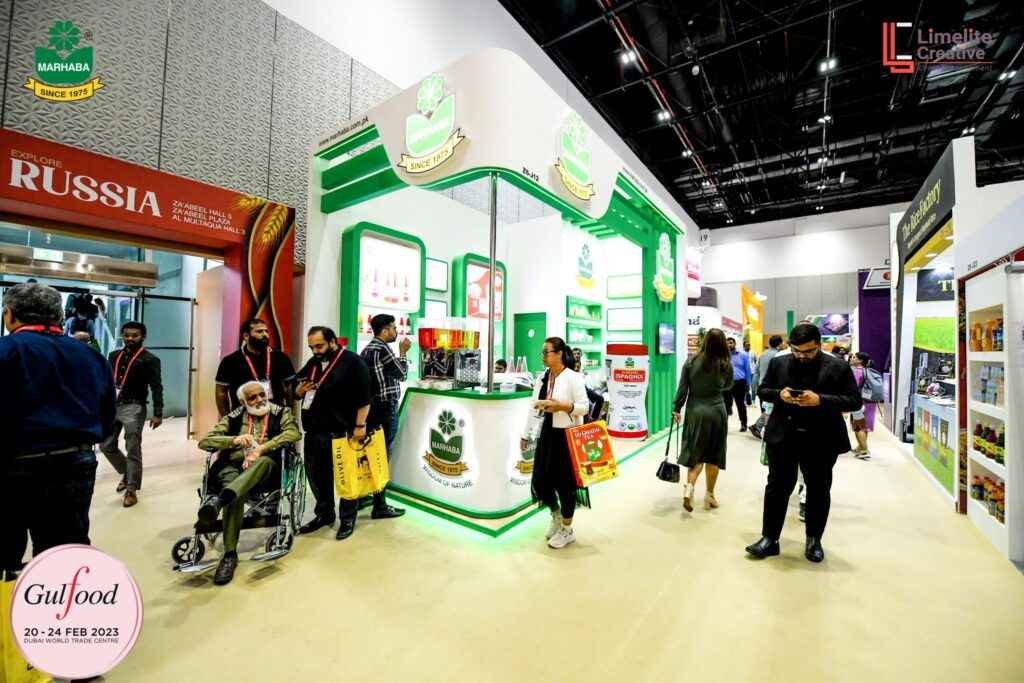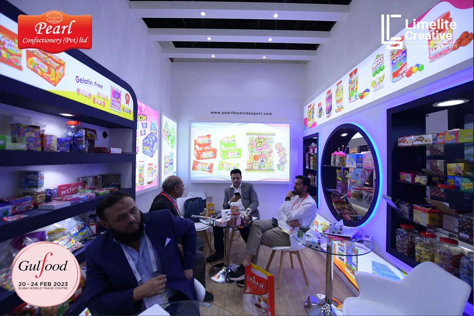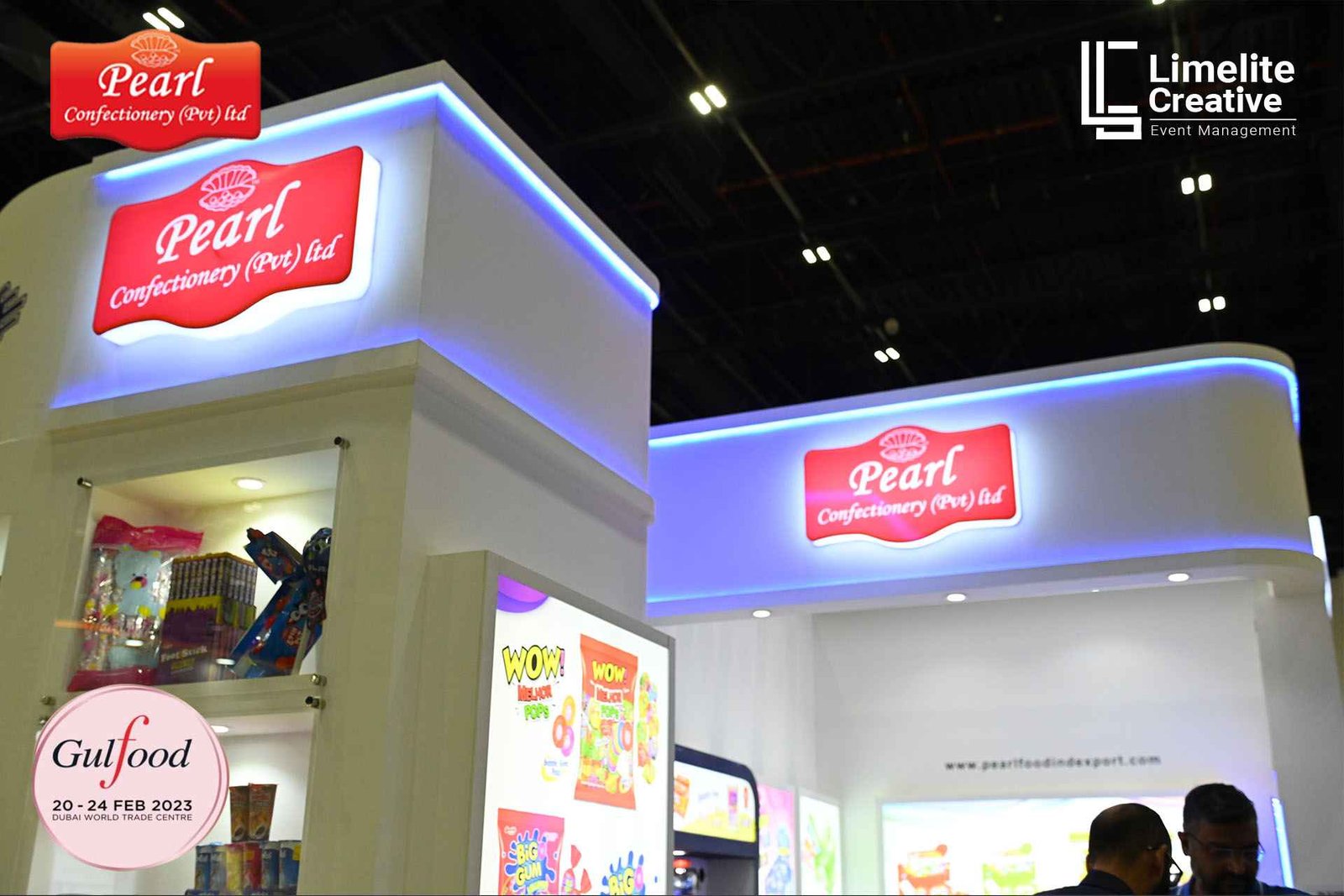 A spacious 14m x 6m booth for Shan Foods at Gulfood 2023, designed with premium branding, vibrant product displays, and an inviting layout to highlight their diverse food range and attract global visitors.