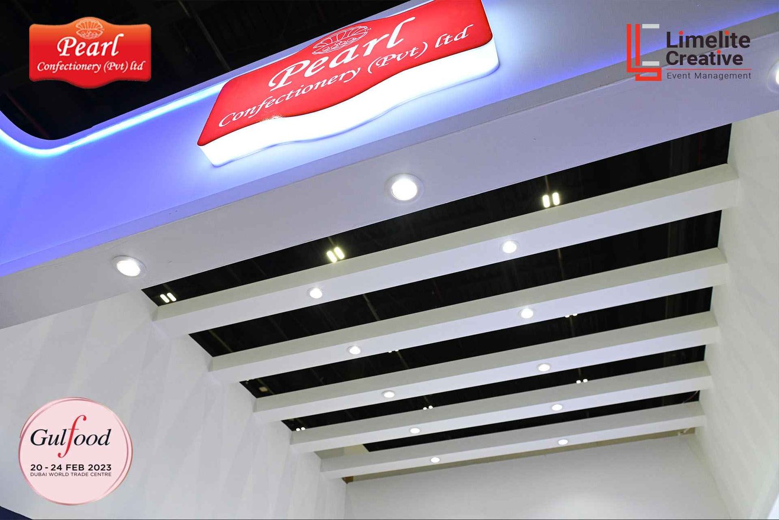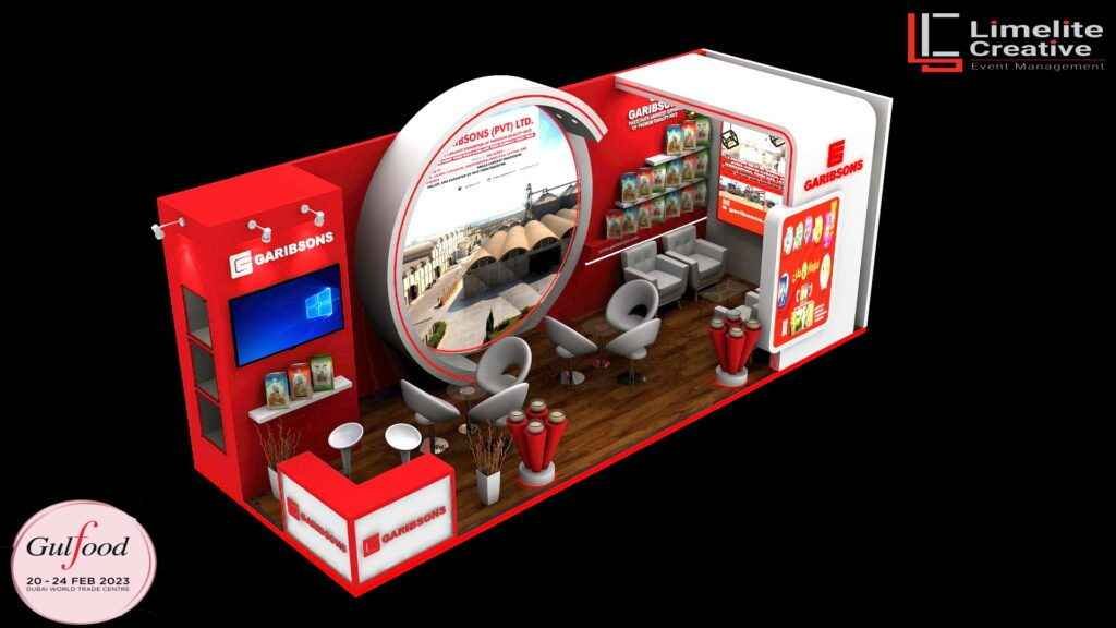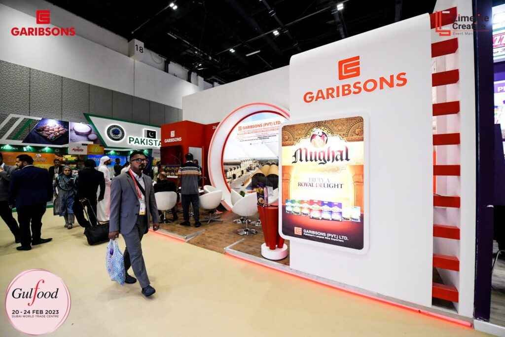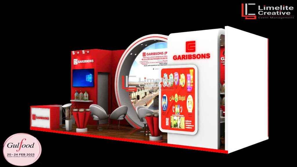 Garib Sons stall size was 8mX3m having total area of 24 squares meter. The design looked simple & beautiful with nicely lighted logos on counter & back wall along with backlit boards.