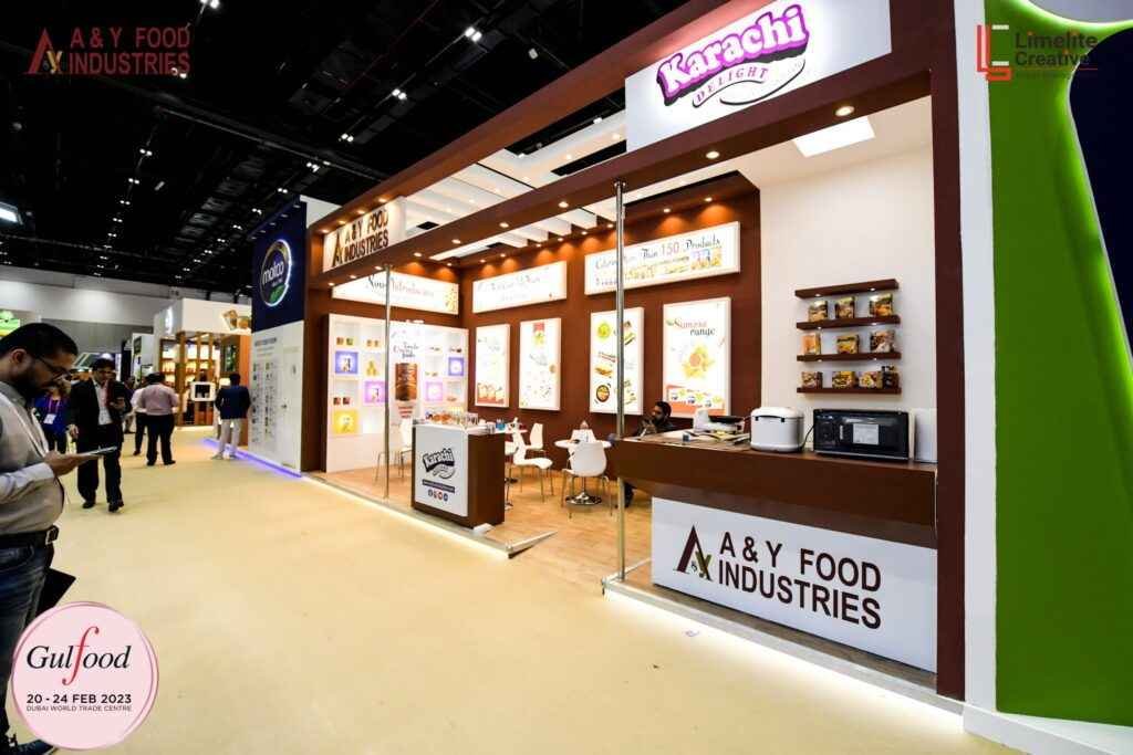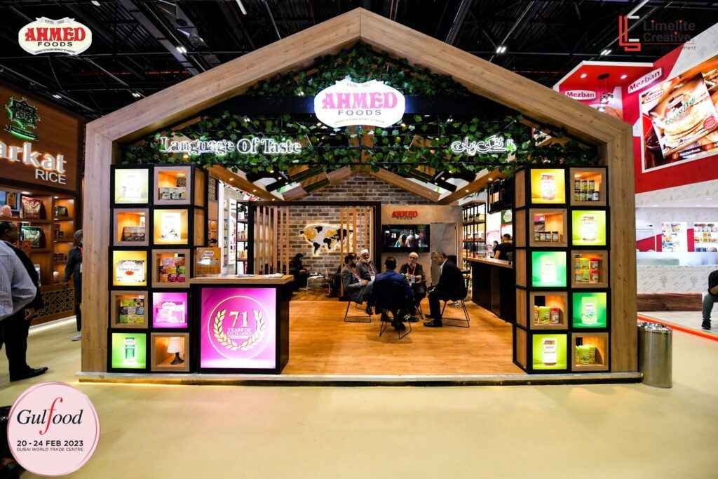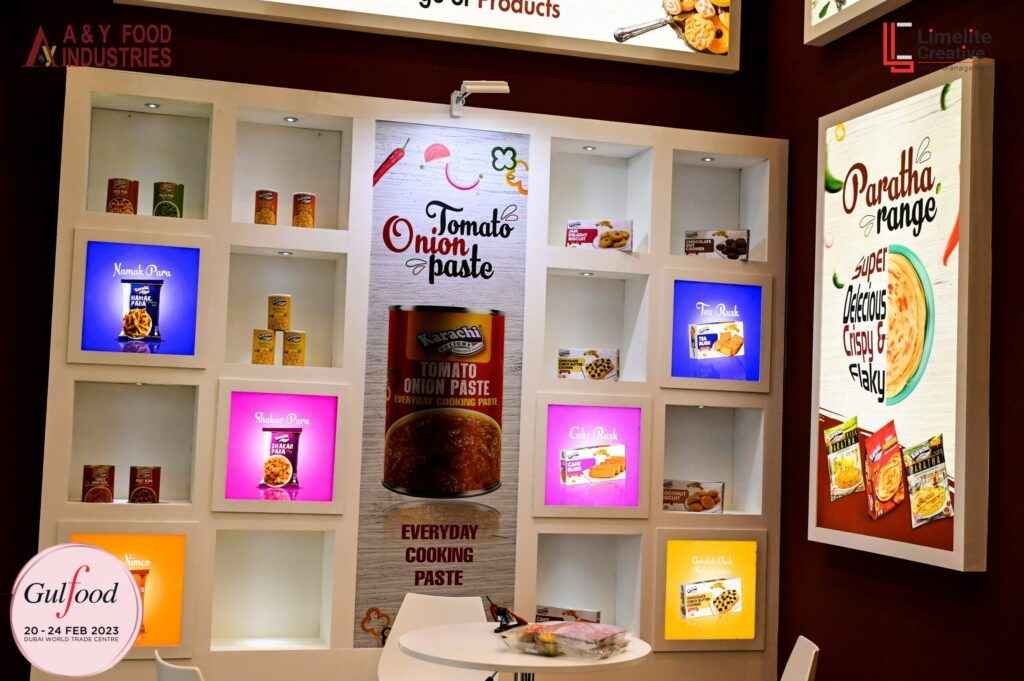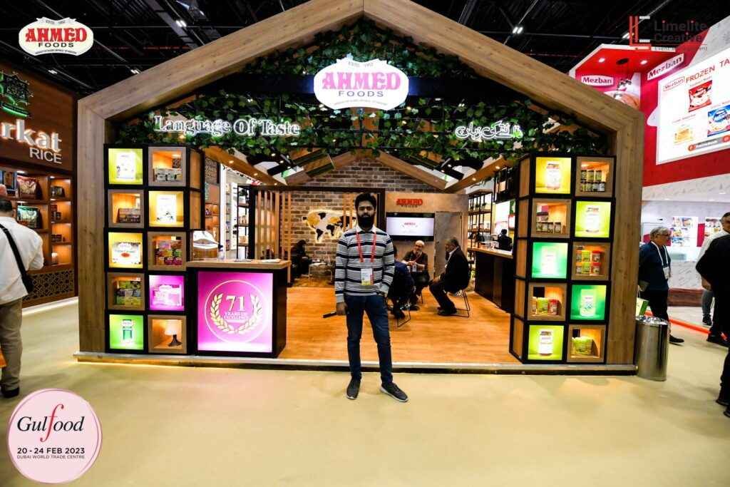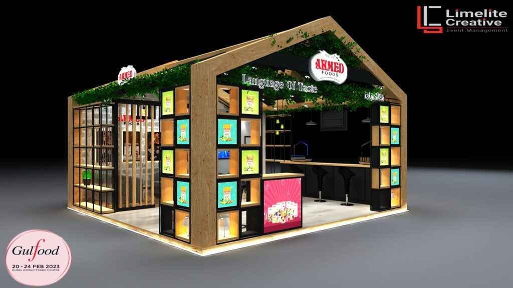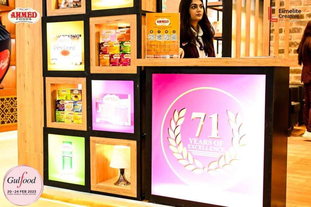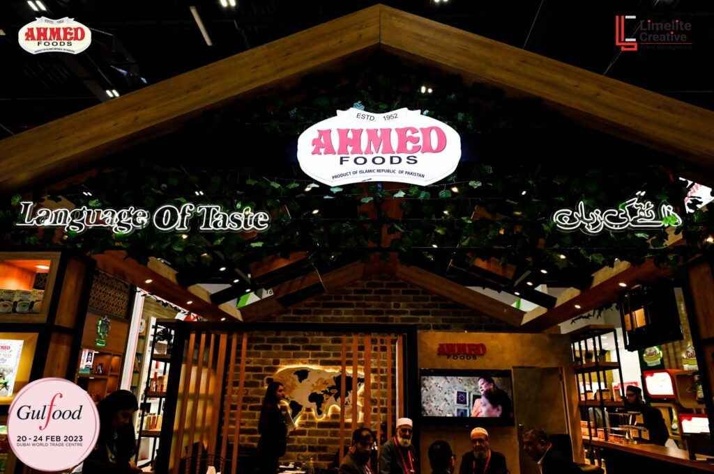 Ahmed Foods stall size was 6mX6m having total area of 36 squares meter. The design looked simple & beautiful with nicely lighted logos on counter & back wall along with backlit boards.