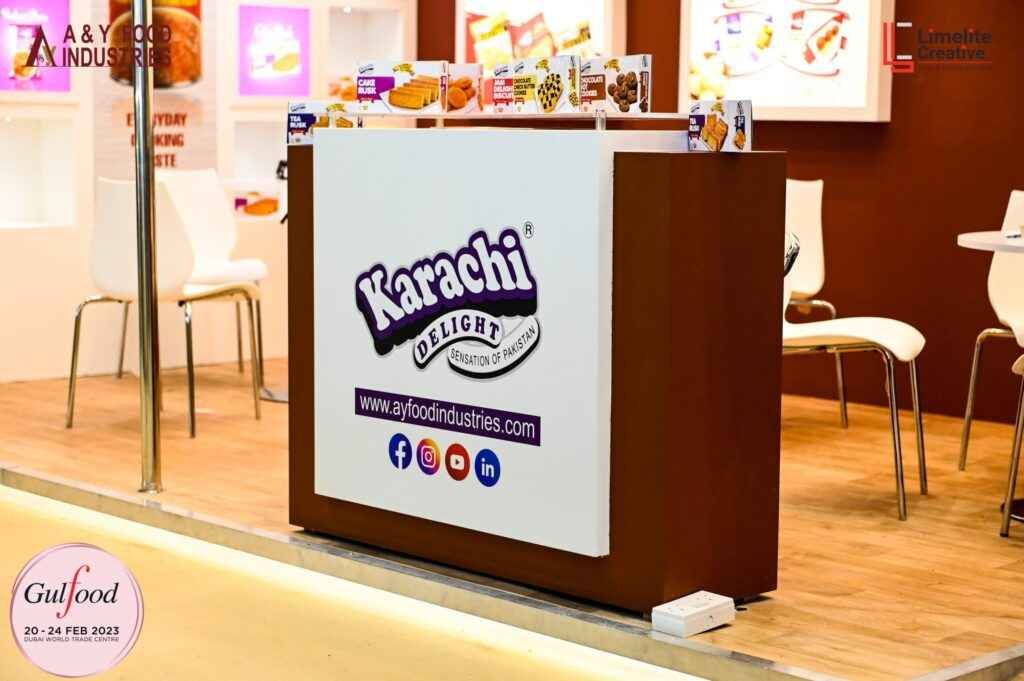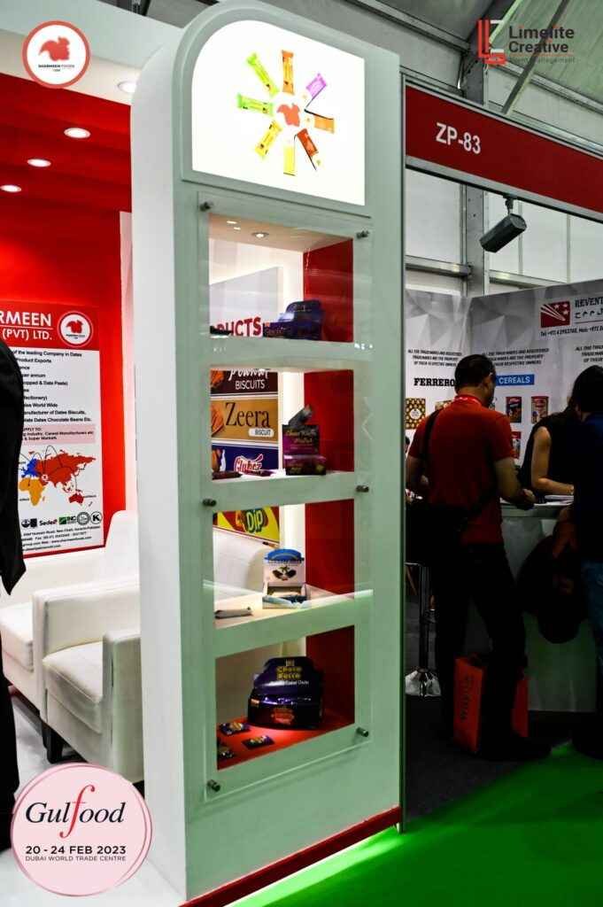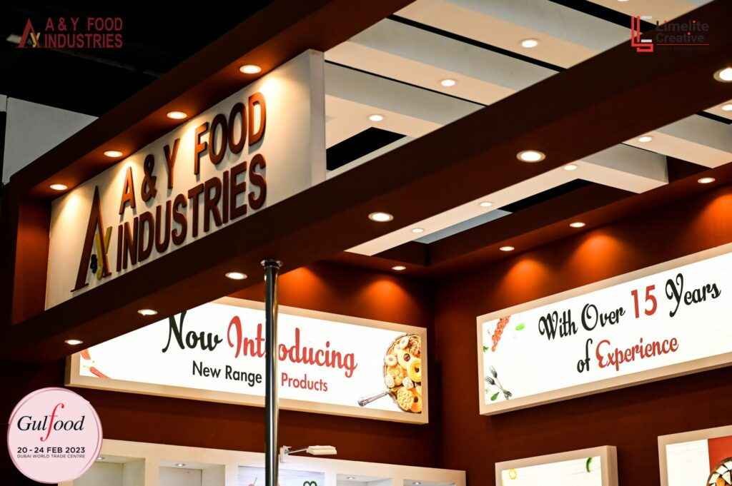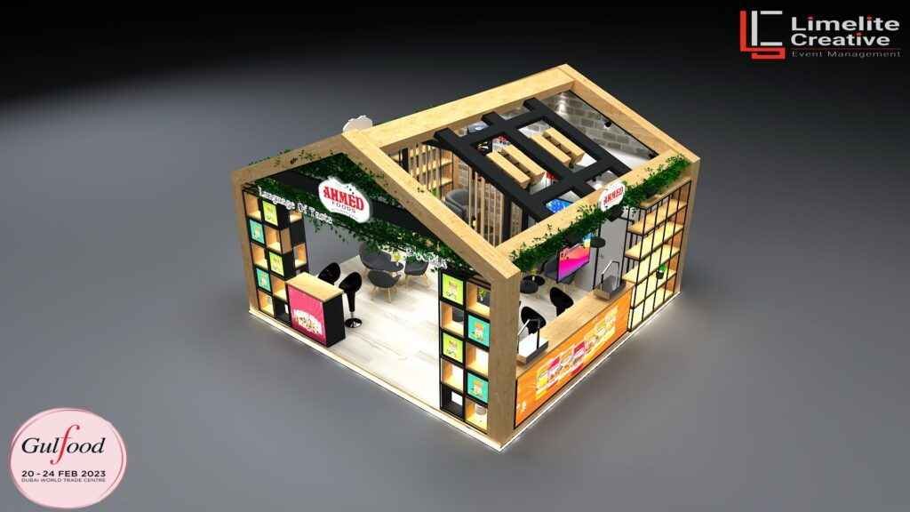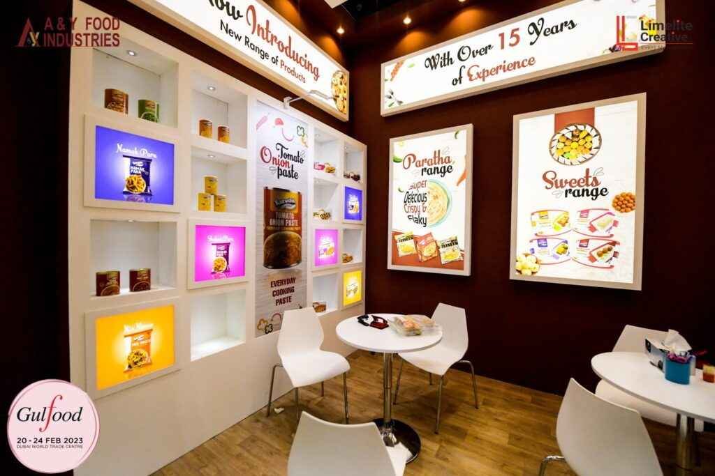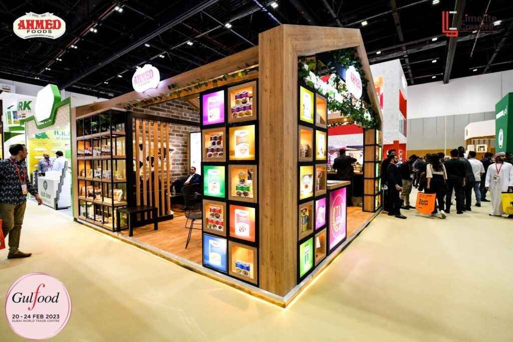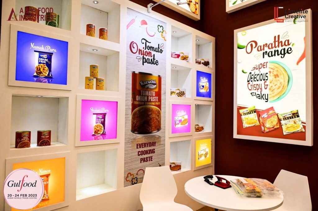 Ahmed Foods stall size was 6mX6m having total area of 36 squares meter. The design looked simple & beautiful with nicely lighted logos on counter & back wall along with backlit boards.