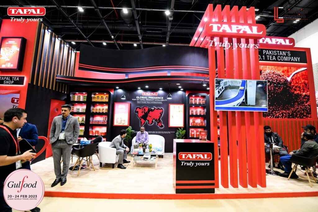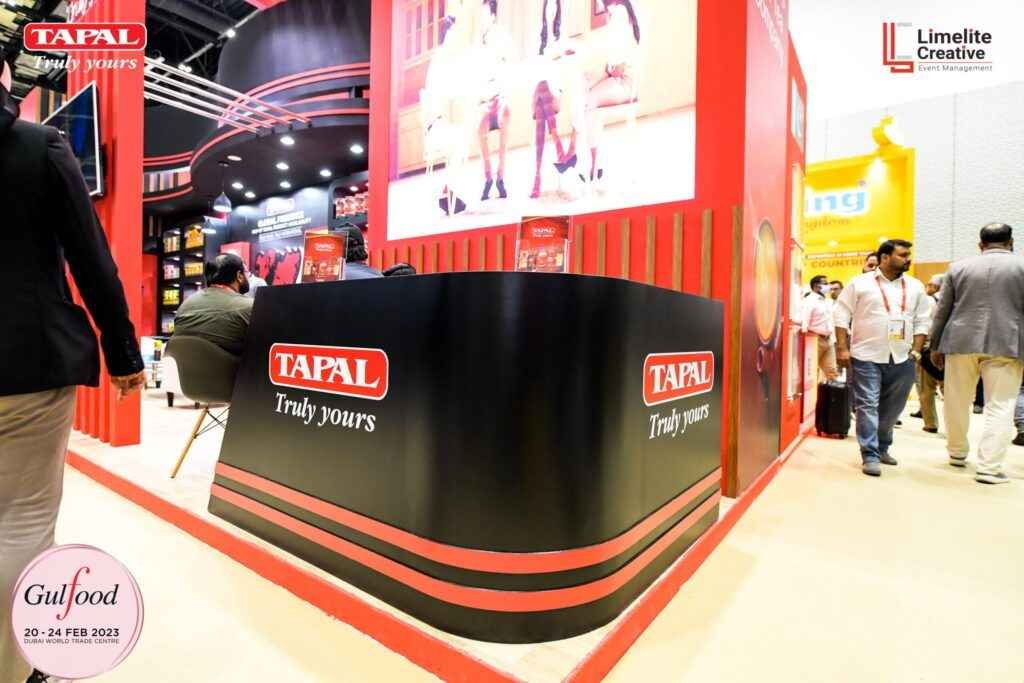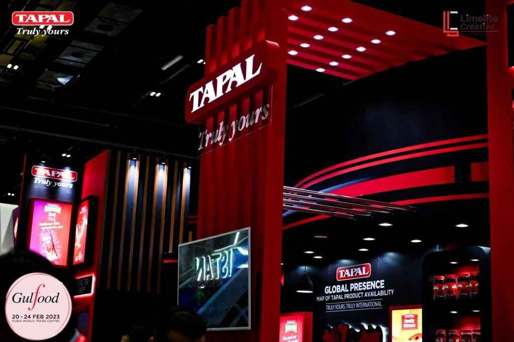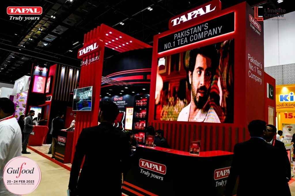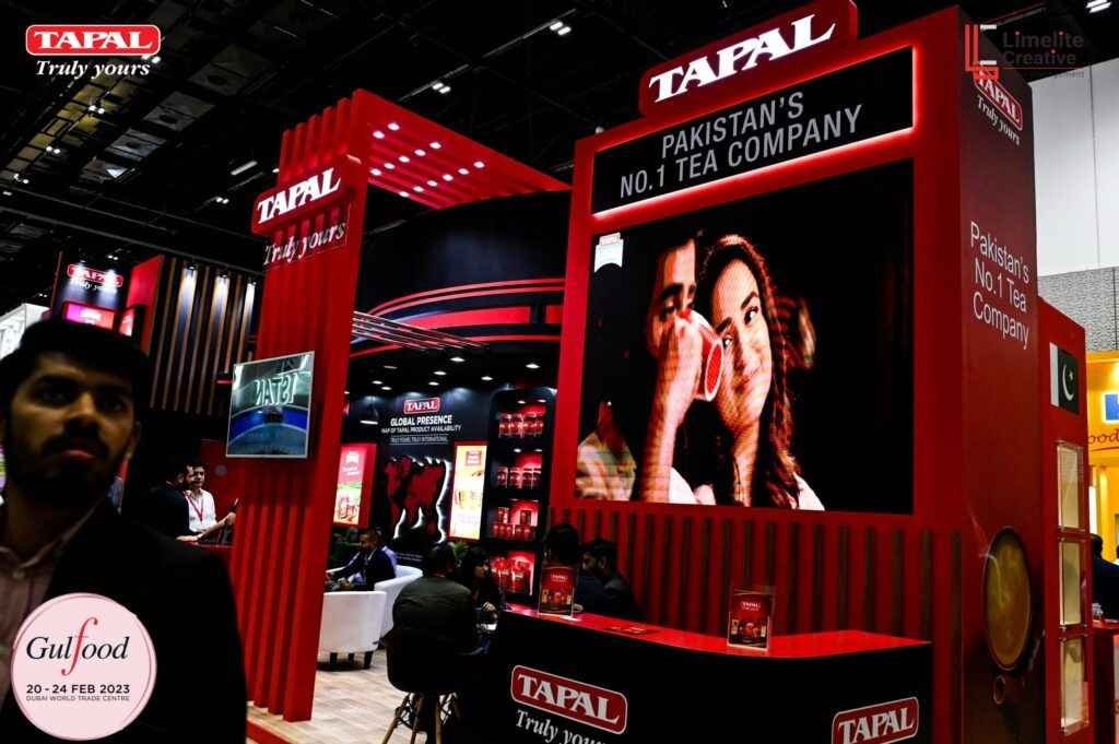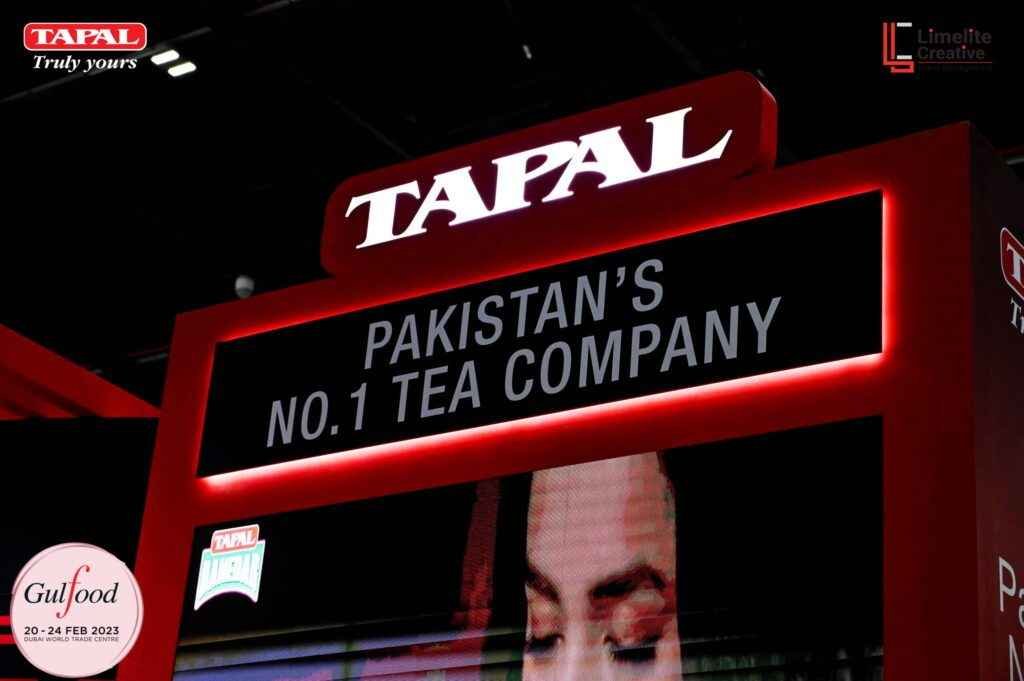 Tapal stall size was 11mX3m having total area of 33 squares meter. The design looked simple & beautiful with nicely lighted logos on counter & back wall along with backlit boards.