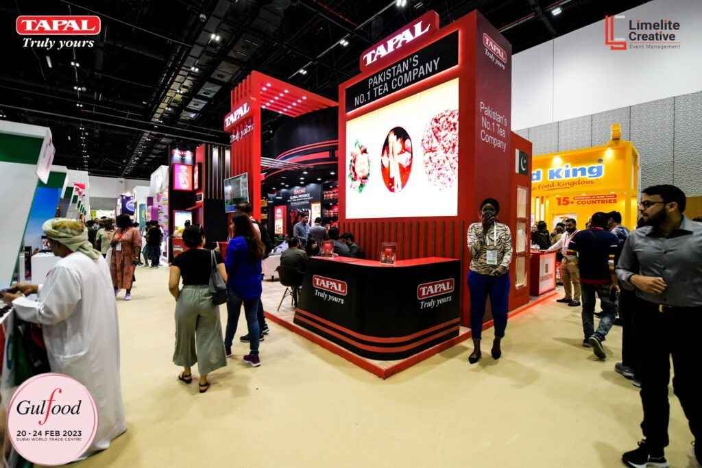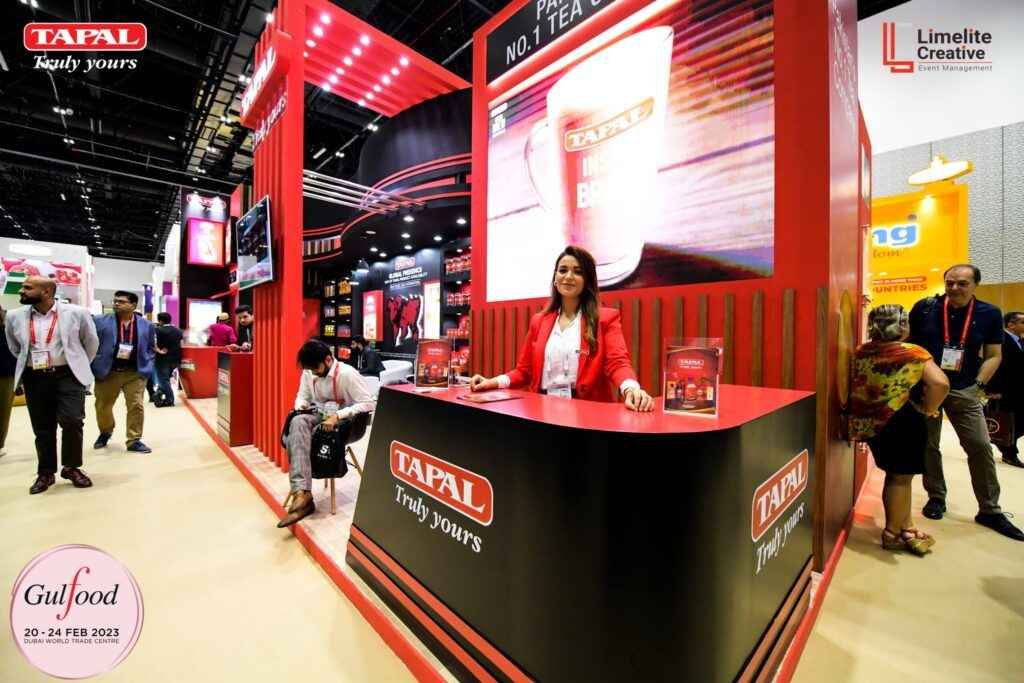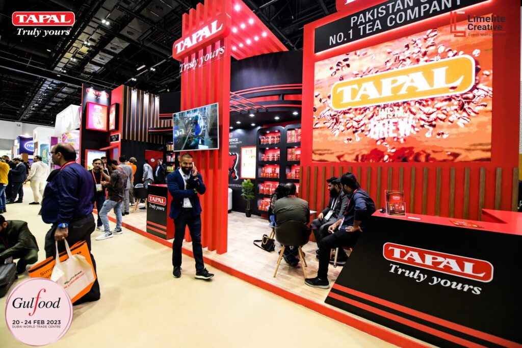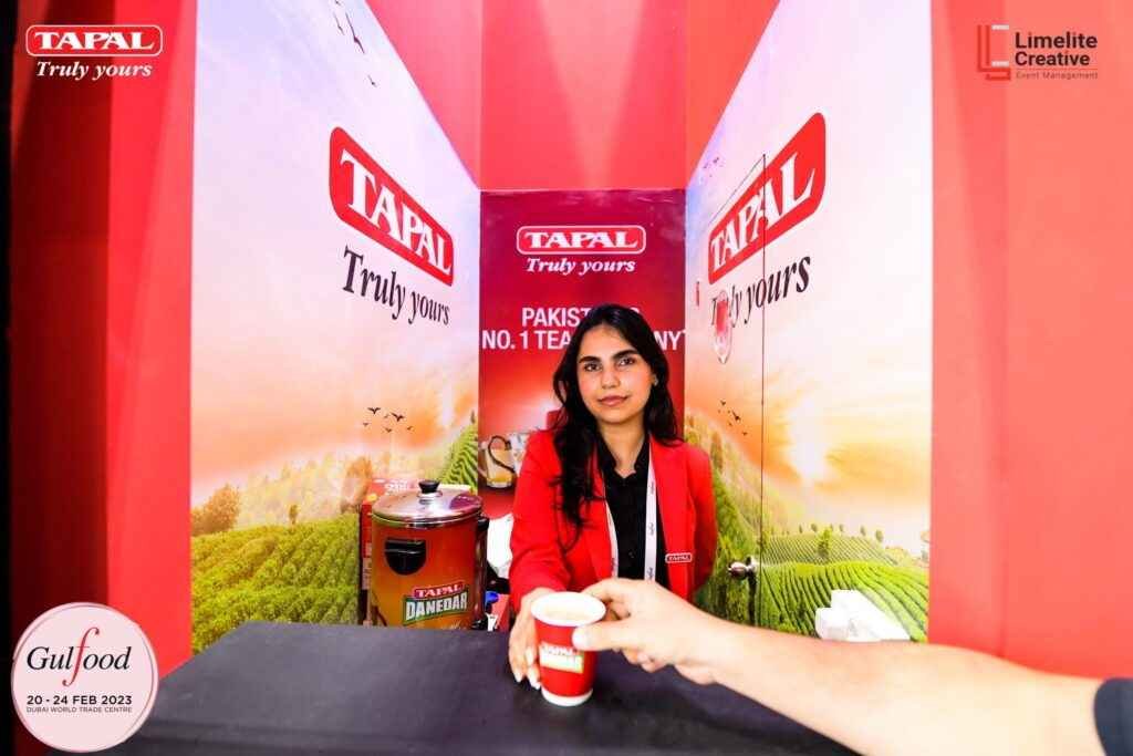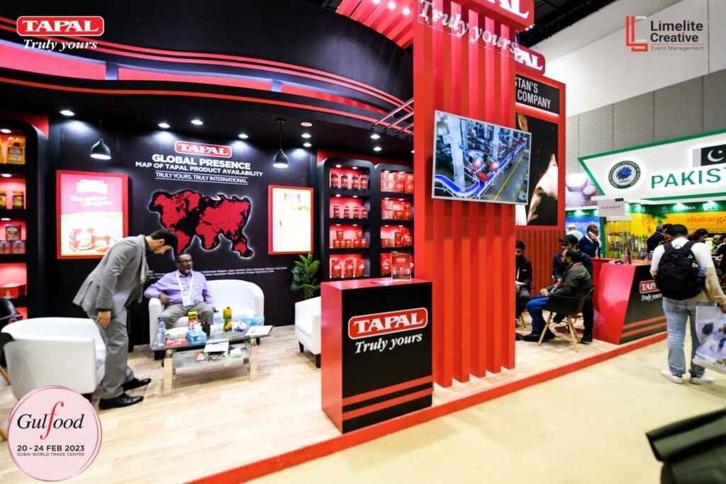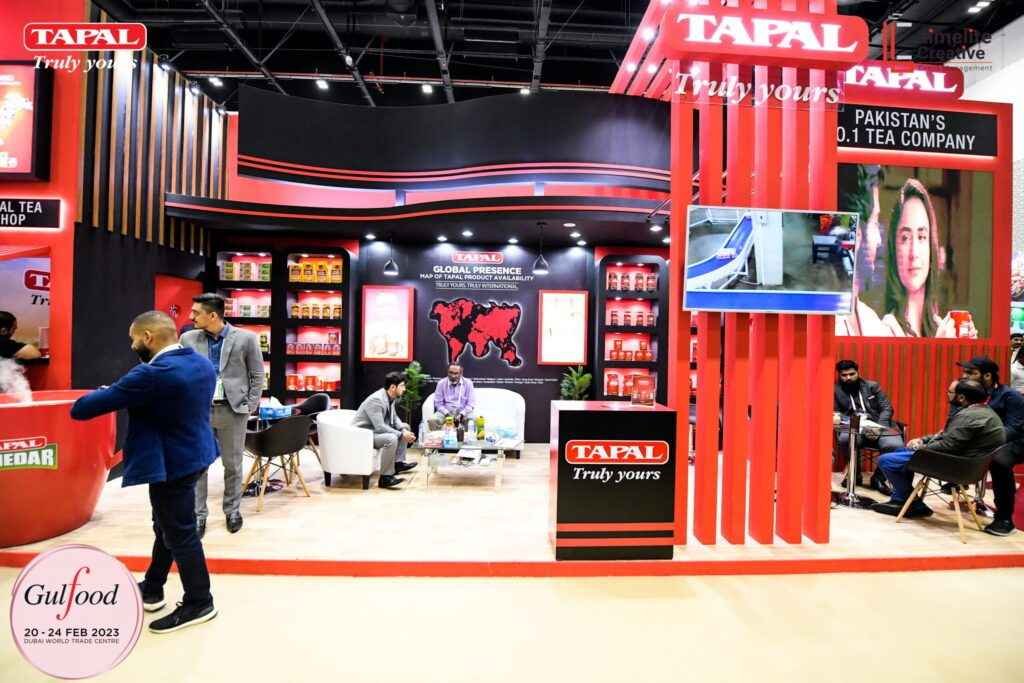 Tapal stall size was 11mX3m having total area of 33 squares meter. The design looked simple & beautiful with nicely lighted logos on counter & back wall along with backlit boards.