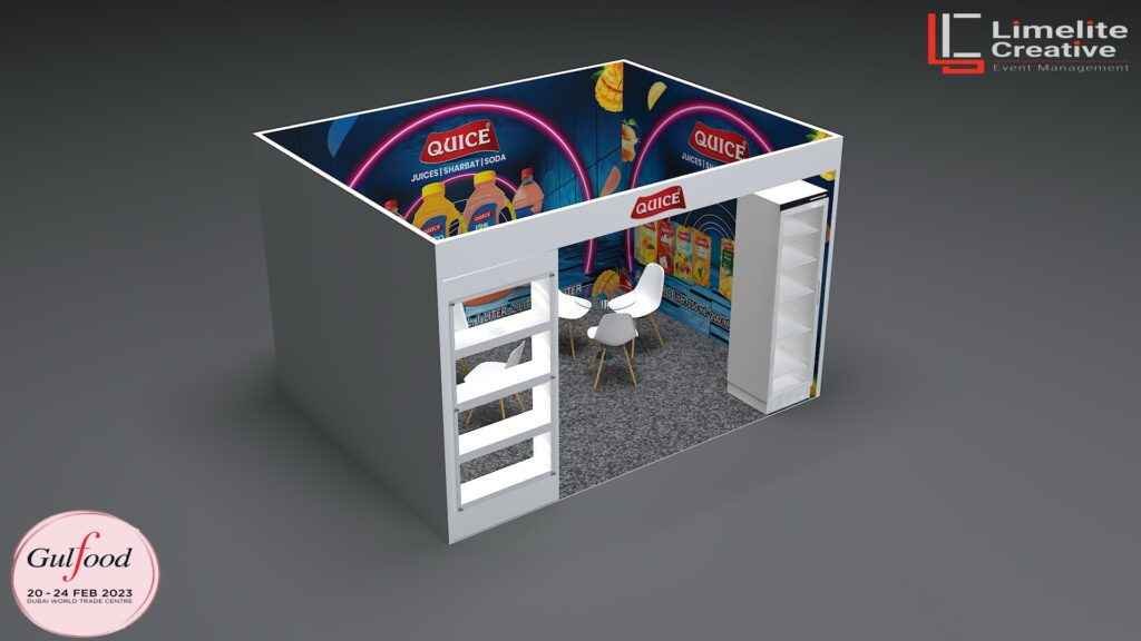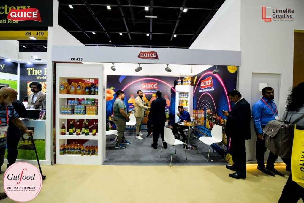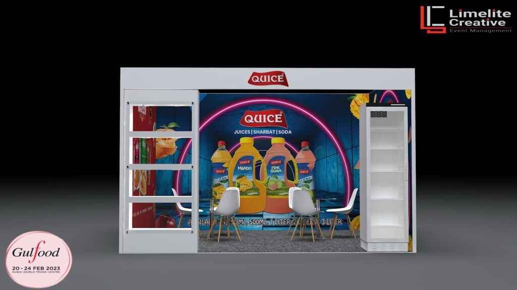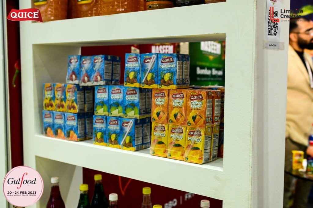A colorful and inviting booth for Quice, showcasing beverages with vibrant branding and neatly arranged product displays. The setup attracted attention from buyers and trade visitors.