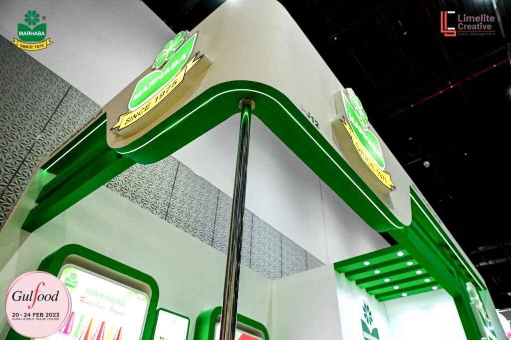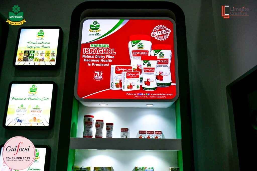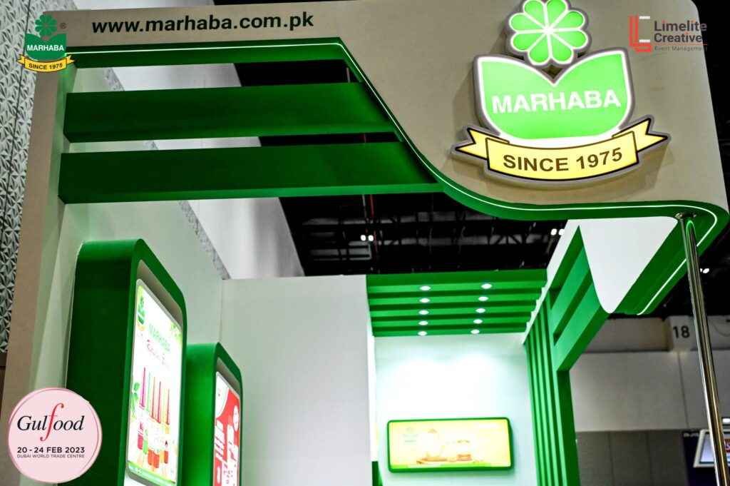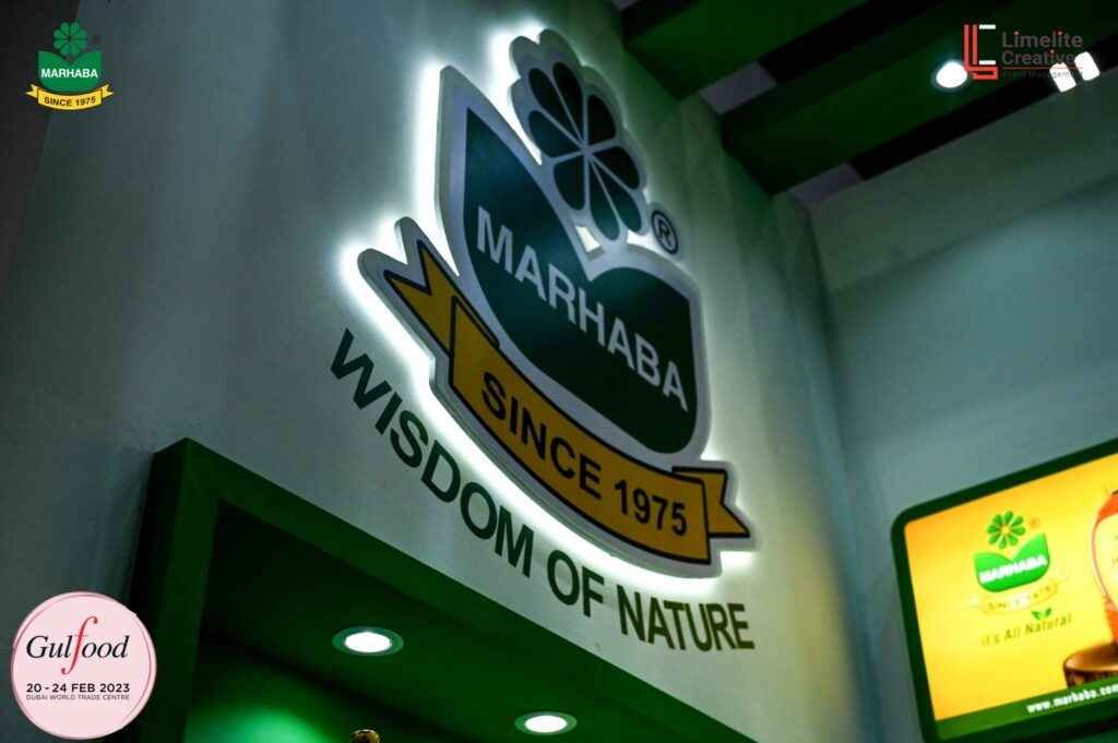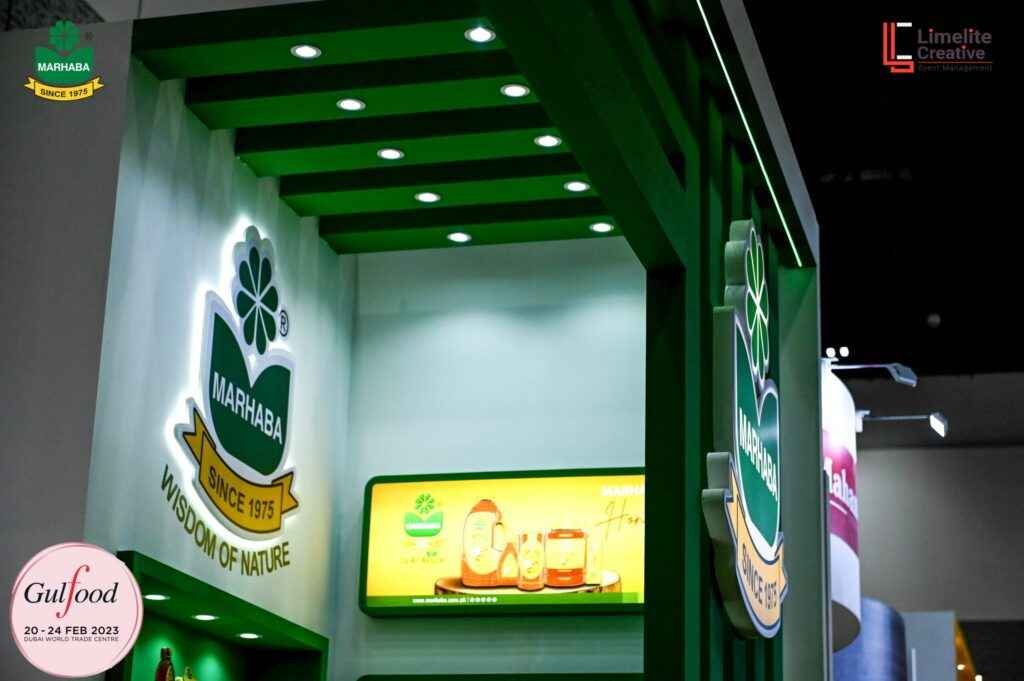 Marhaba stall size was 6mX3m having total area of 18 squares meter. The design looked simple & beautiful with nicely lighted logos on counter & back wall along with backlit boards.