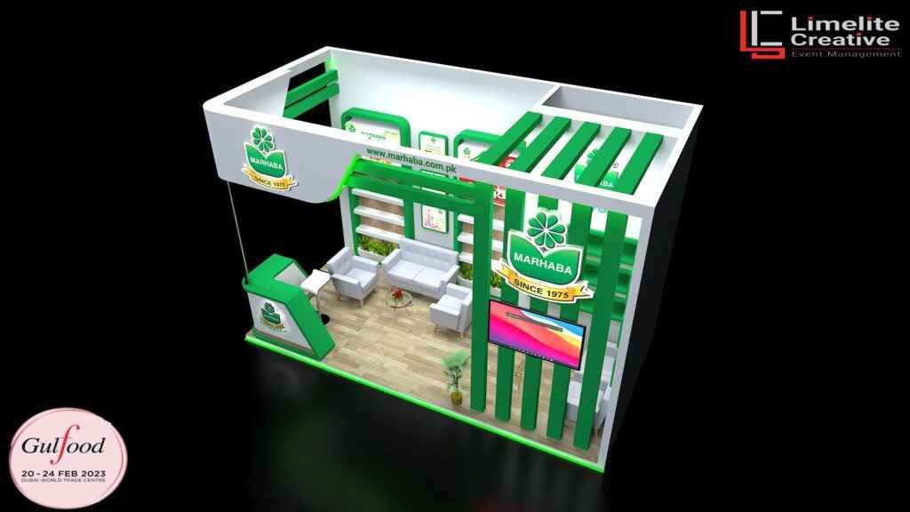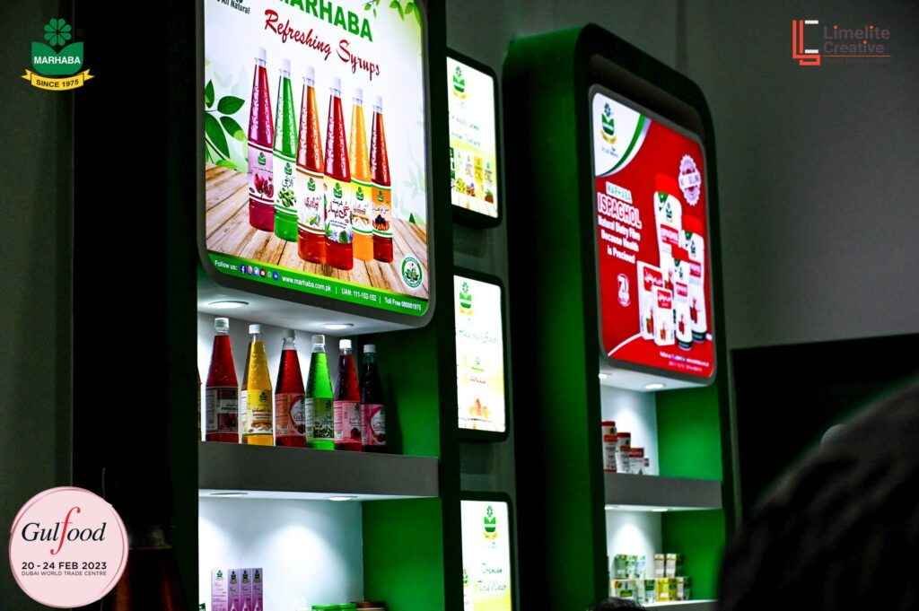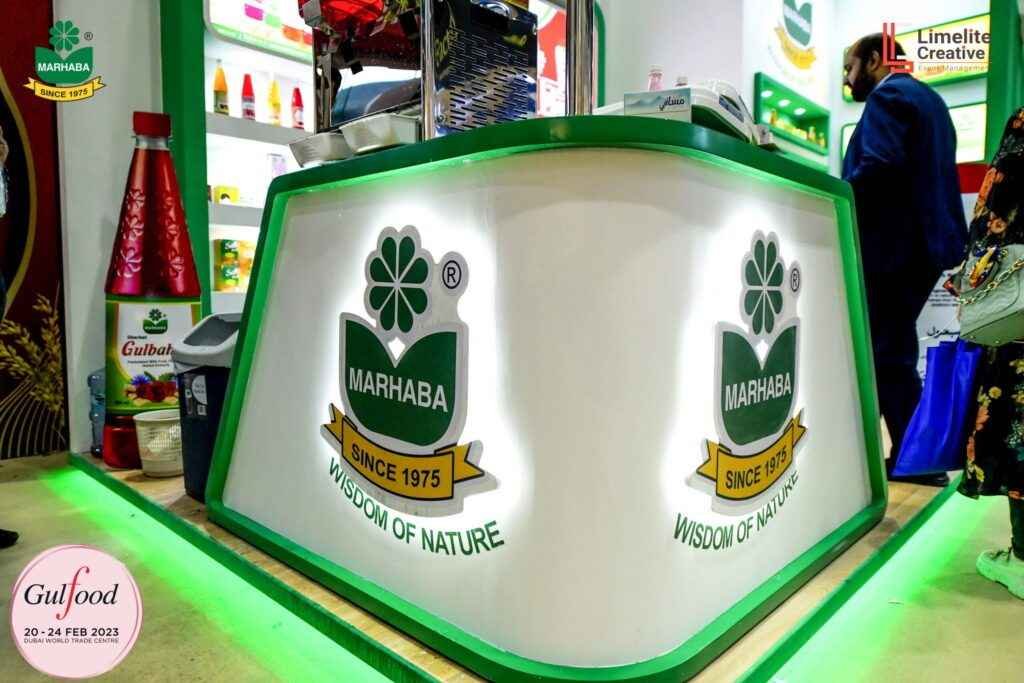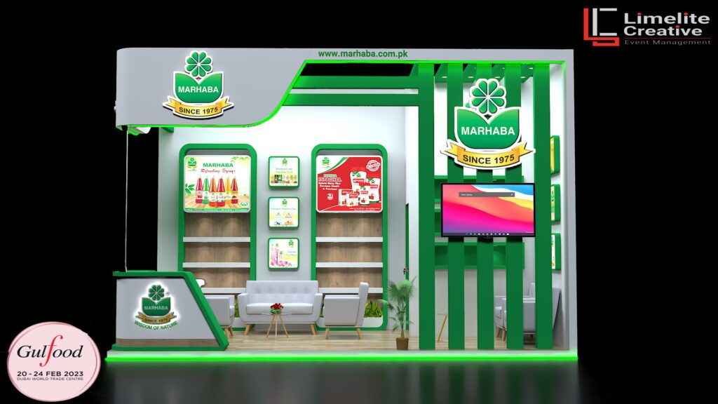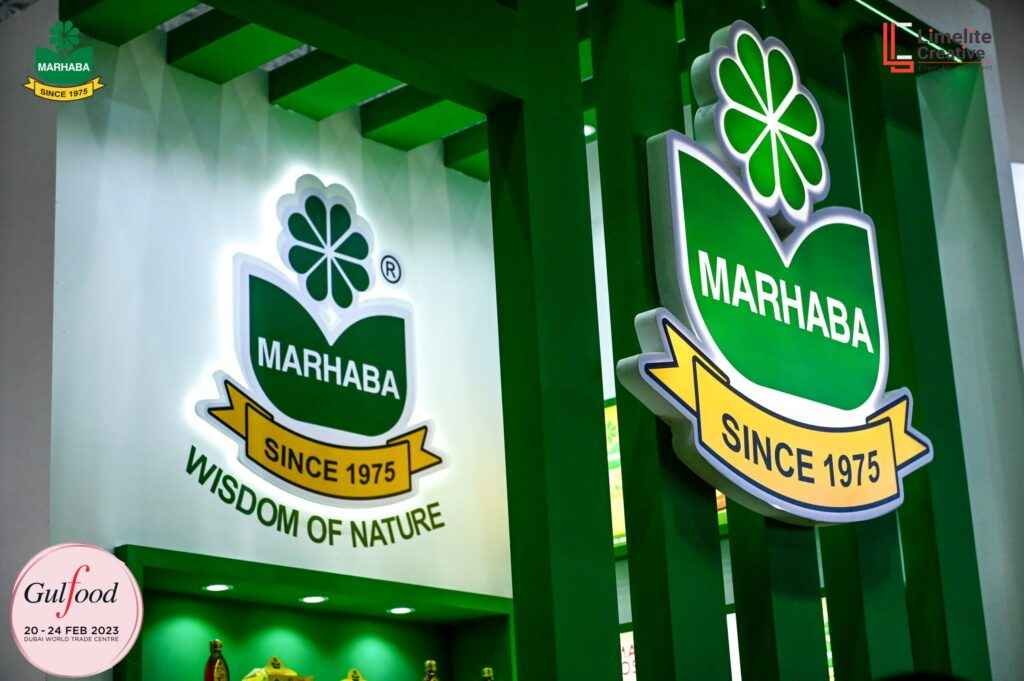 Marhaba stall size was 6mX3m having total area of 18 squares meter. The design looked simple & beautiful with nicely lighted logos on counter & back wall along with backlit boards.