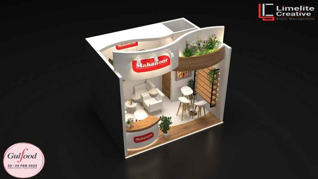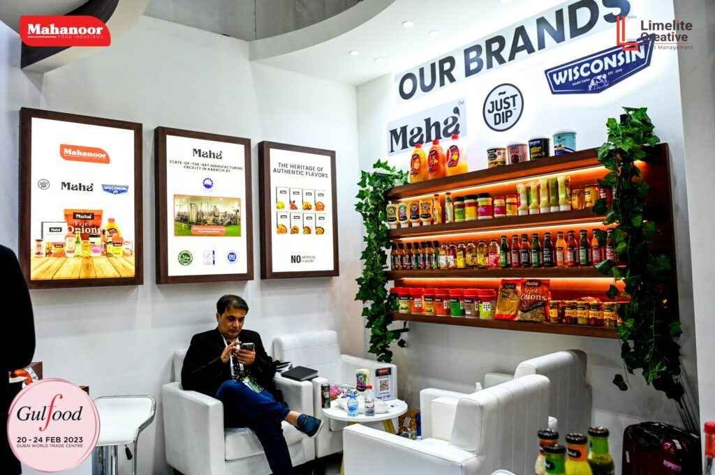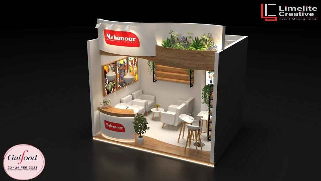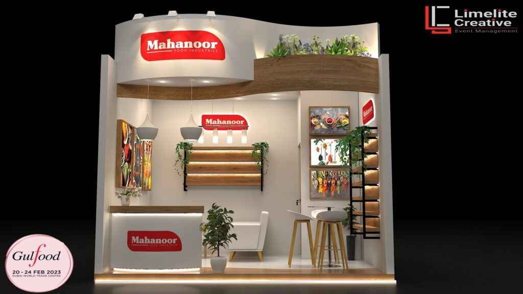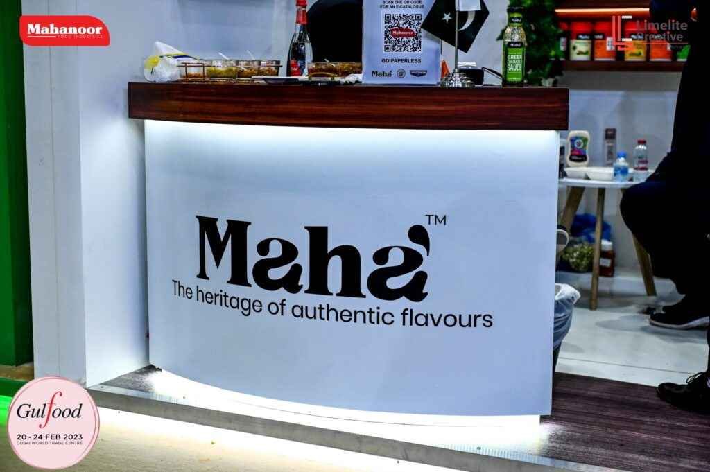 Mahanoor stall size was 4mX3m having total area of 12 squares meter. The design looked simple & beautiful with nicely lighted logos on counter & back wall along with backlit boards.