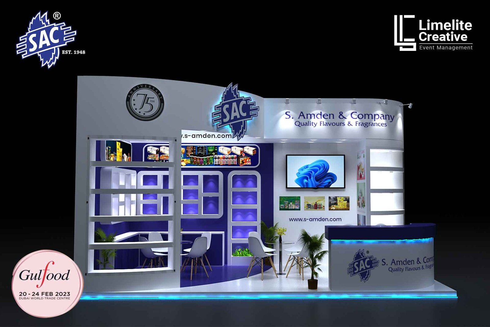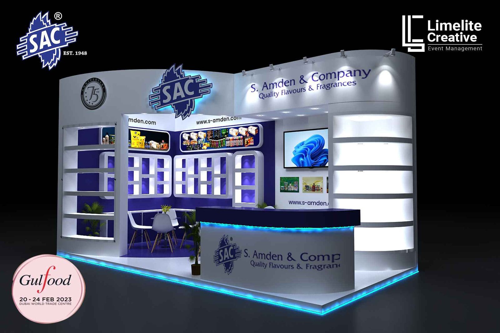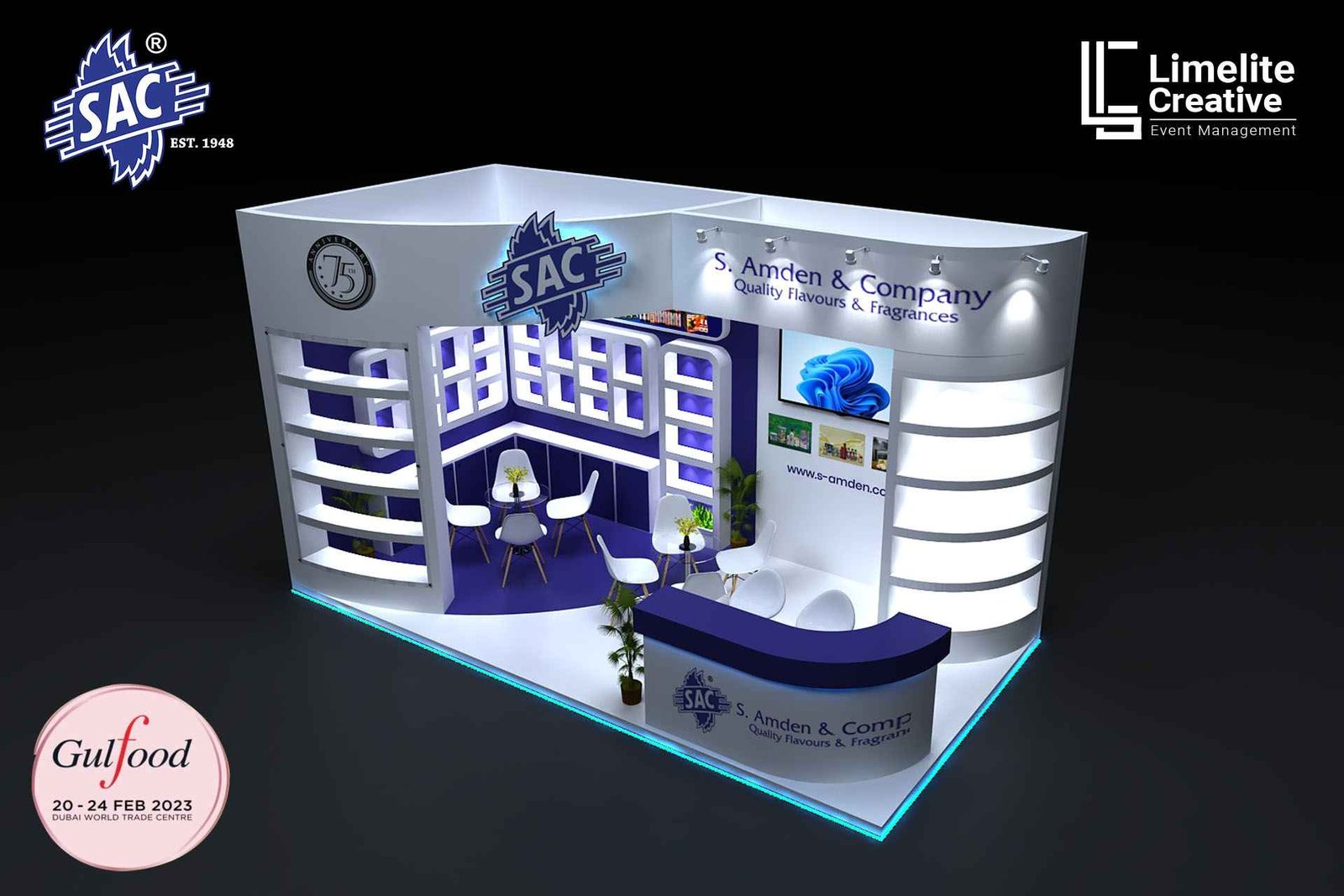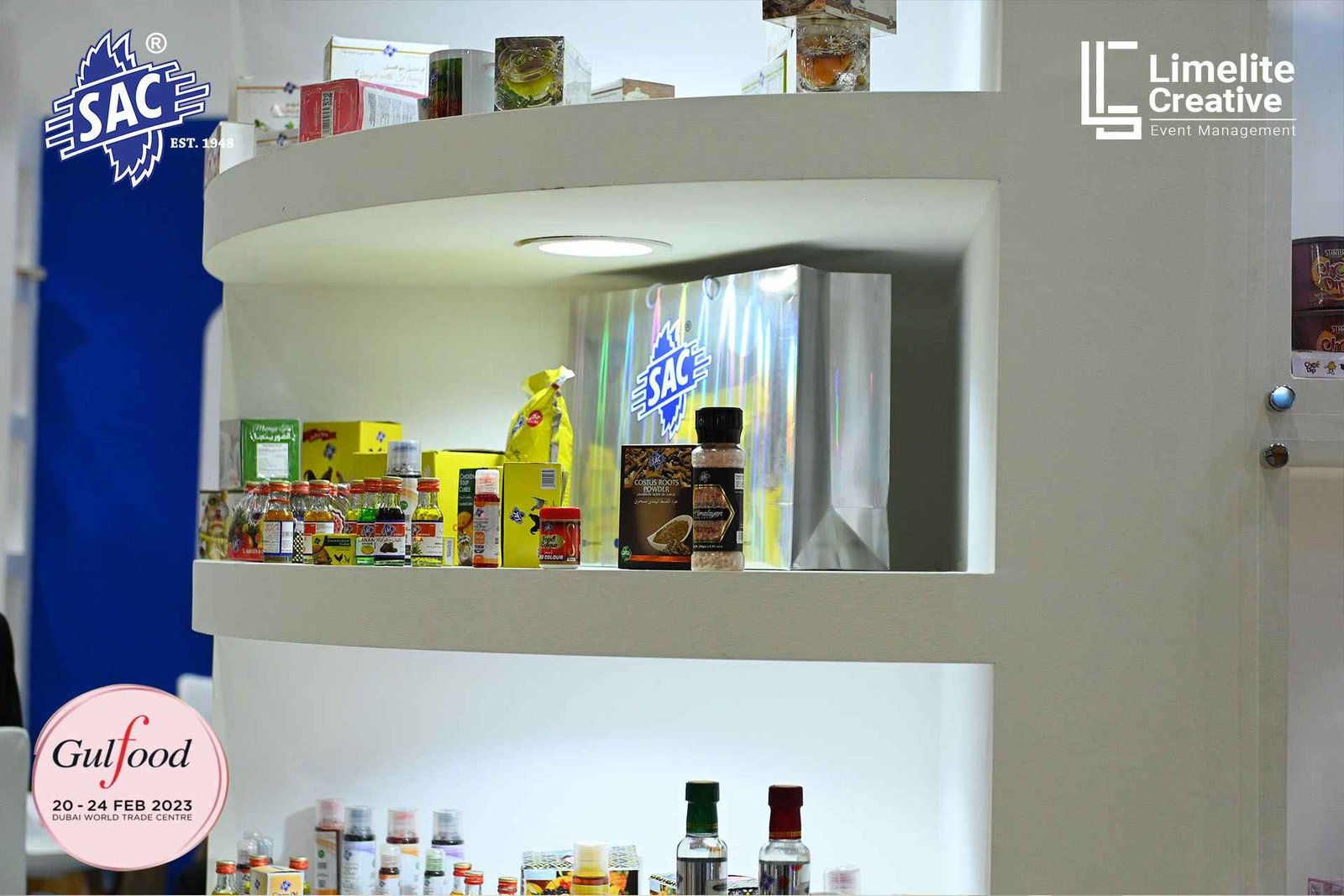 A 6m x 3m booth for SAC at Gulfood 2023, featuring an elegant design with branded graphics, product displays, and a functional layout to highlight their premium offerings and attract visitors.