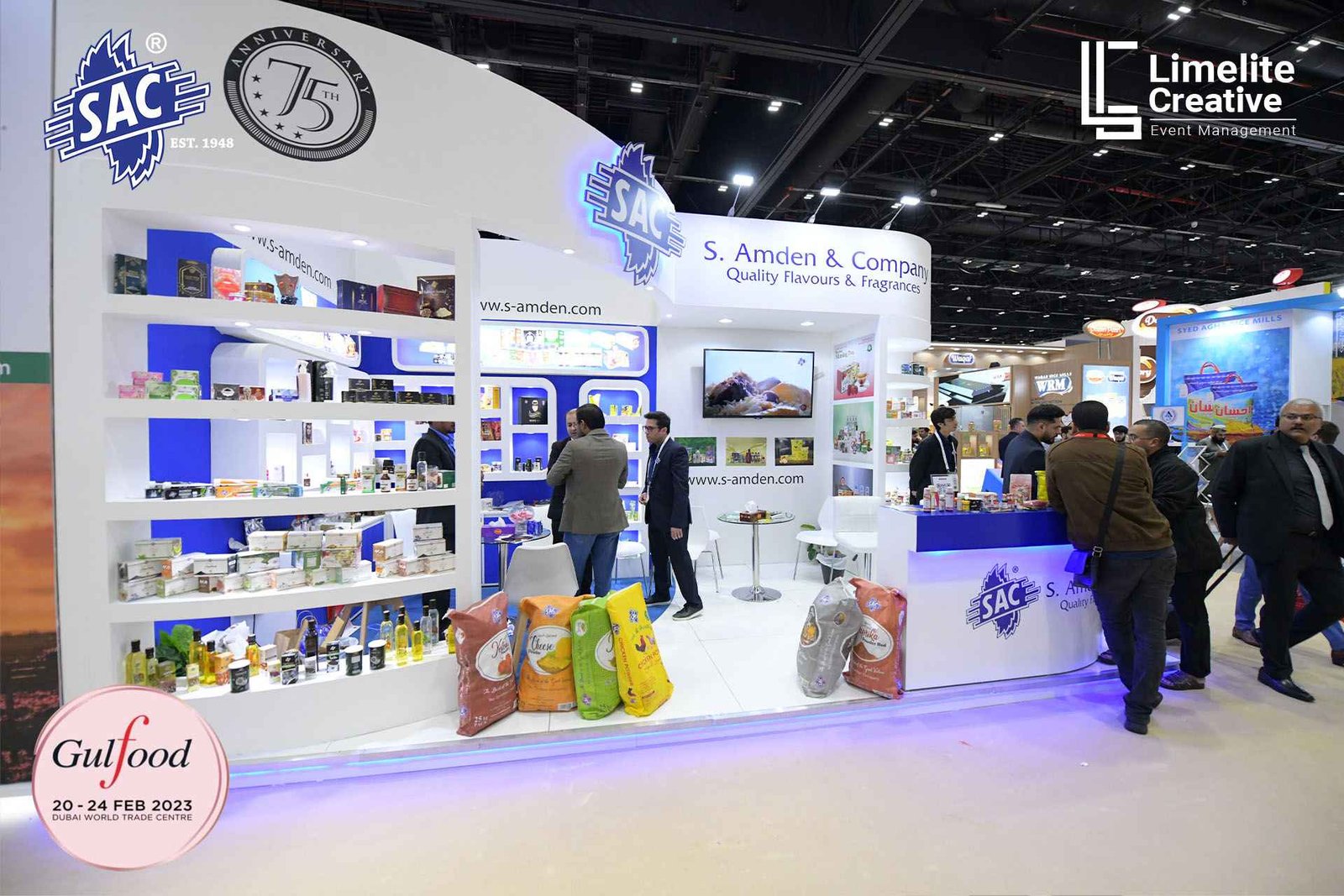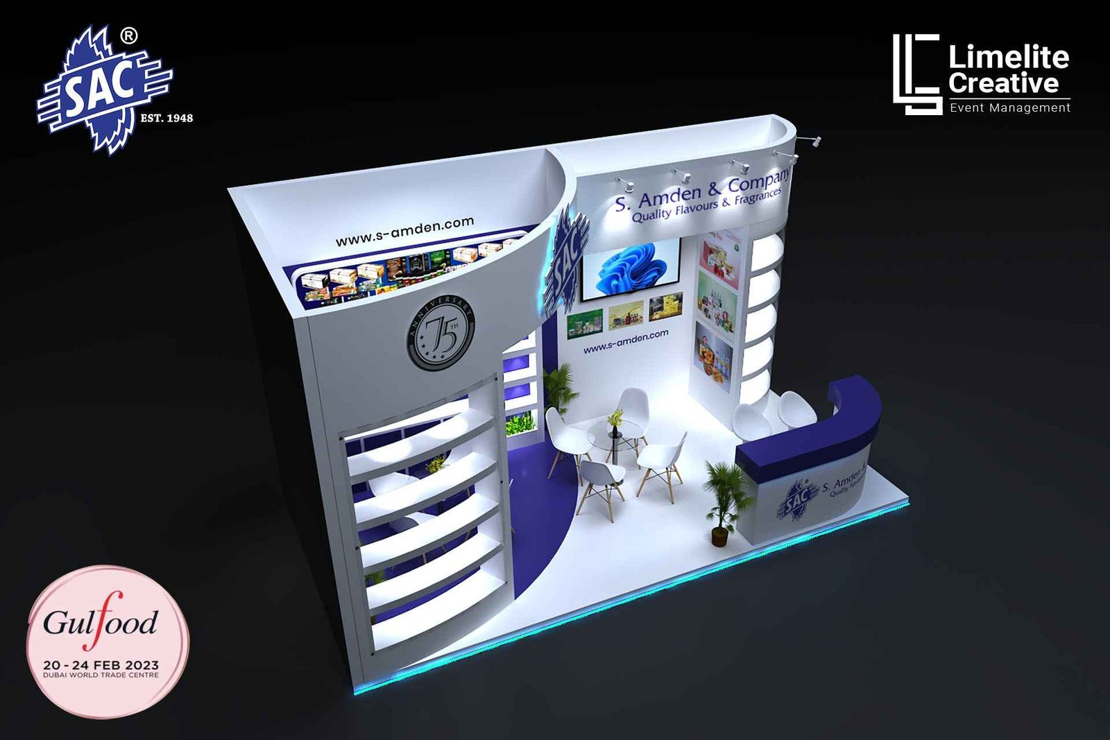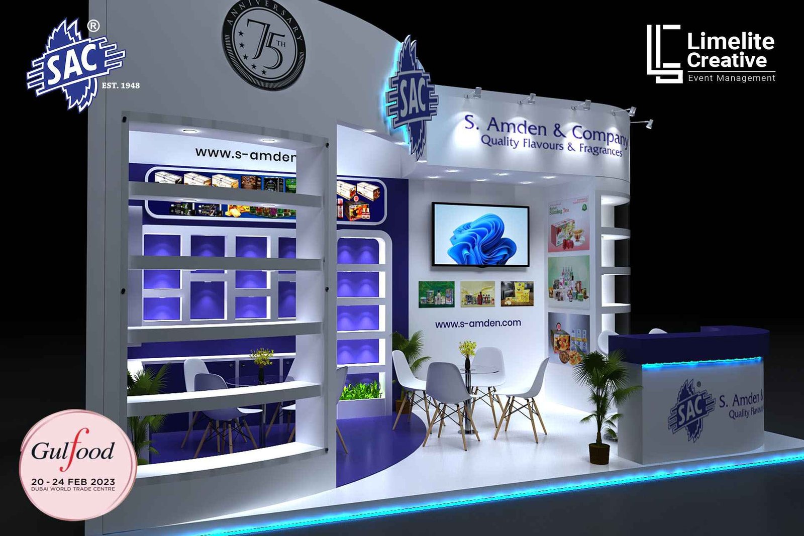 A 6m x 3m booth for SAC at Gulfood 2023, featuring an elegant design with branded graphics, product displays, and a functional layout to highlight their premium offerings and attract visitors.