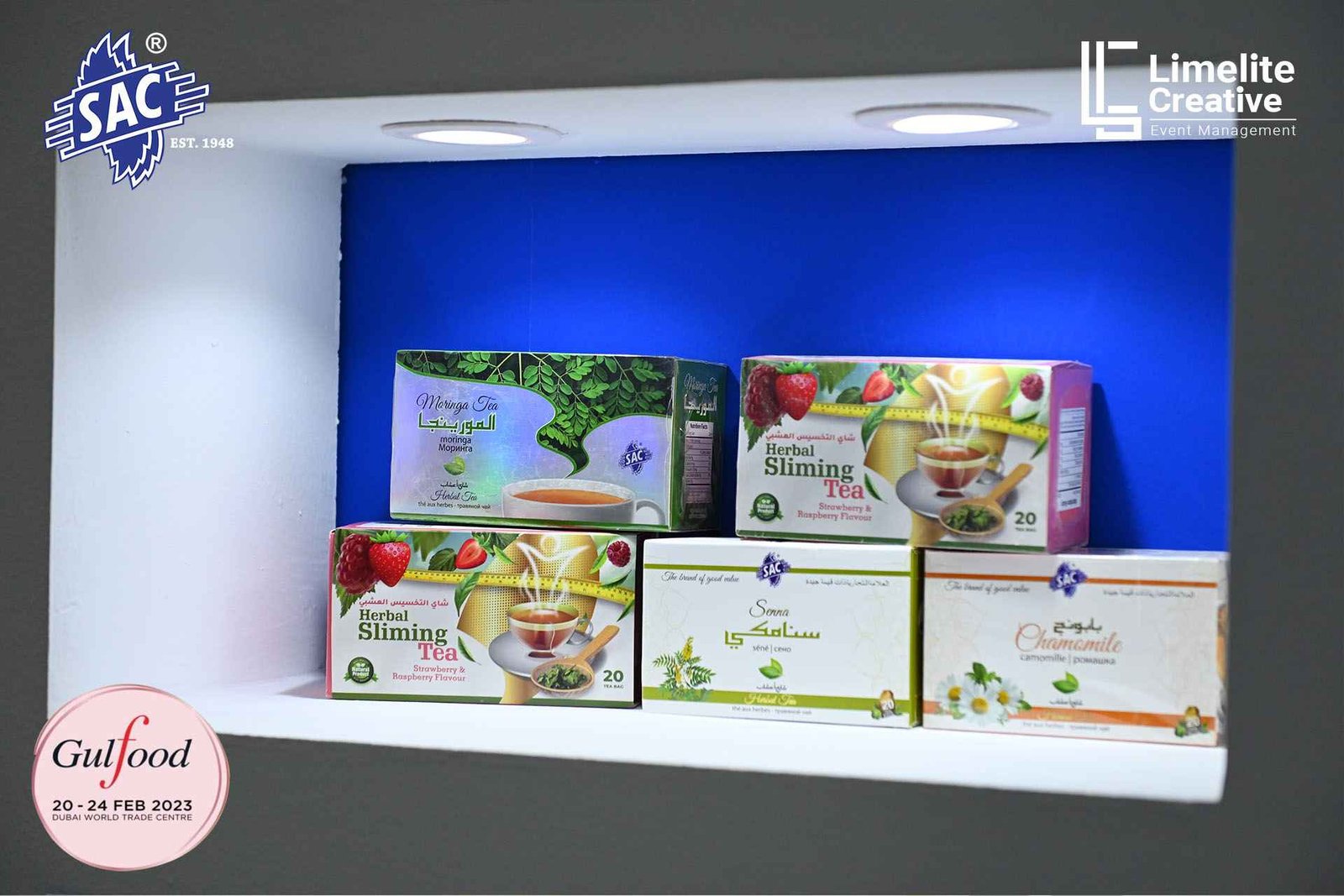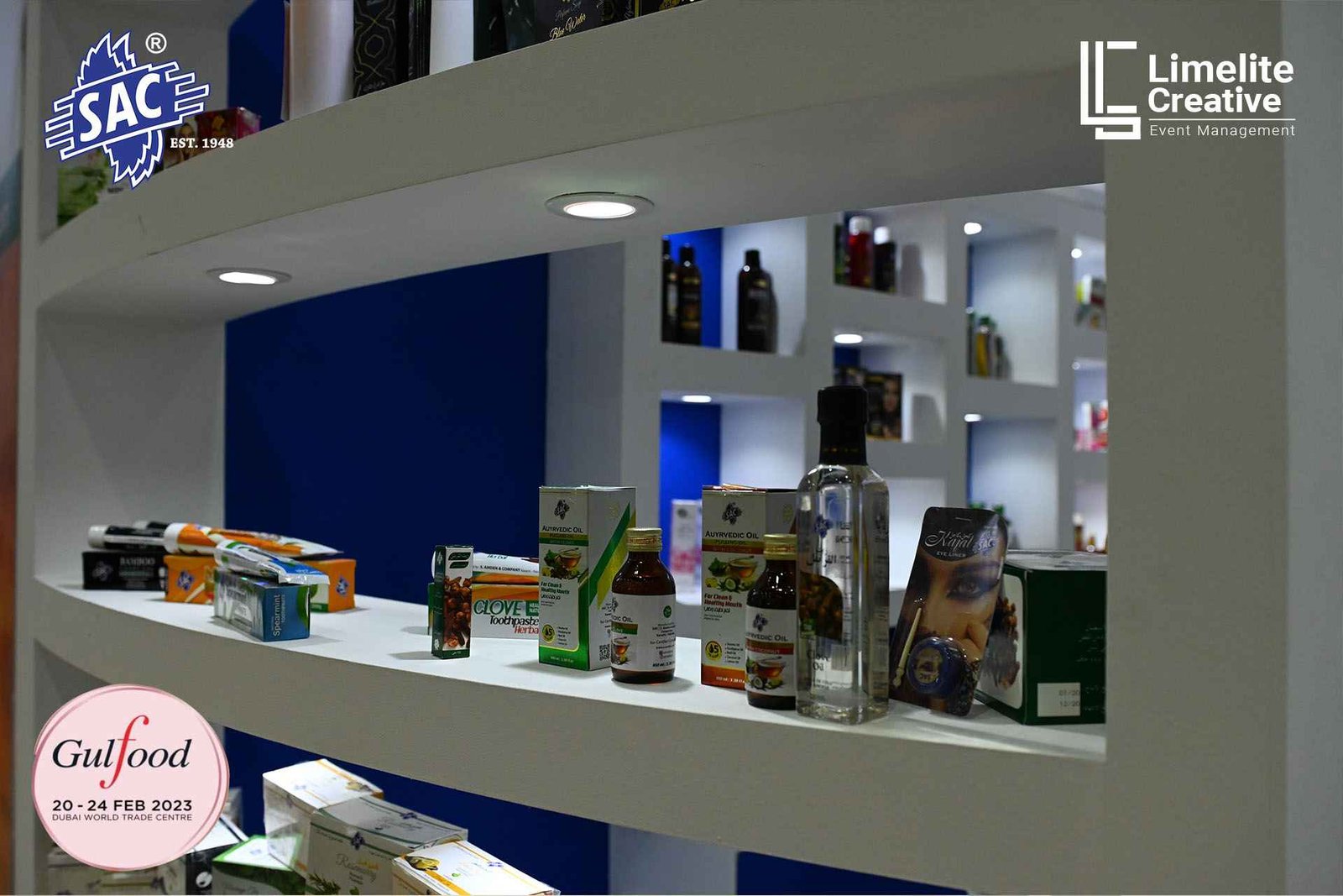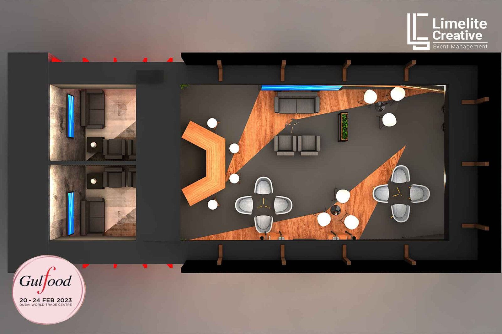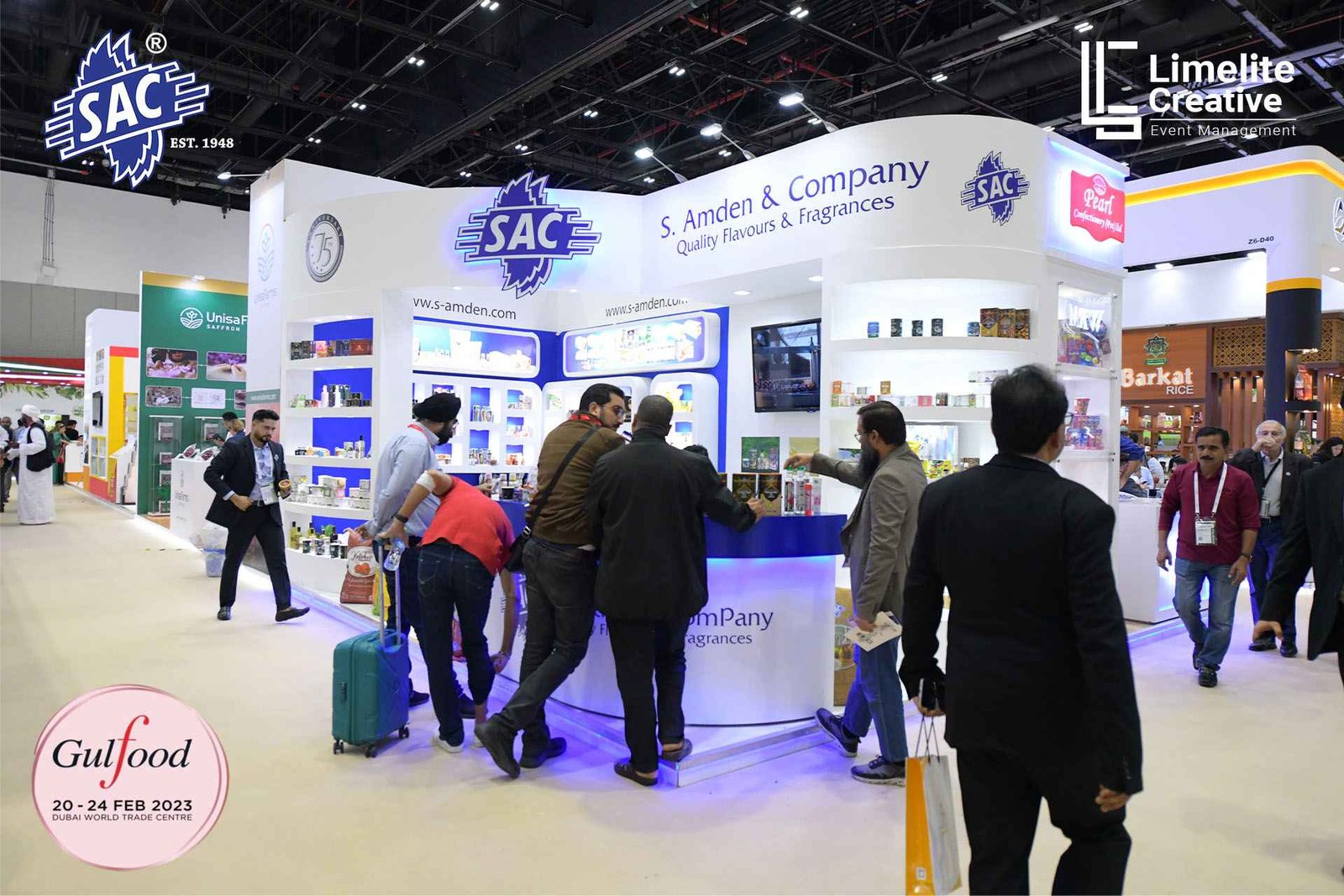 A 6m x 3m booth for SAC at Gulfood 2023, featuring an elegant design with branded graphics, product displays, and a functional layout to highlight their premium offerings and attract visitors.