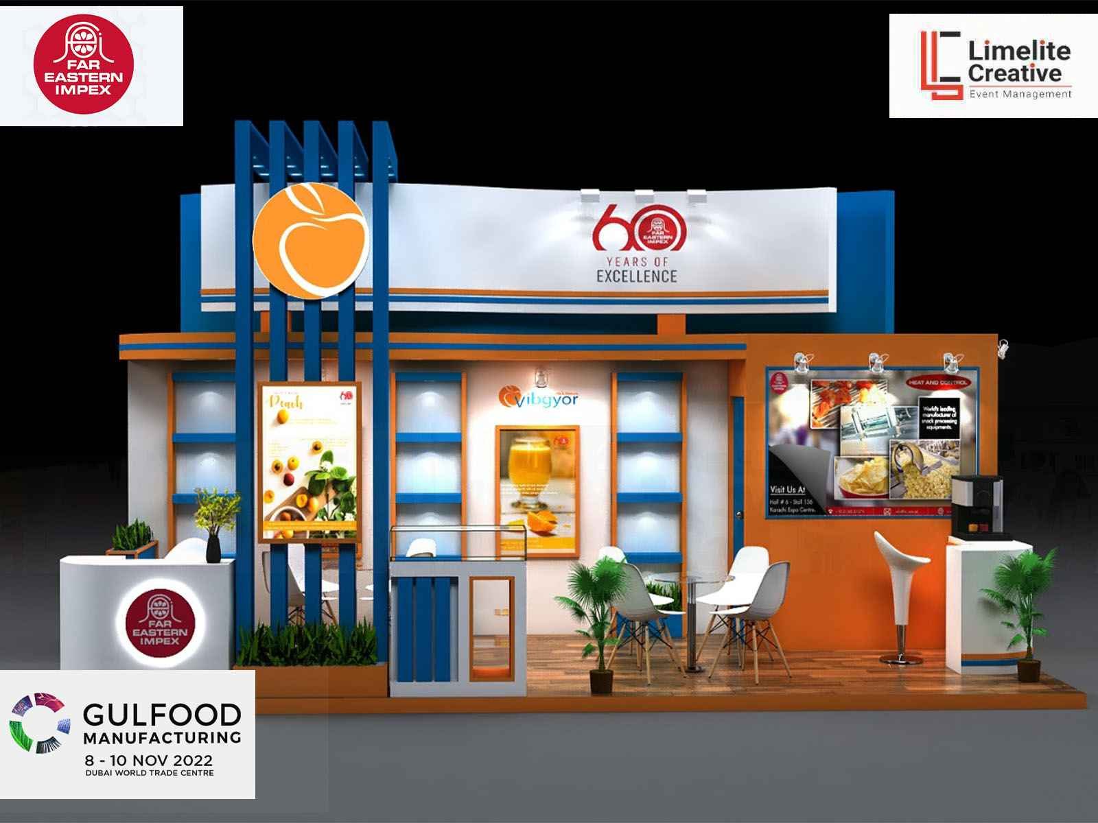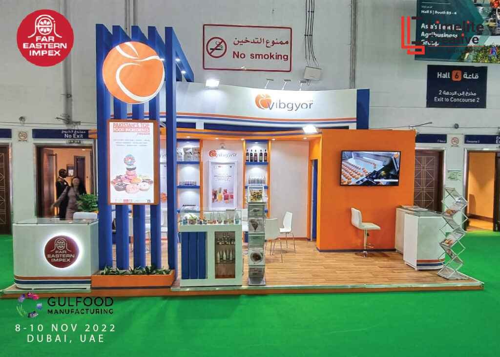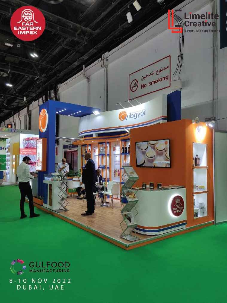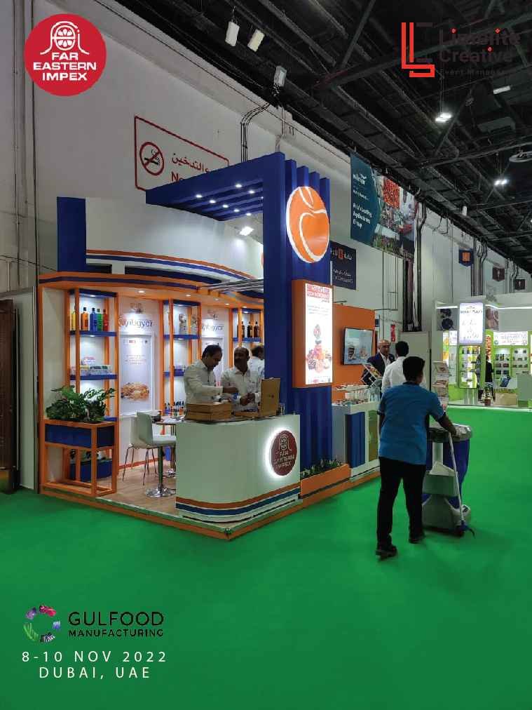 A functional and well-organized booth for Far Eastern at Gulfood Manufacturing 2022, featuring product displays, bold branding, and a layout that facilitated smooth visitor interaction.