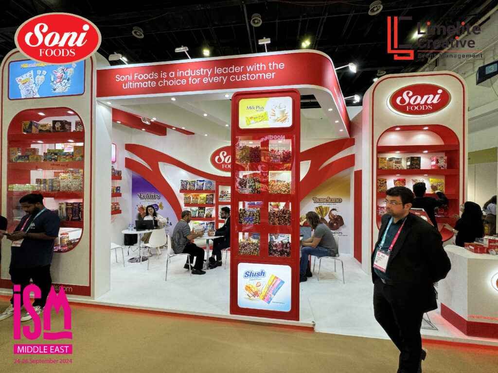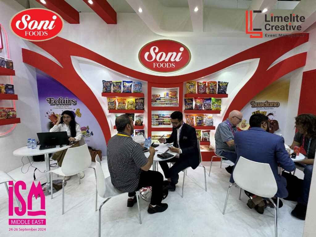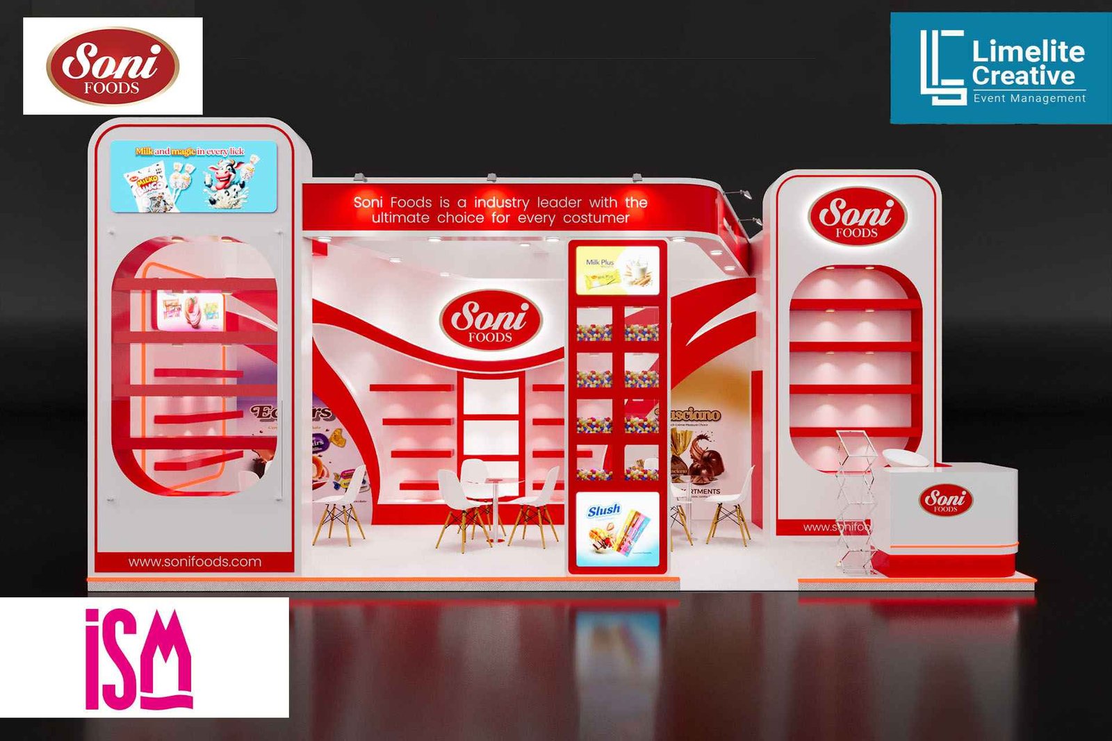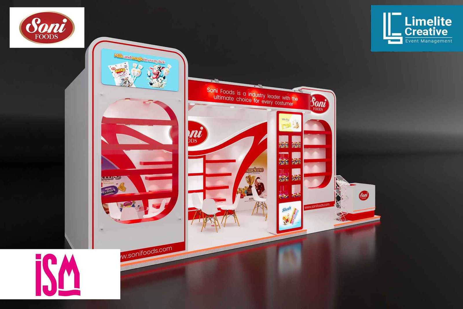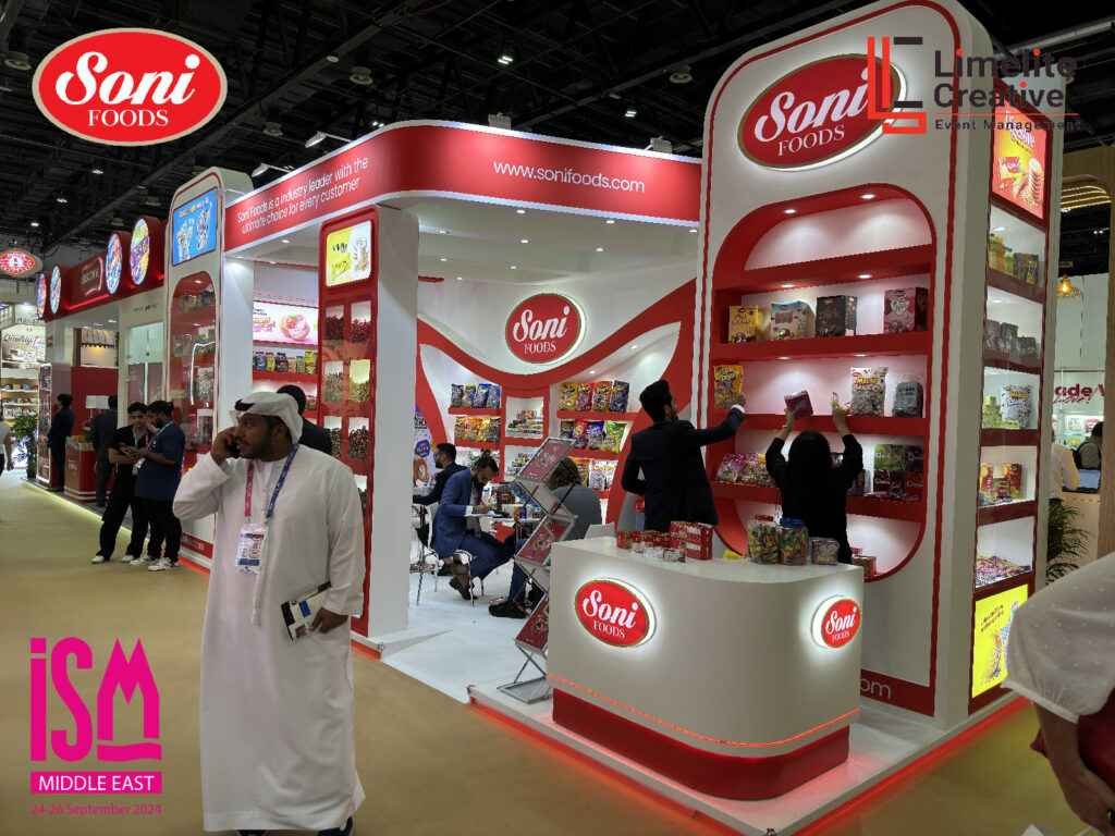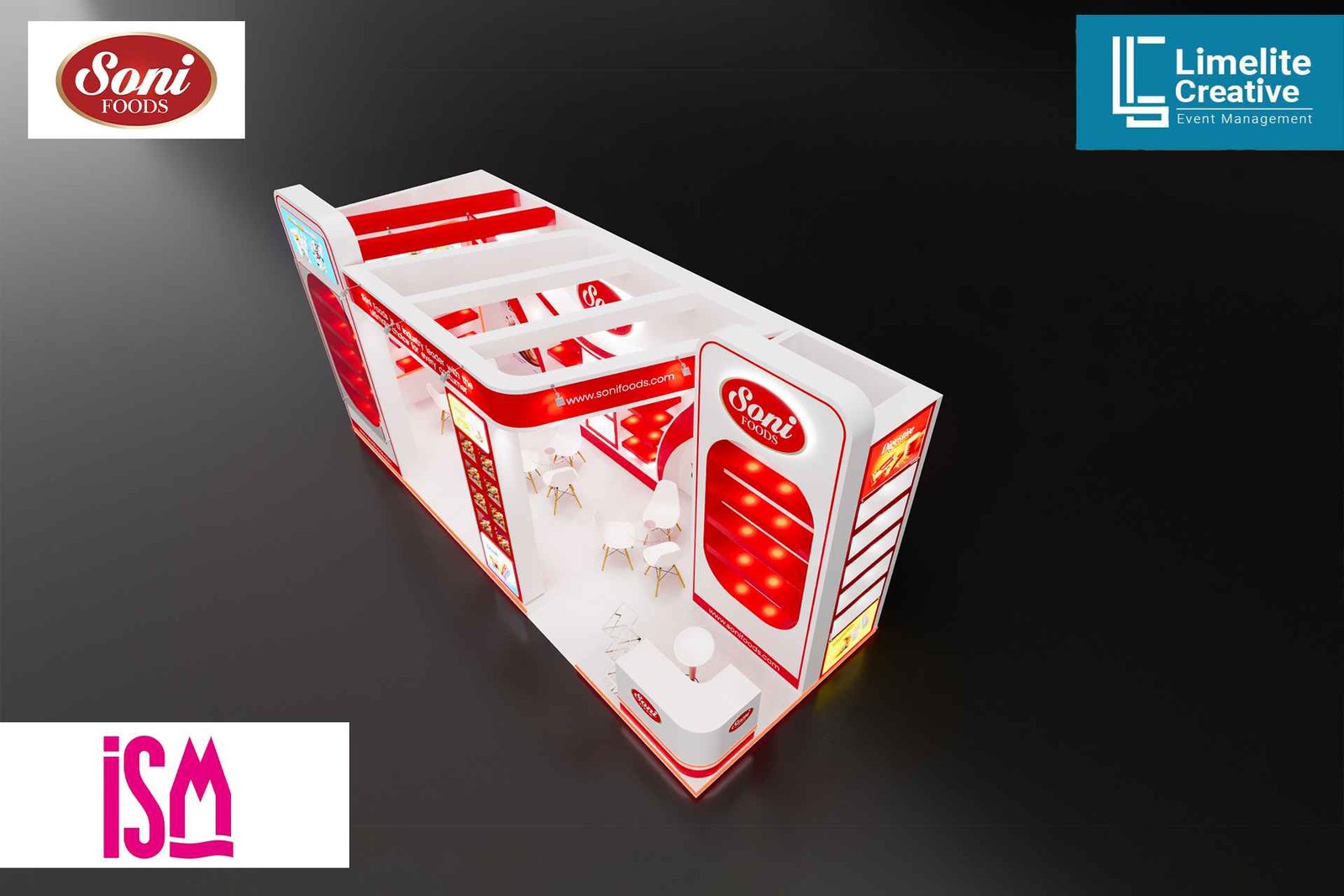 Soni Foods stall size was 8mX3m having total area of 24 squares meter. The design looked simple & beautiful with nicely lighted logos on counter & back wall along with backlit boards.