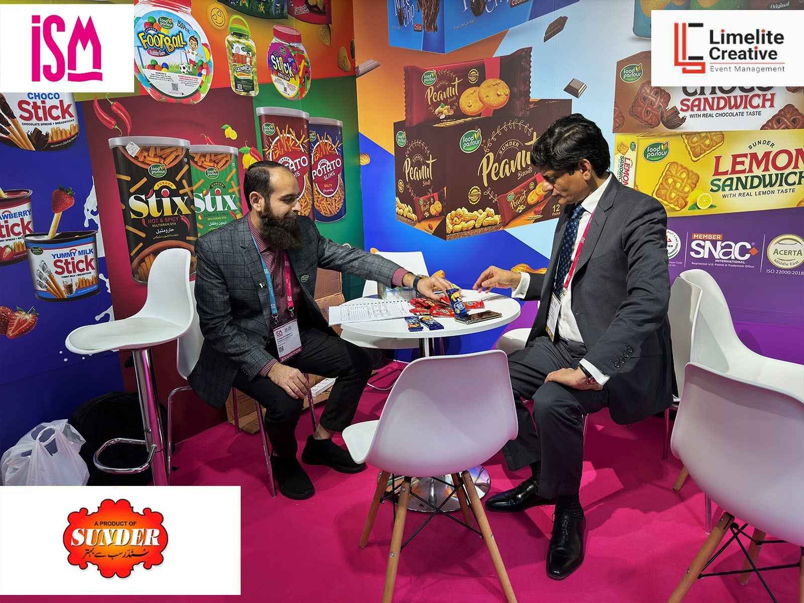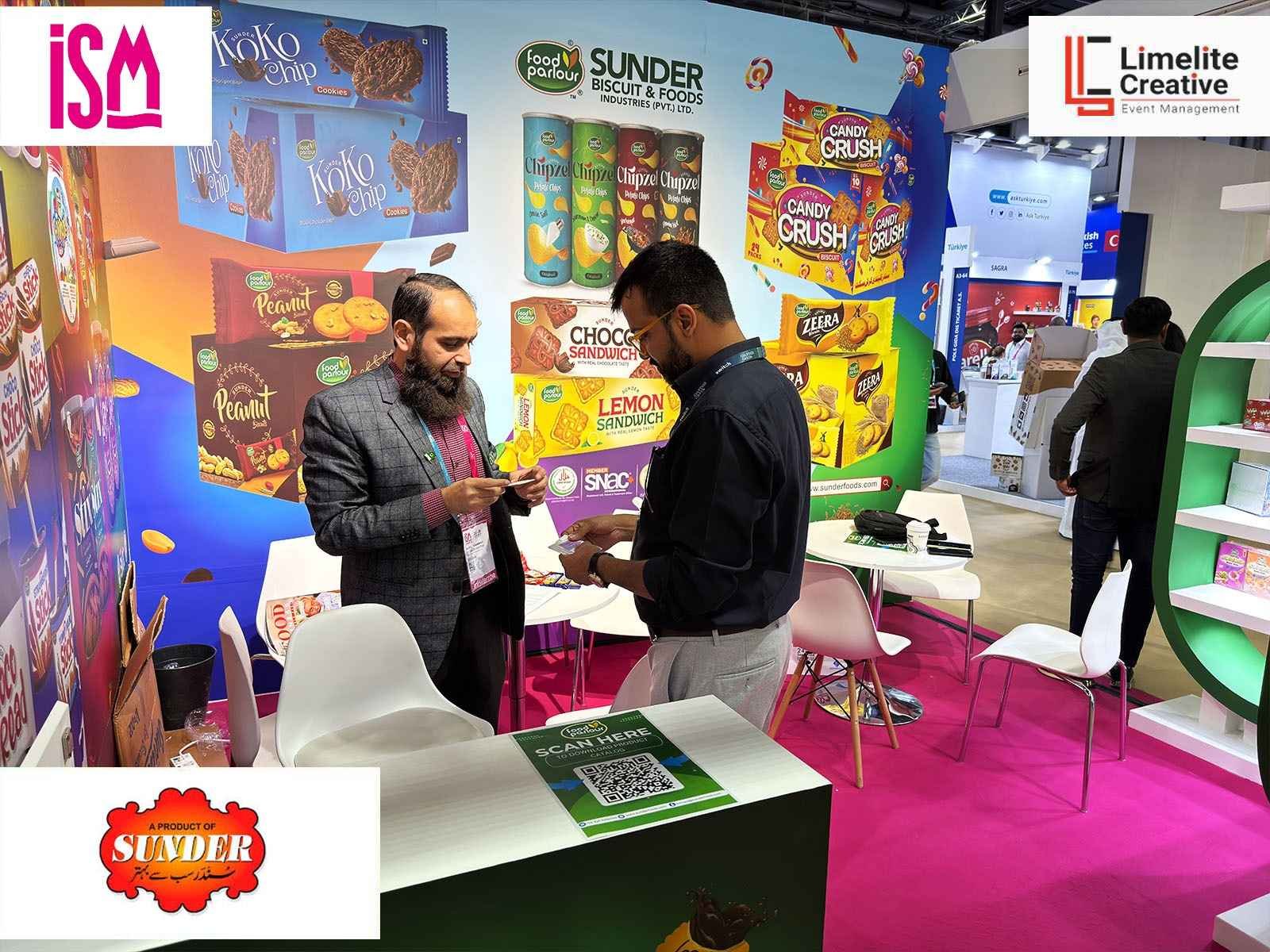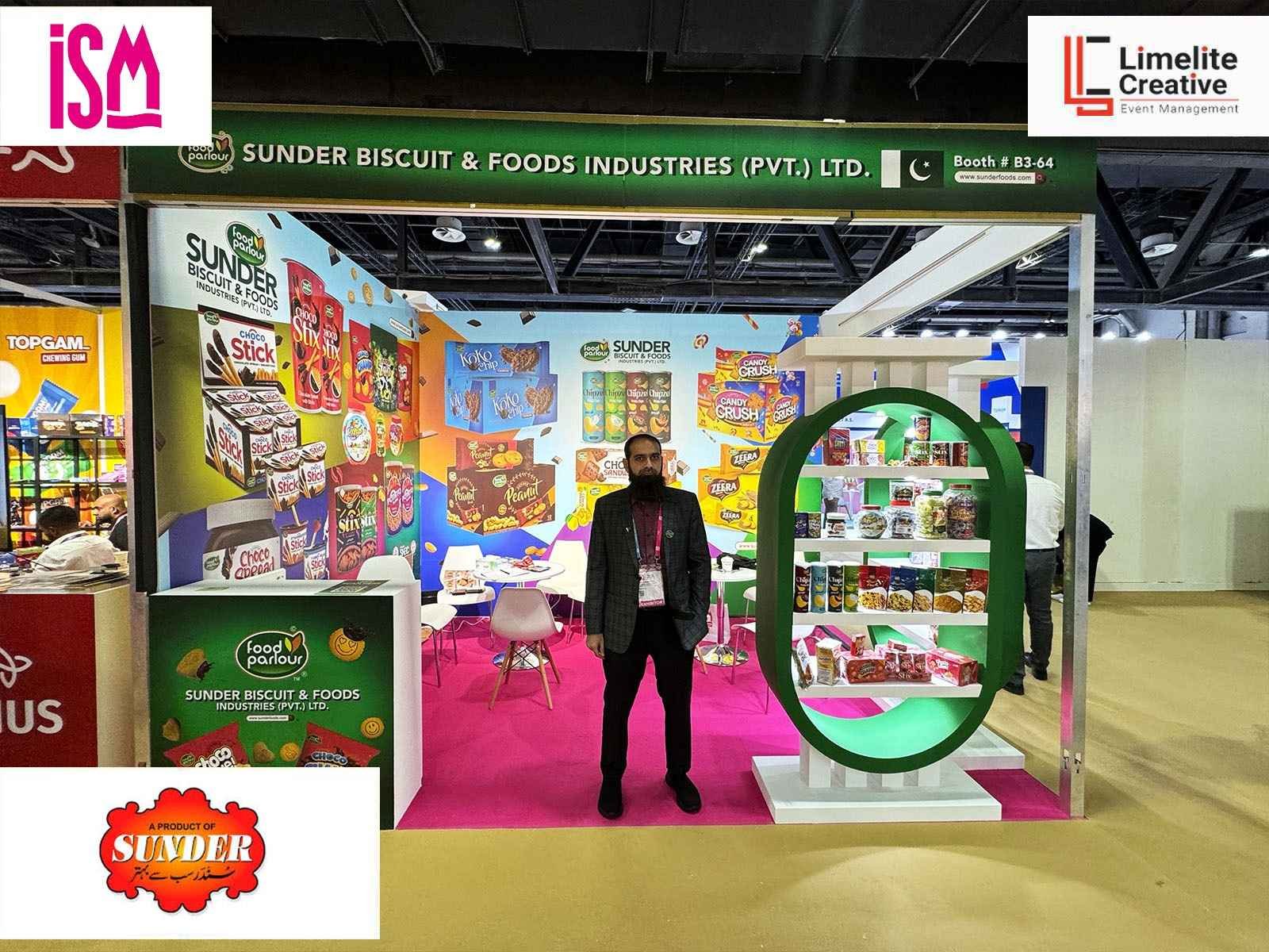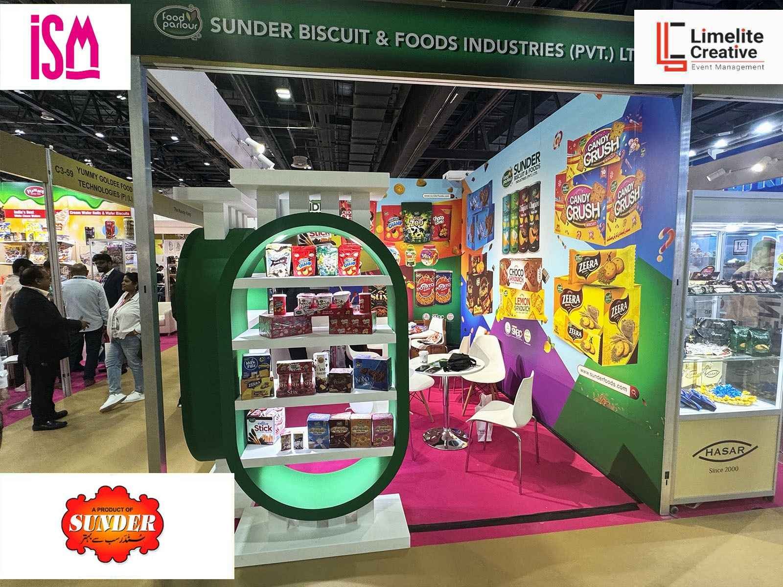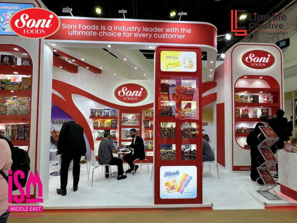 Soni Foods stall size was 8mX3m having total area of 24 squares meter. The design looked simple & beautiful with nicely lighted logos on counter & back wall along with backlit boards.