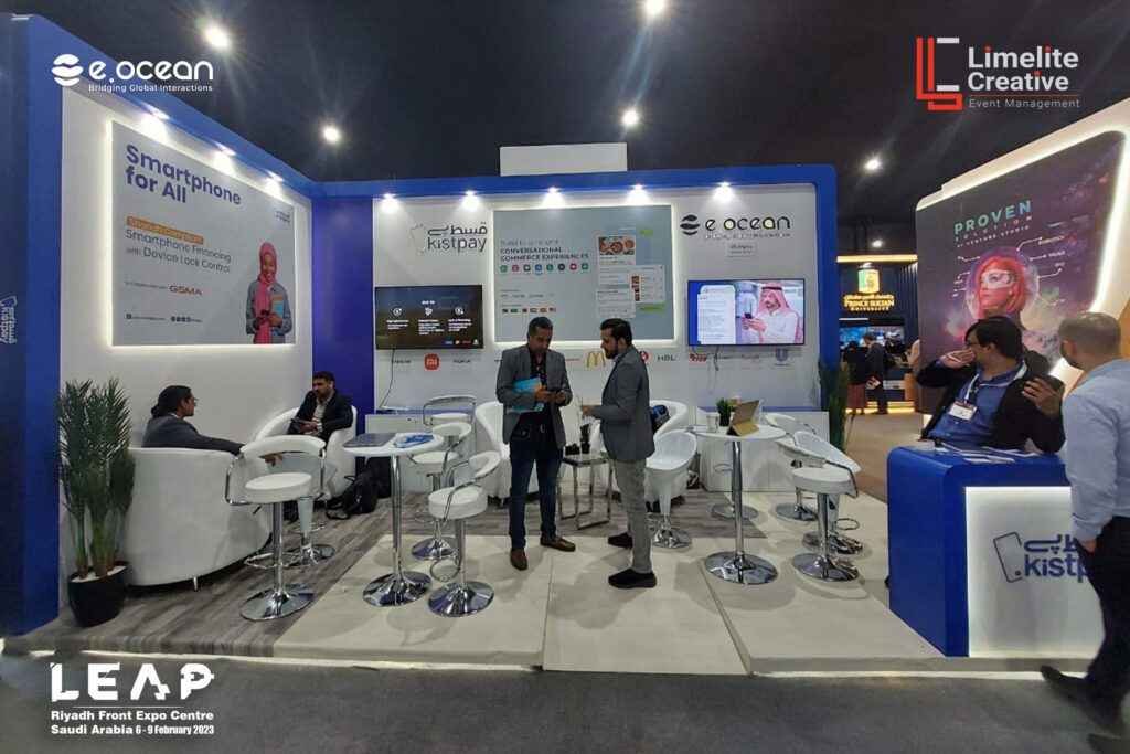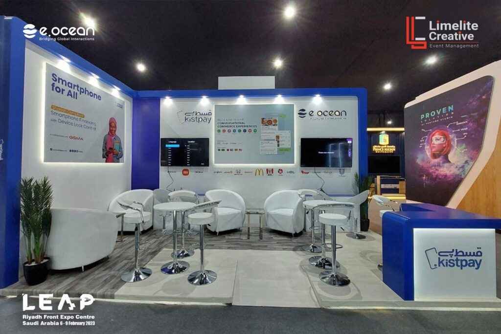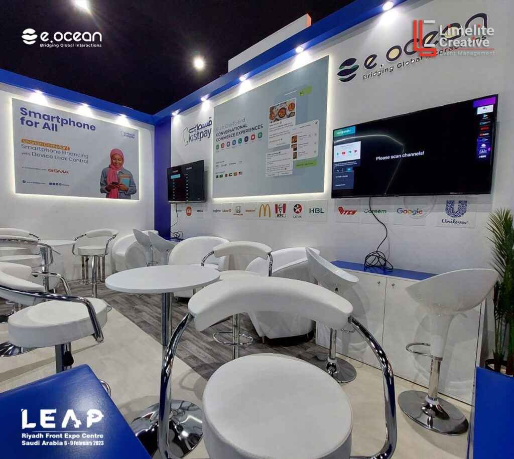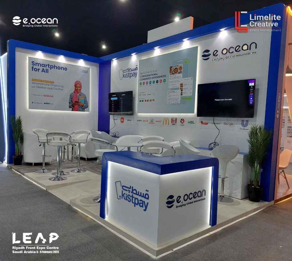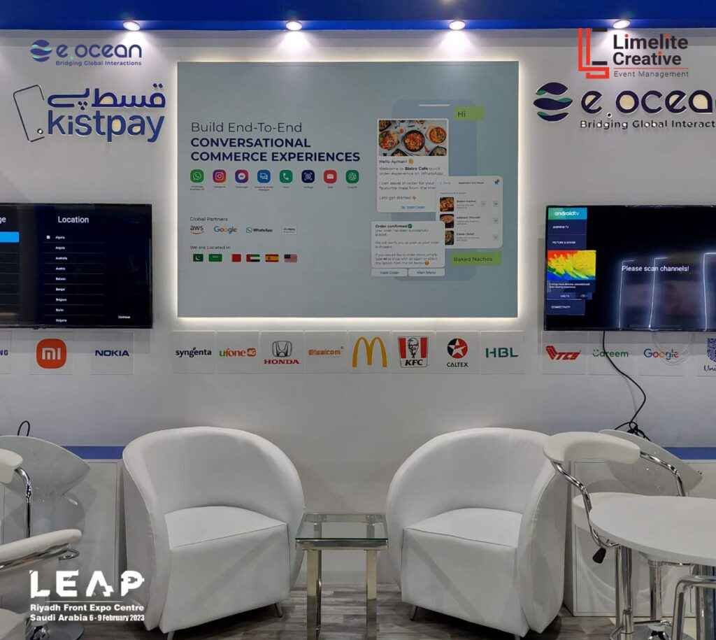 Eocean stall size was 6mX3m having total area of 18 squares meter. The design looked simple & beautiful with nicely lighted logos on counter & back wall along with backlit boards.
