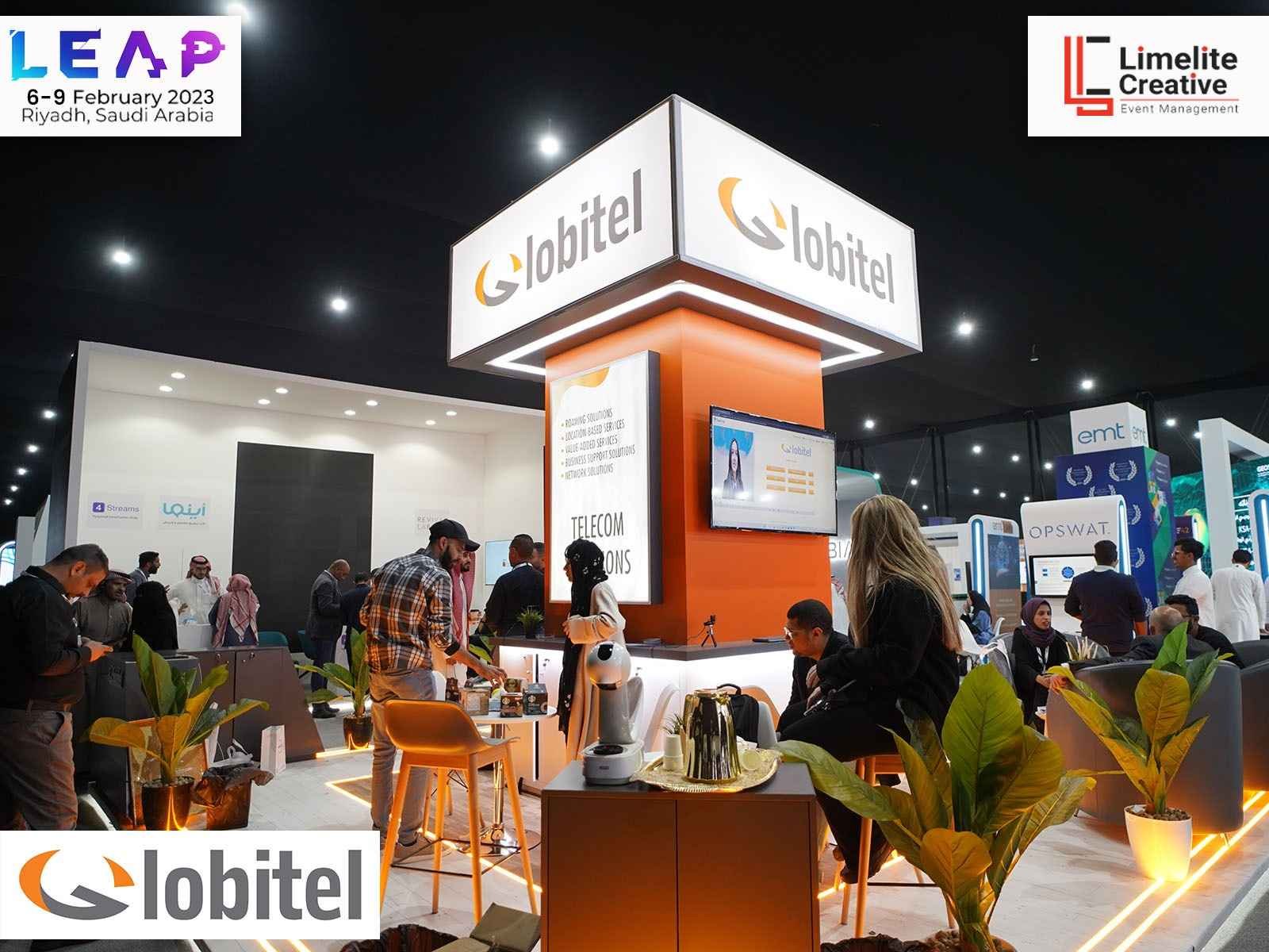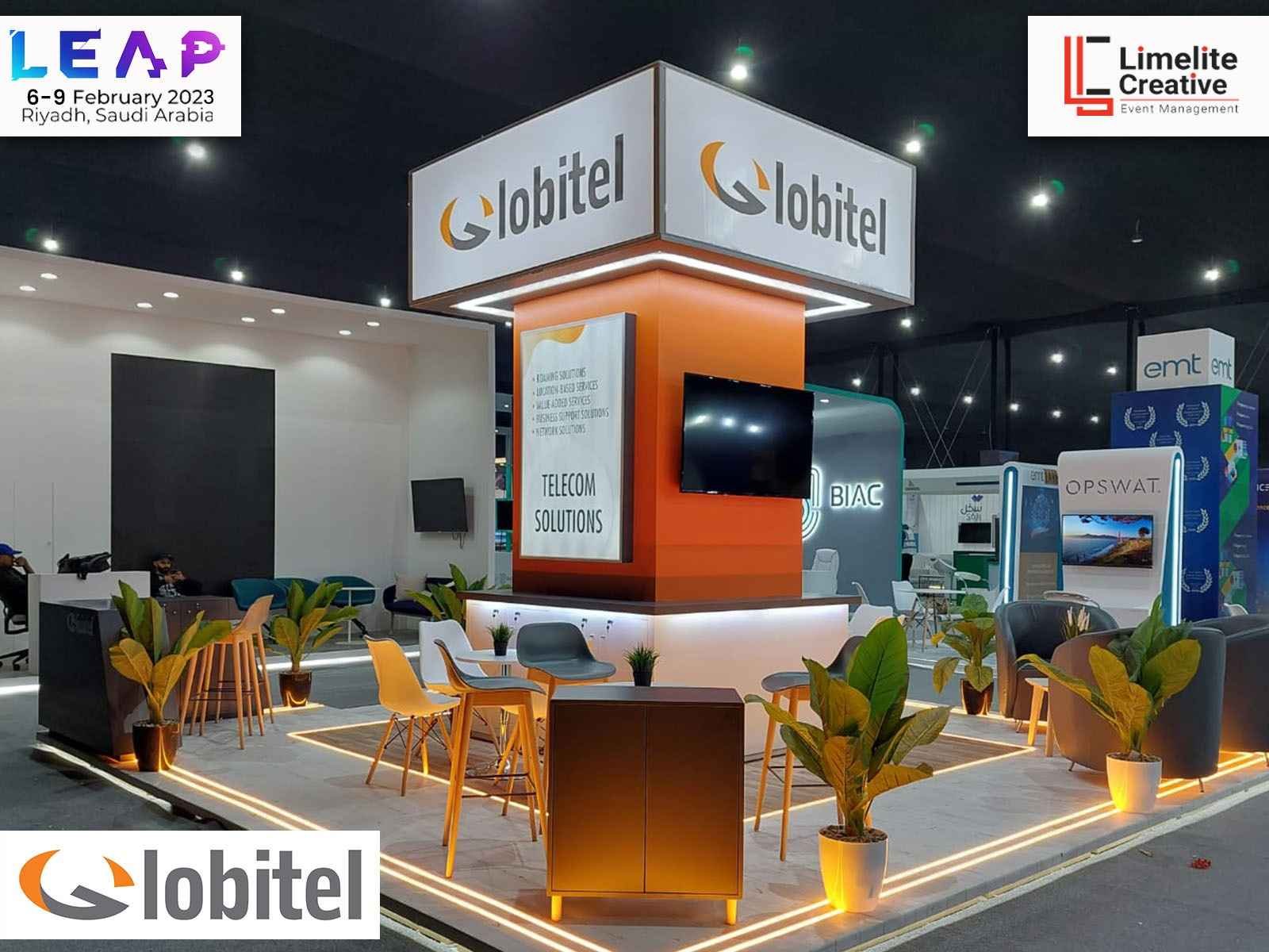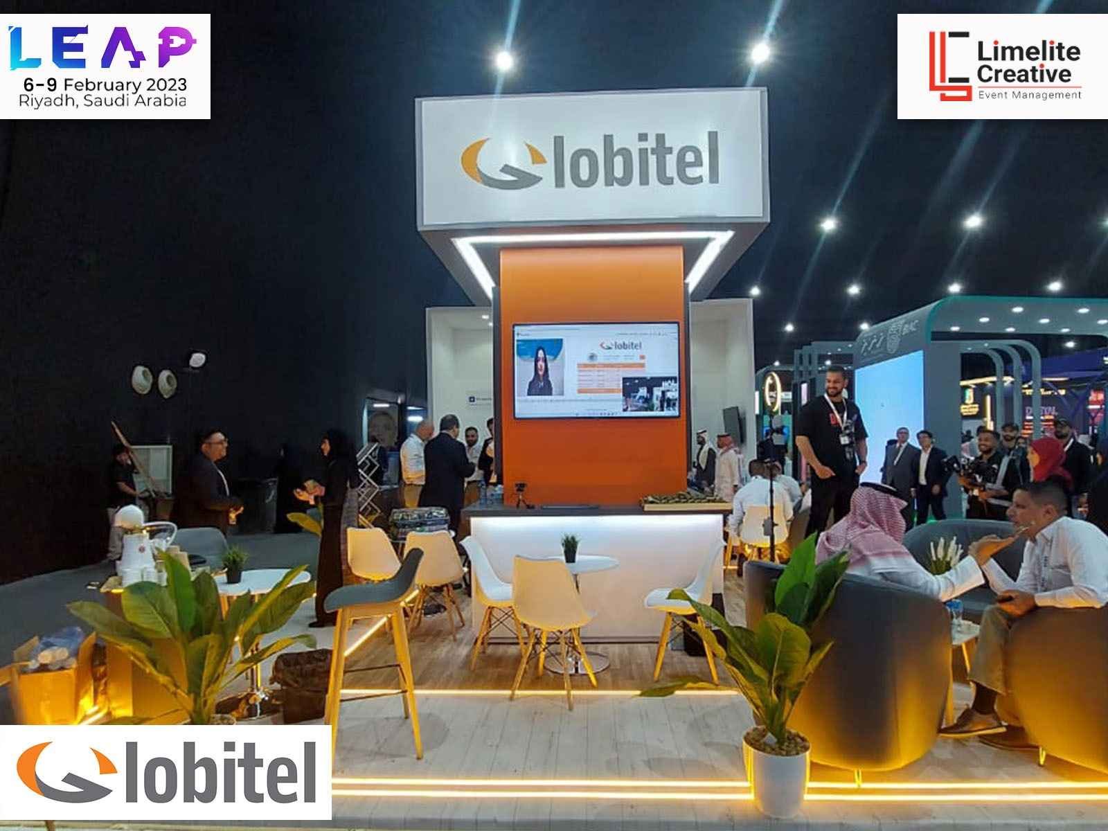 A 6m x 6m booth for Globitel at Leap 2023, featuring an open layout, bold branding, and interactive displays to showcase innovative telecom solutions and attract industry leaders.