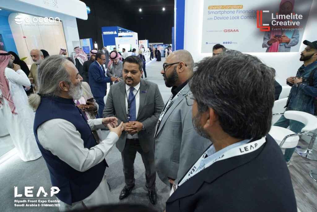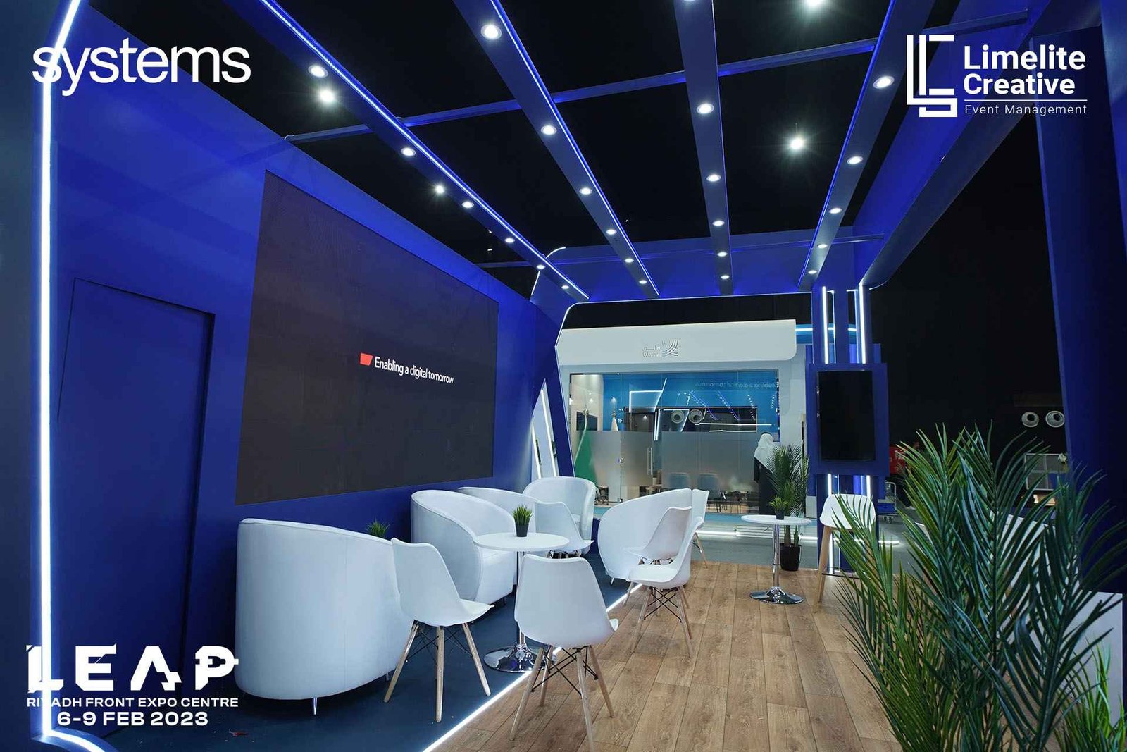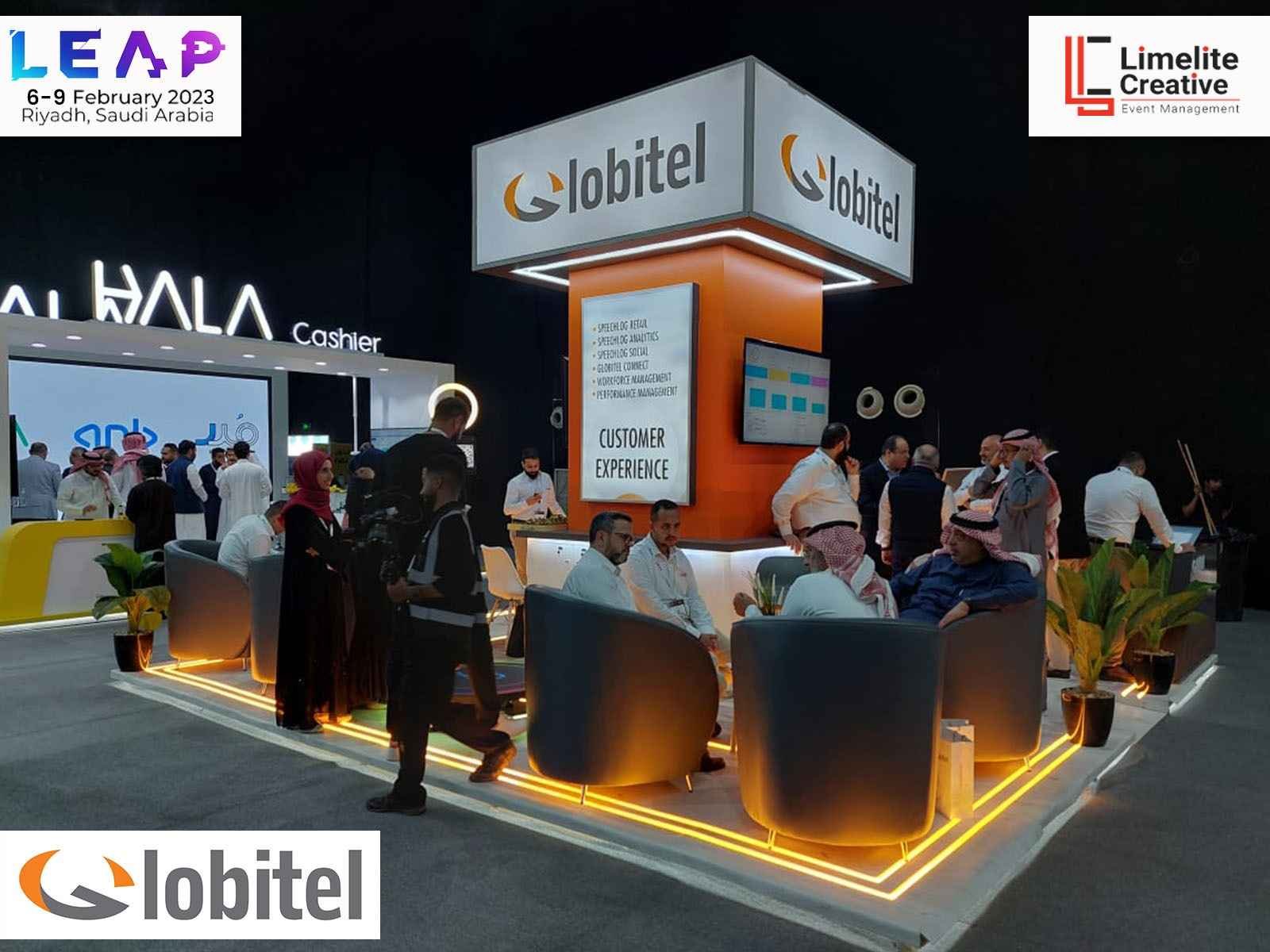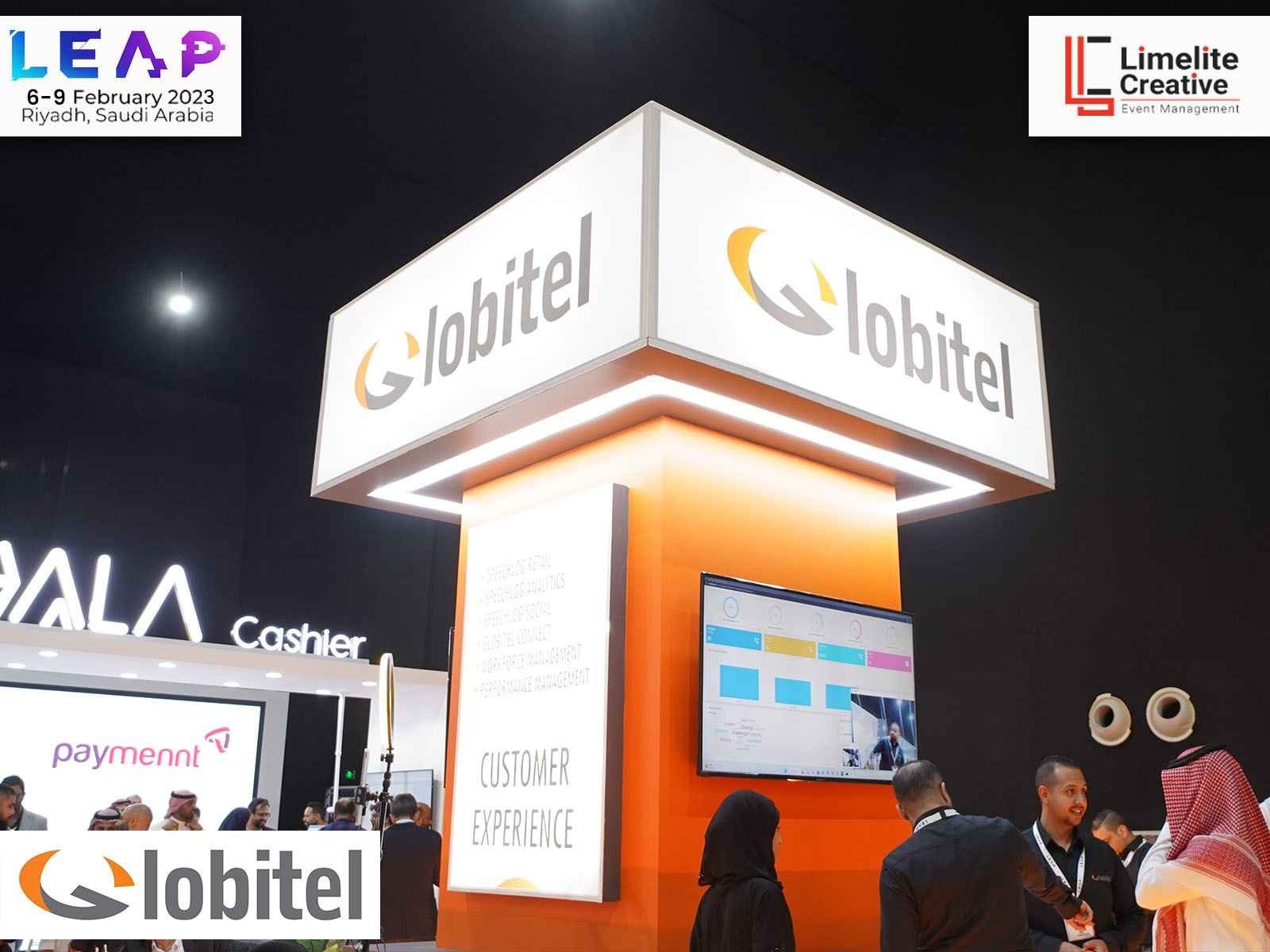 A 6m x 6m booth for Globitel at Leap 2023, featuring an open layout, bold branding, and interactive displays to showcase innovative telecom solutions and attract industry leaders.