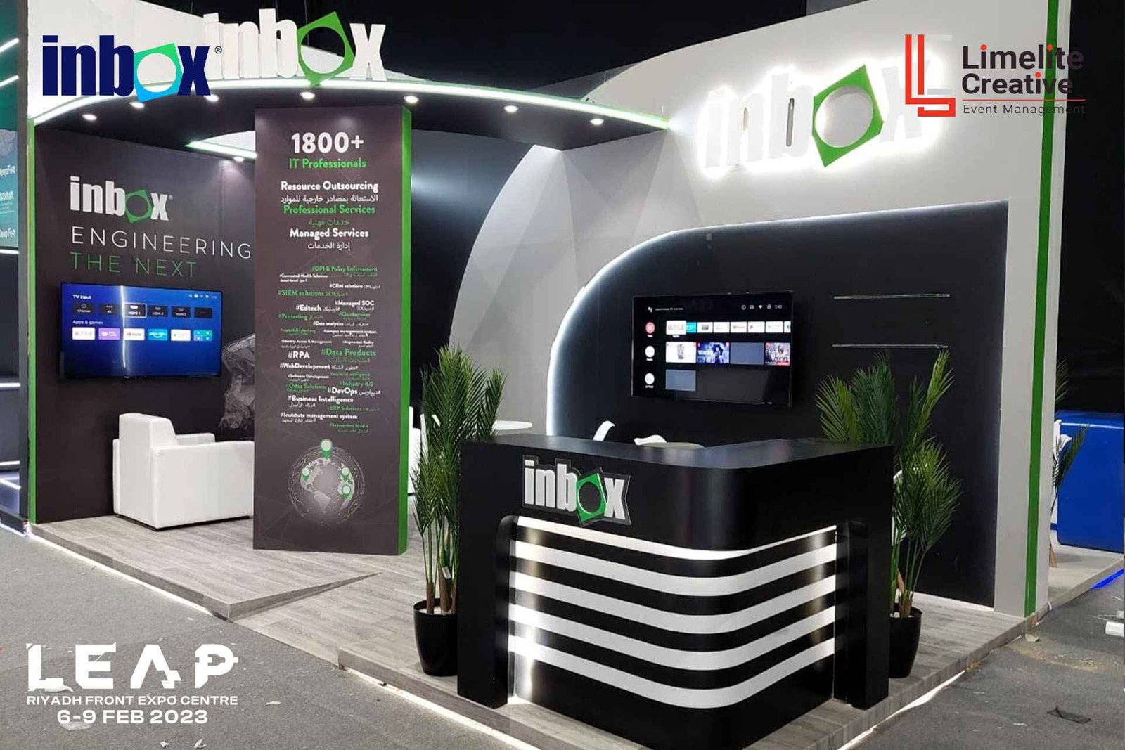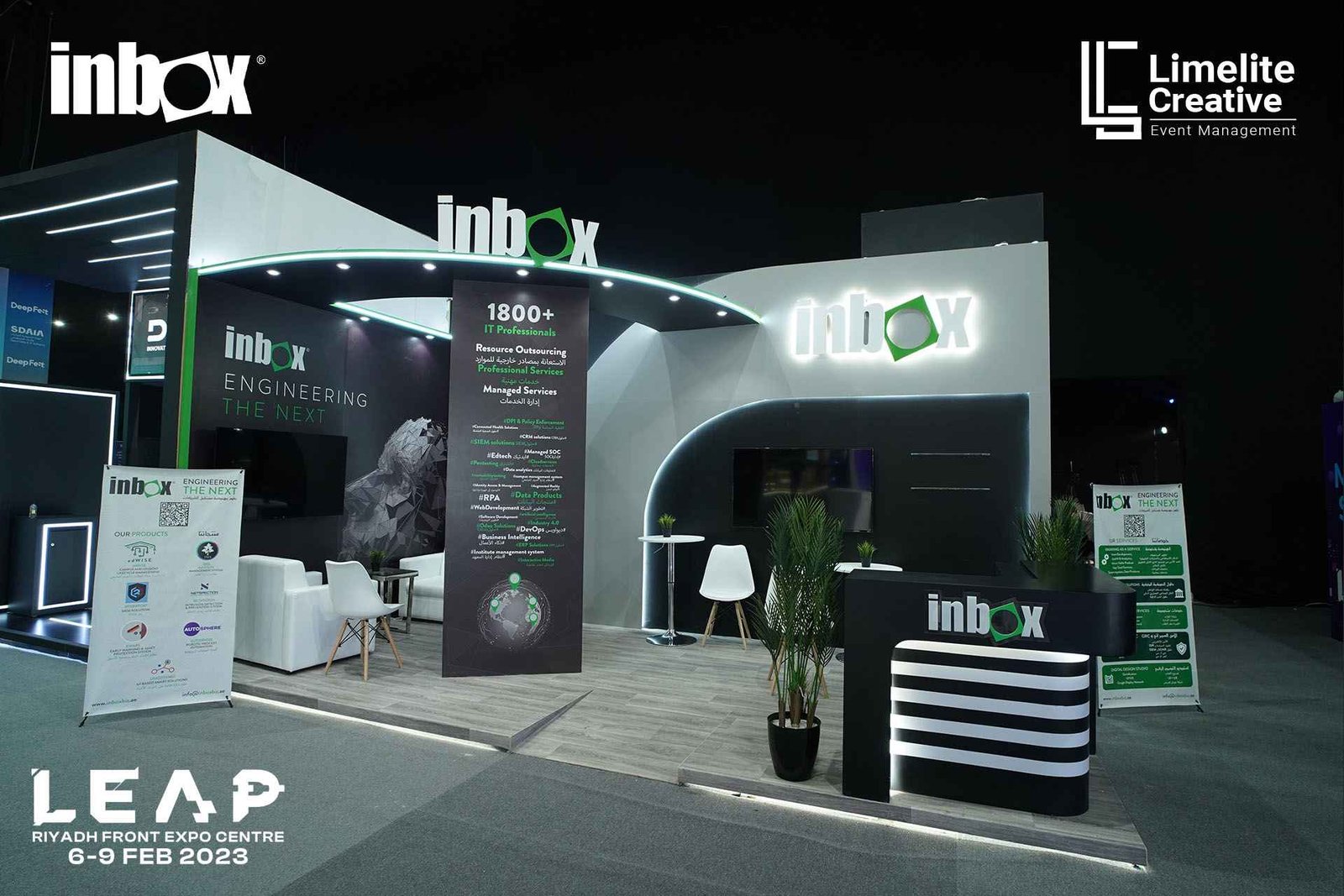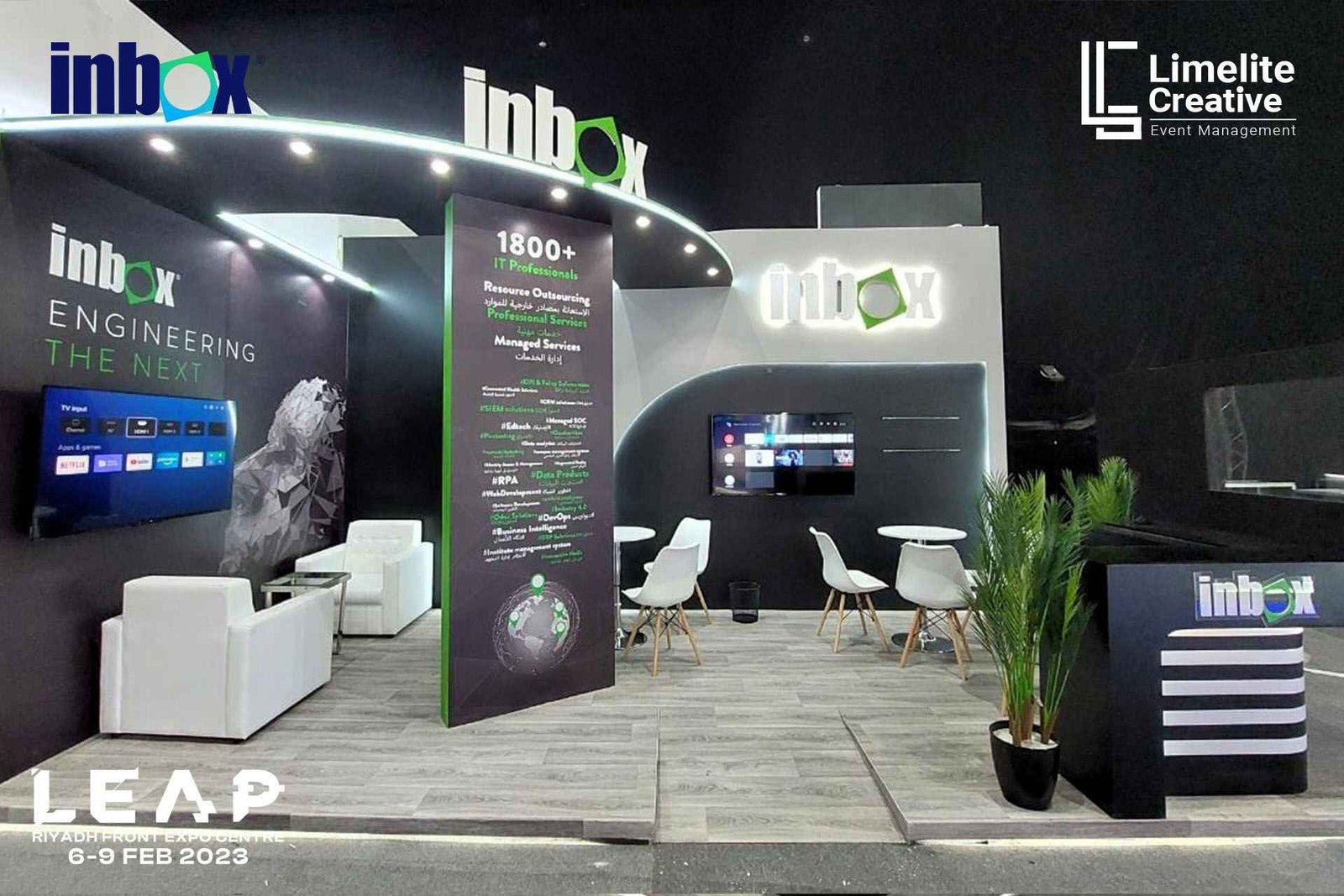 A 6m x 3m booth for Inbox at Leap 2023, designed with a sleek and modern layout, branded visuals, and engaging display areas to highlight their tech solutions and attract key visitors.