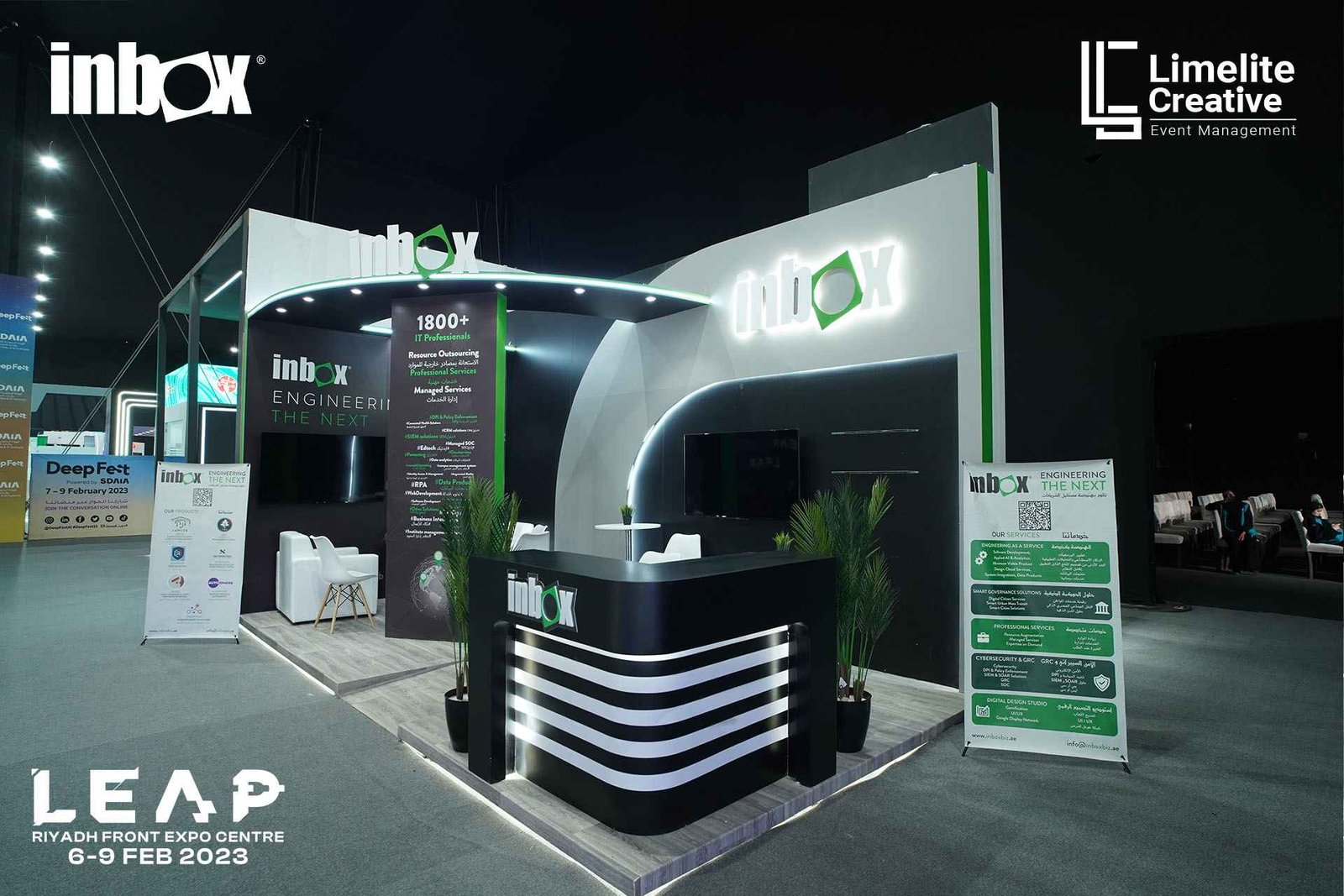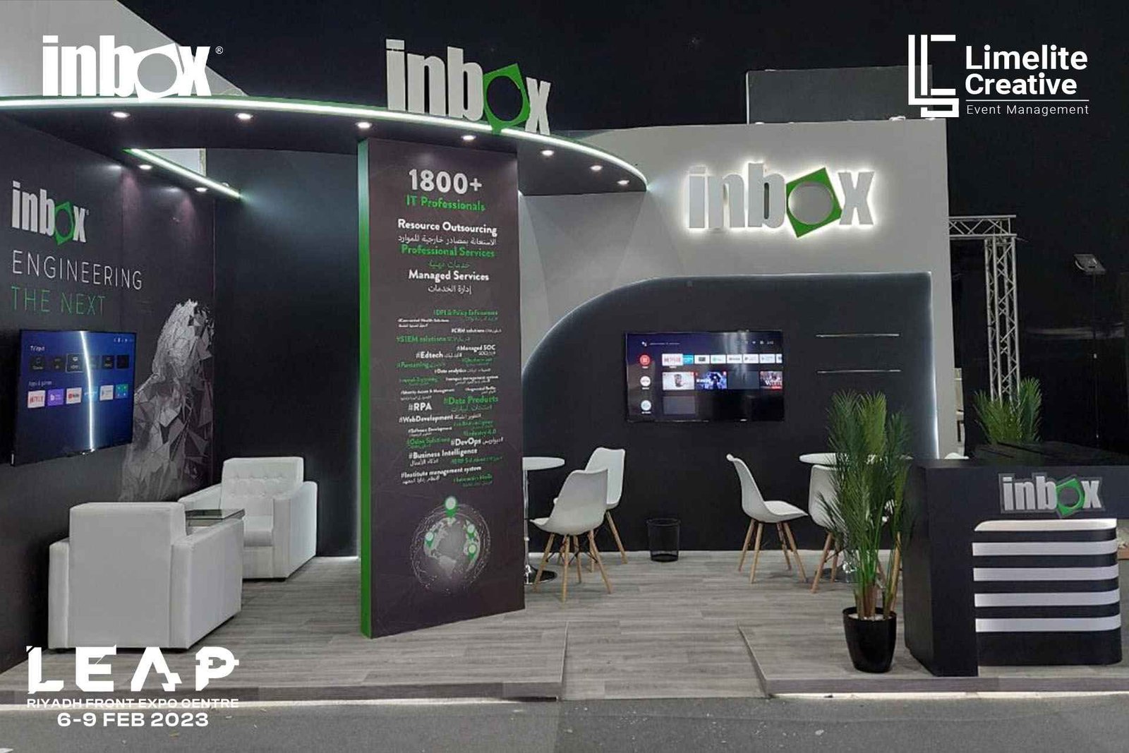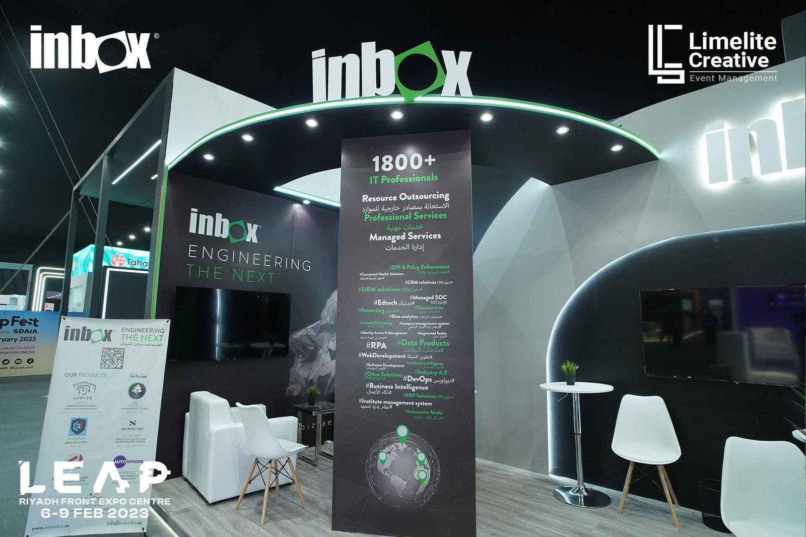 A 6m x 3m booth for Inbox at Leap 2023, designed with a sleek and modern layout, branded visuals, and engaging display areas to highlight their tech solutions and attract key visitors.