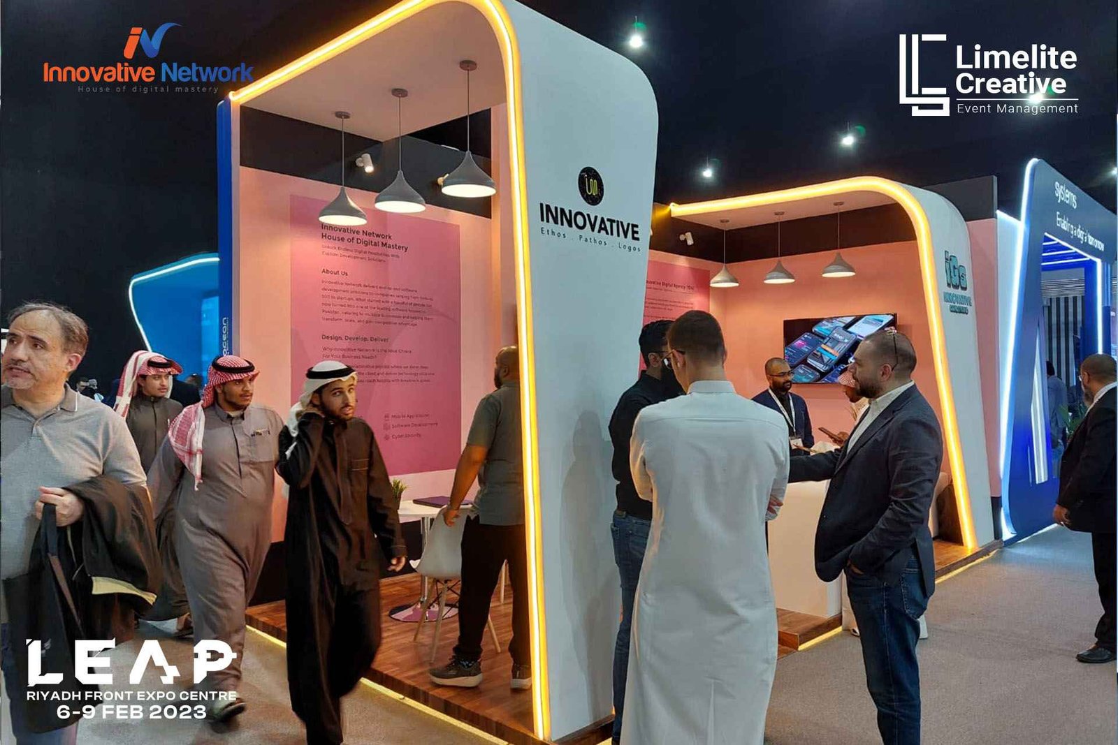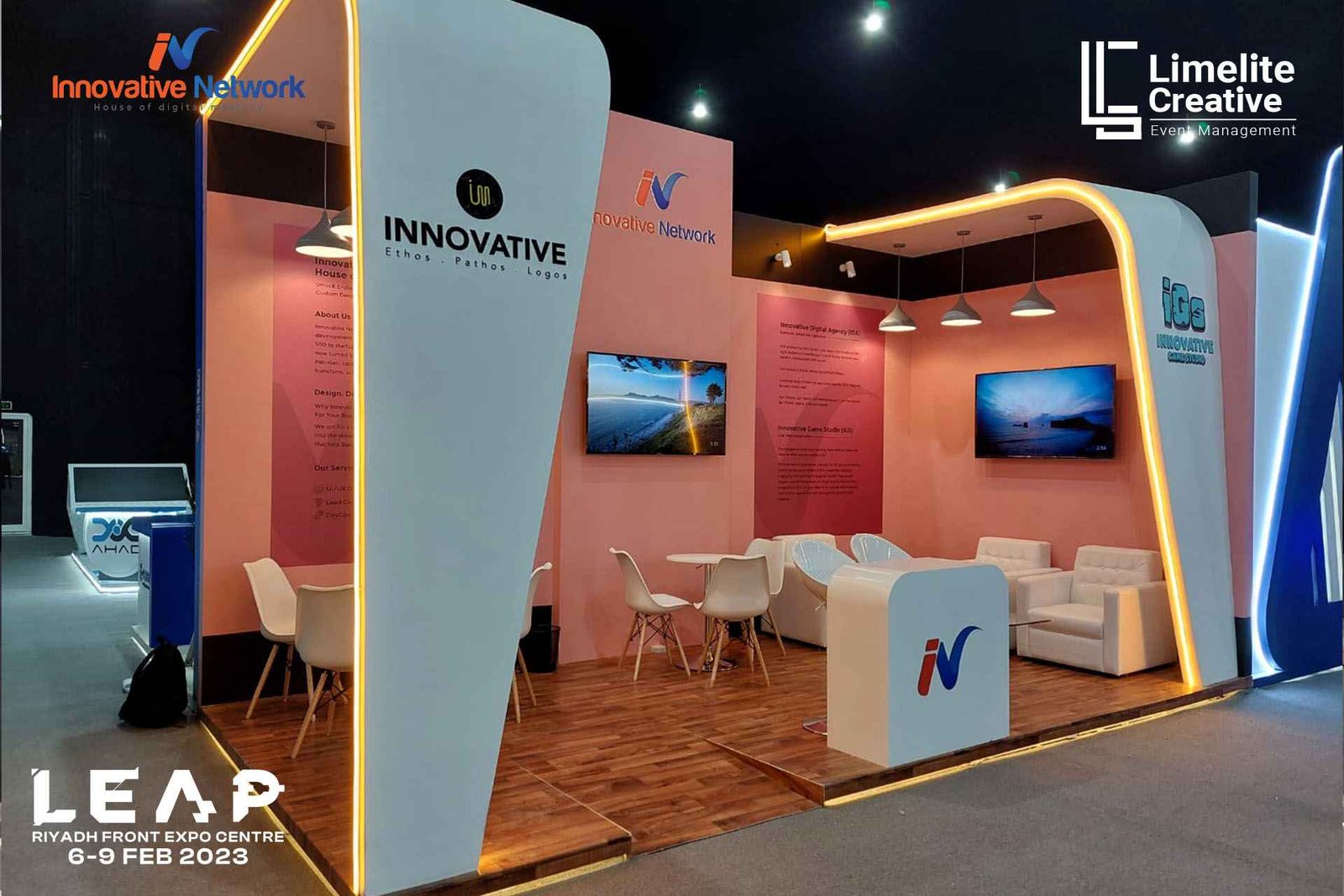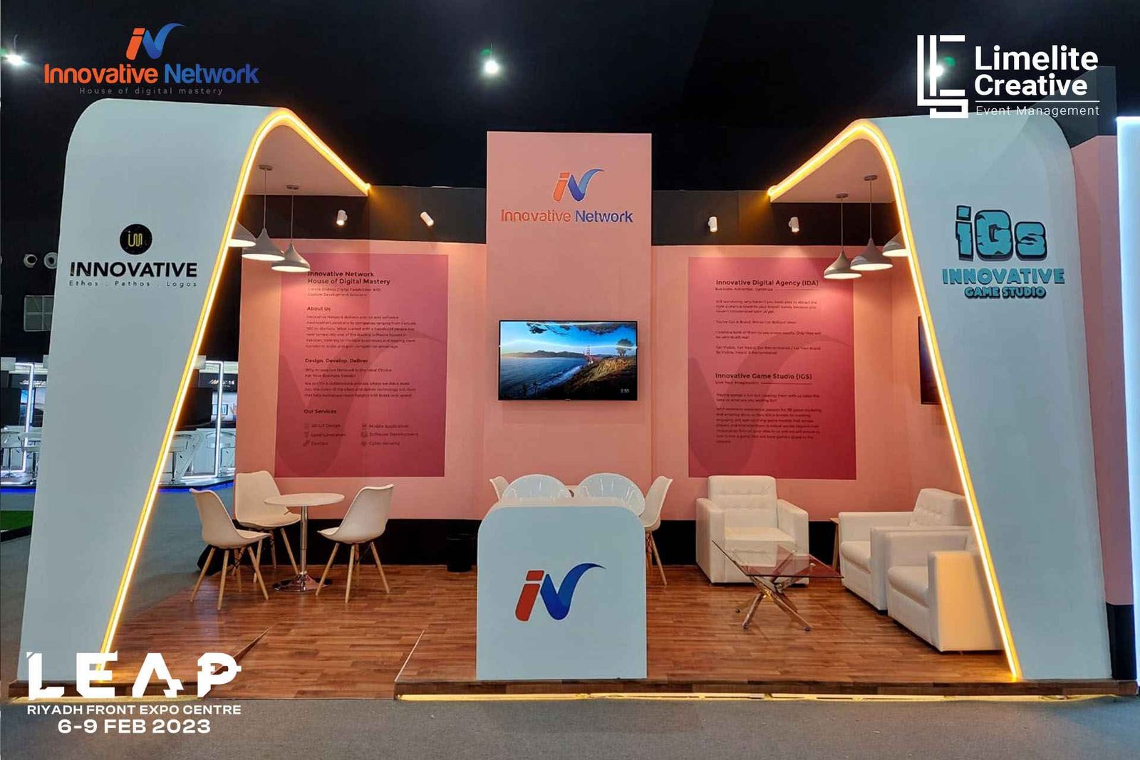 A 6m x 3m booth for Innovative at Leap 2023, featuring a modern design, interactive elements, and vibrant branding to showcase their cutting-edge technology solutions and engage attendees.
