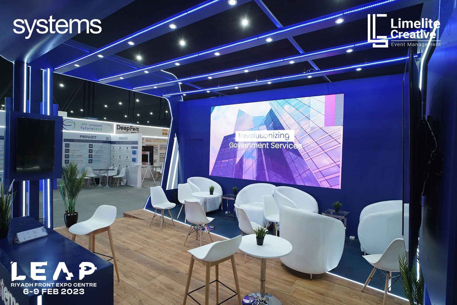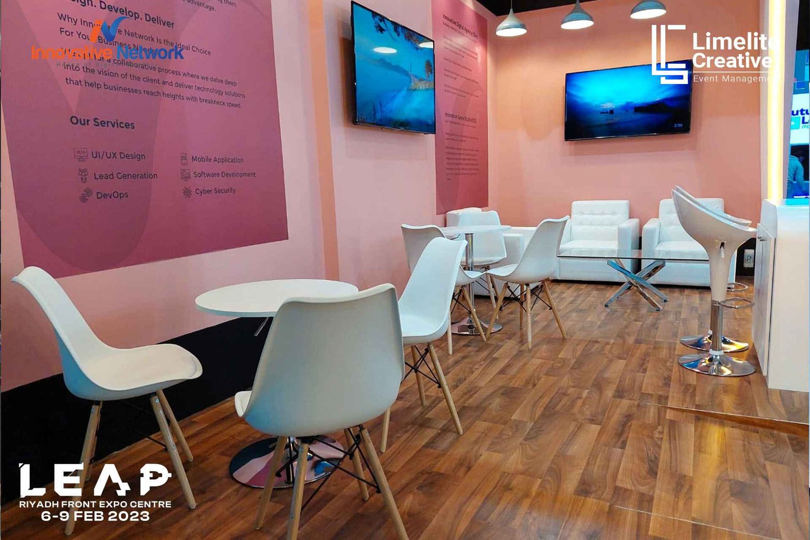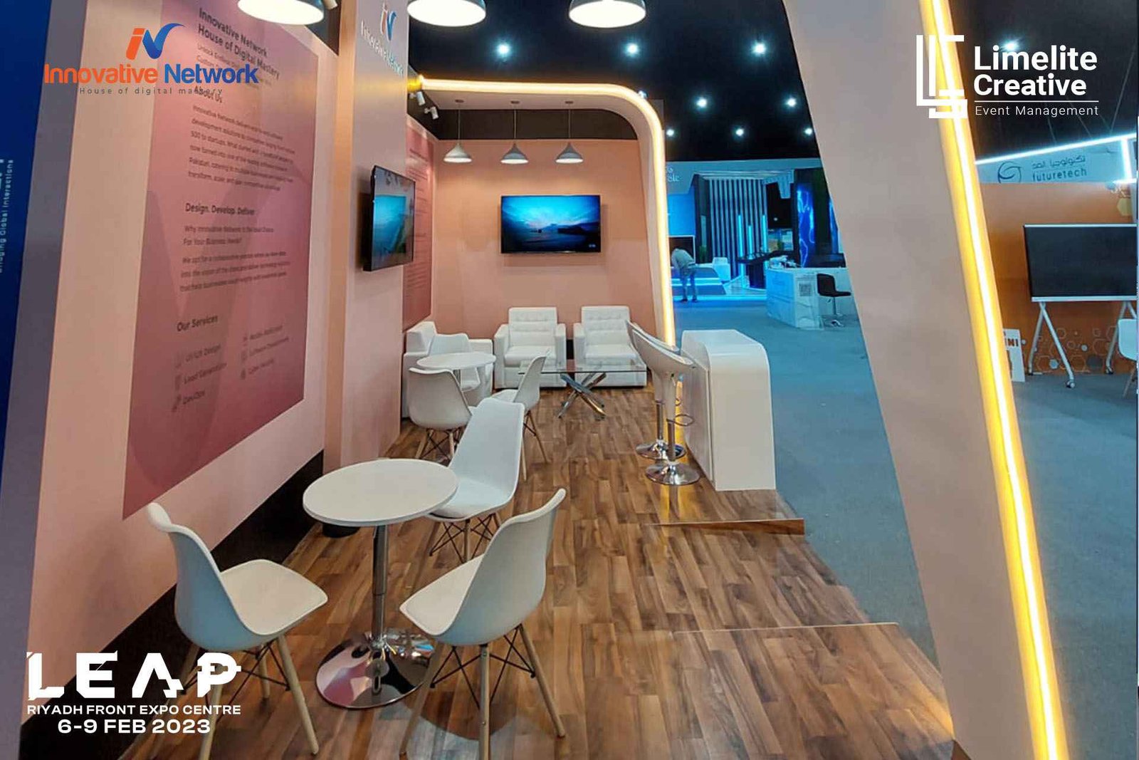 A 6m x 3m booth for Innovative at Leap 2023, featuring a modern design, interactive elements, and vibrant branding to showcase their cutting-edge technology solutions and engage attendees.