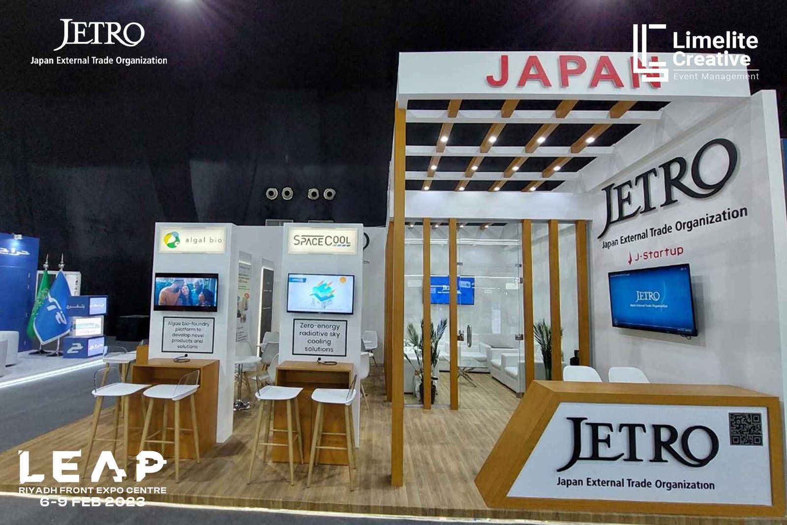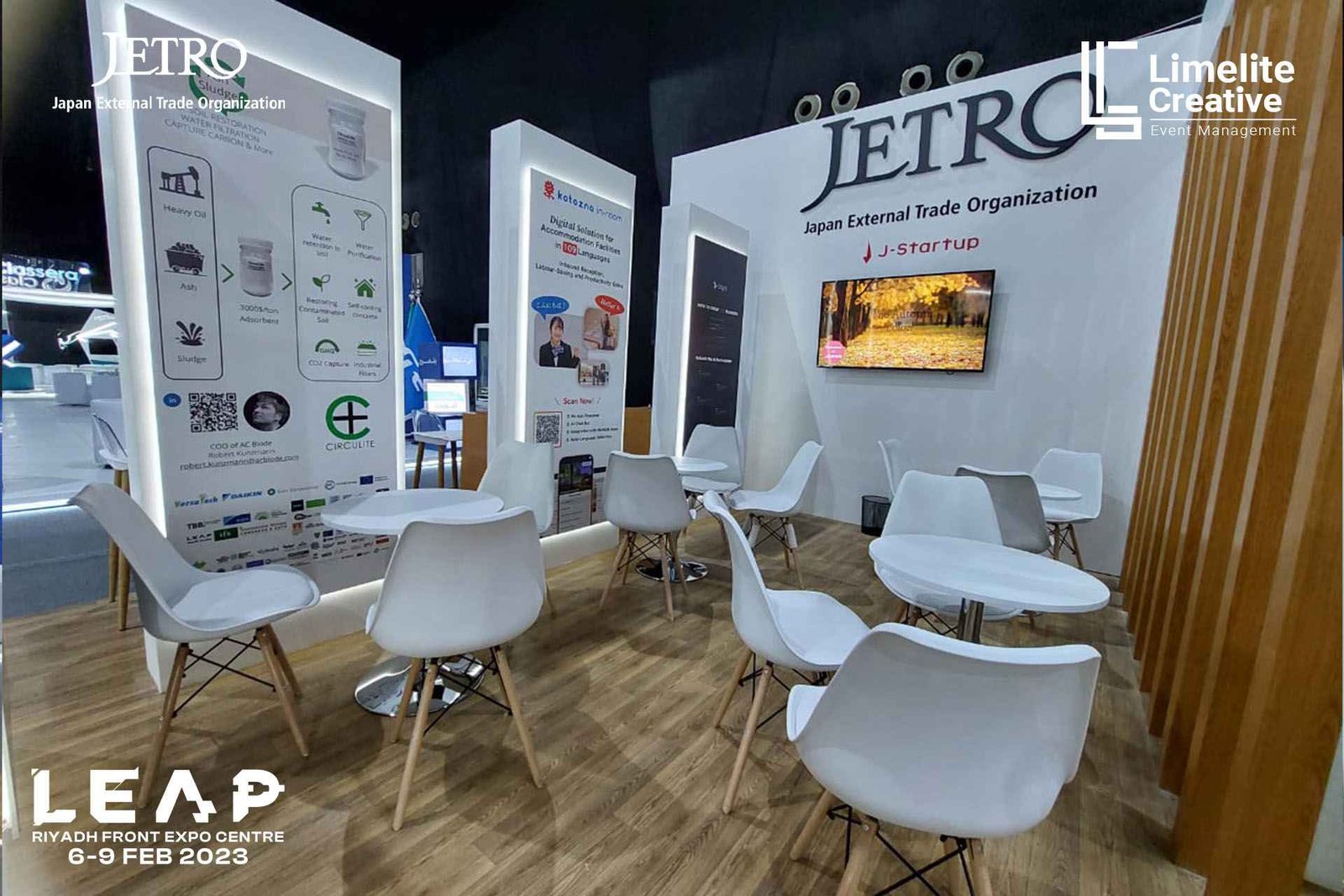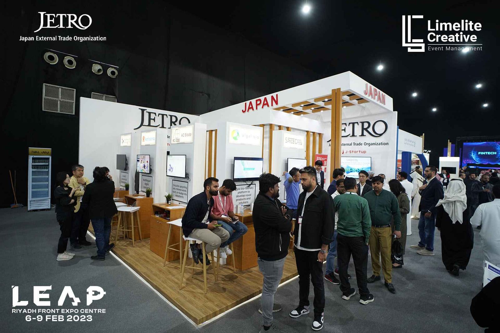 A 7m x 6m booth for Jetro at Leap 2023, designed with an open layout, sleek branding, and interactive zones to foster networking and showcase innovative solutions to global visitors.