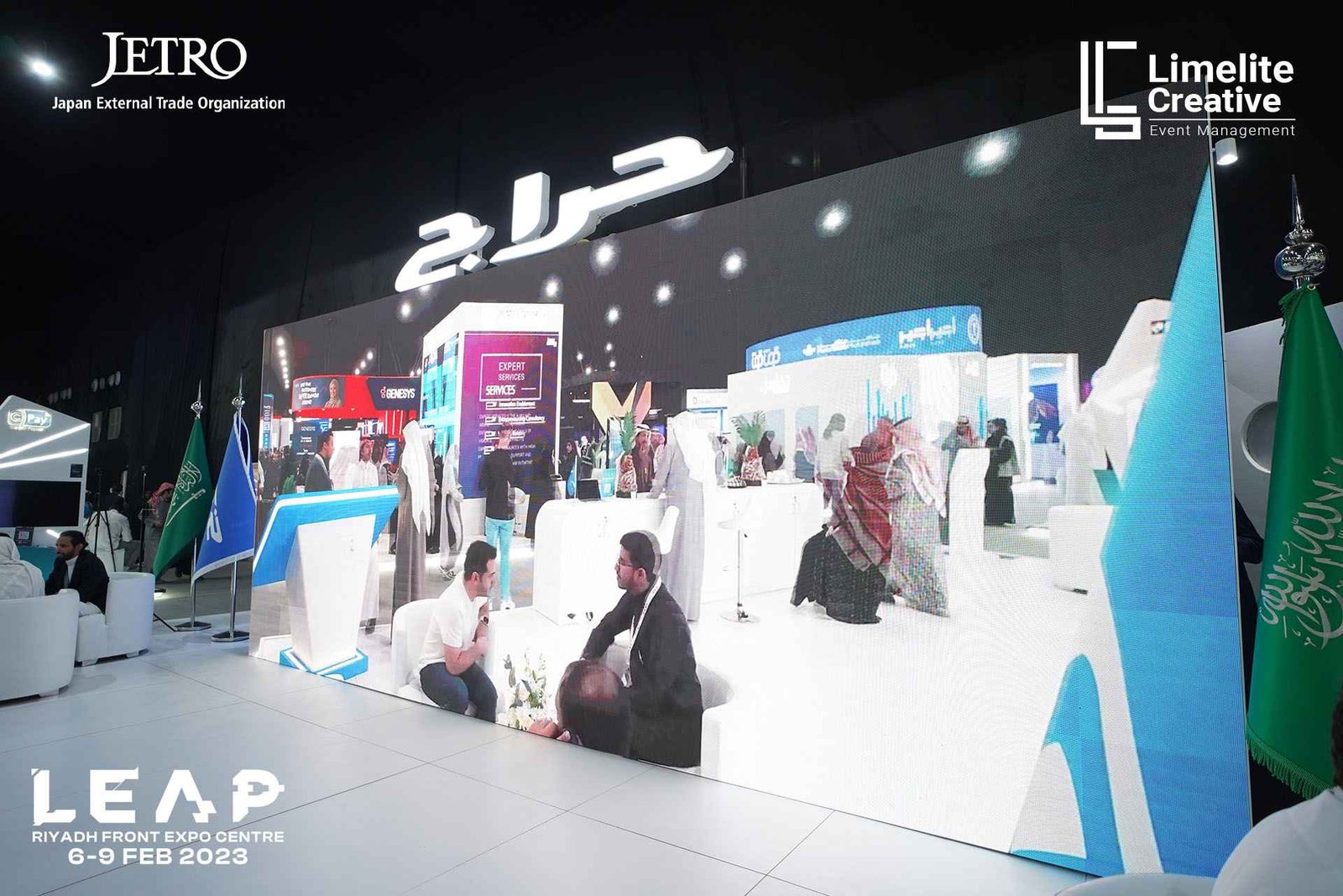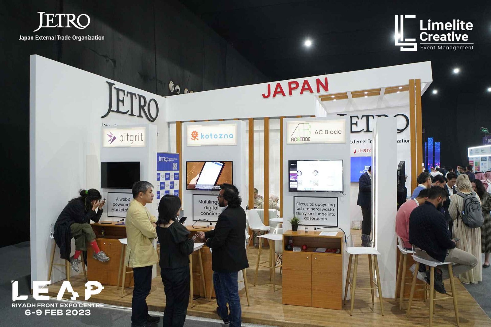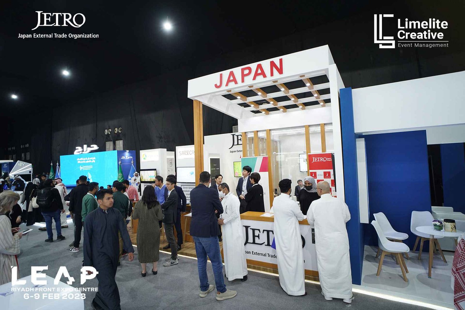 A 7m x 6m booth for Jetro at Leap 2023, designed with an open layout, sleek branding, and interactive zones to foster networking and showcase innovative solutions to global visitors.