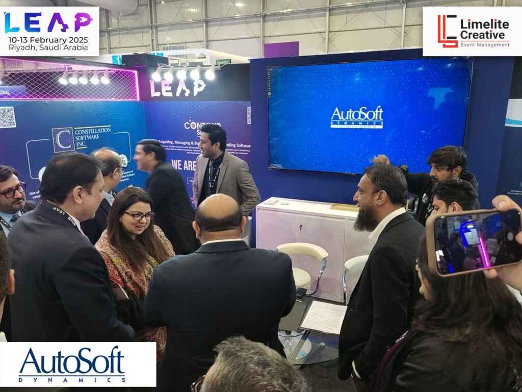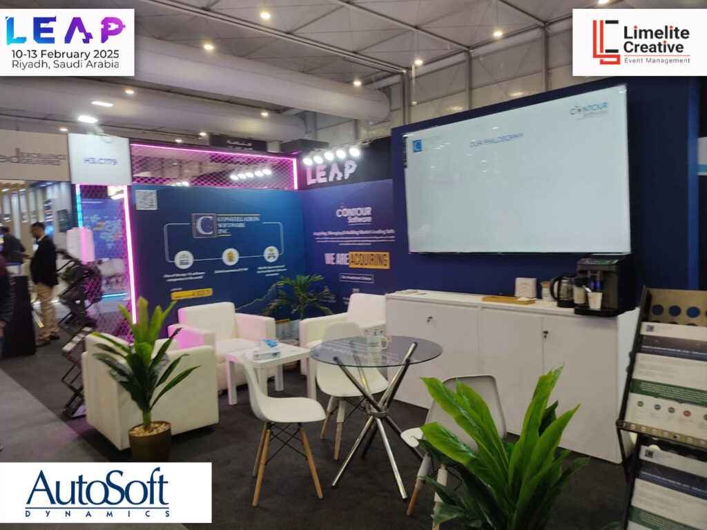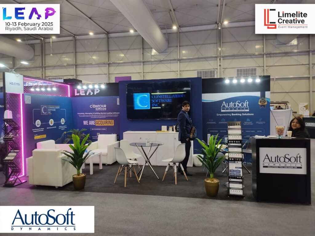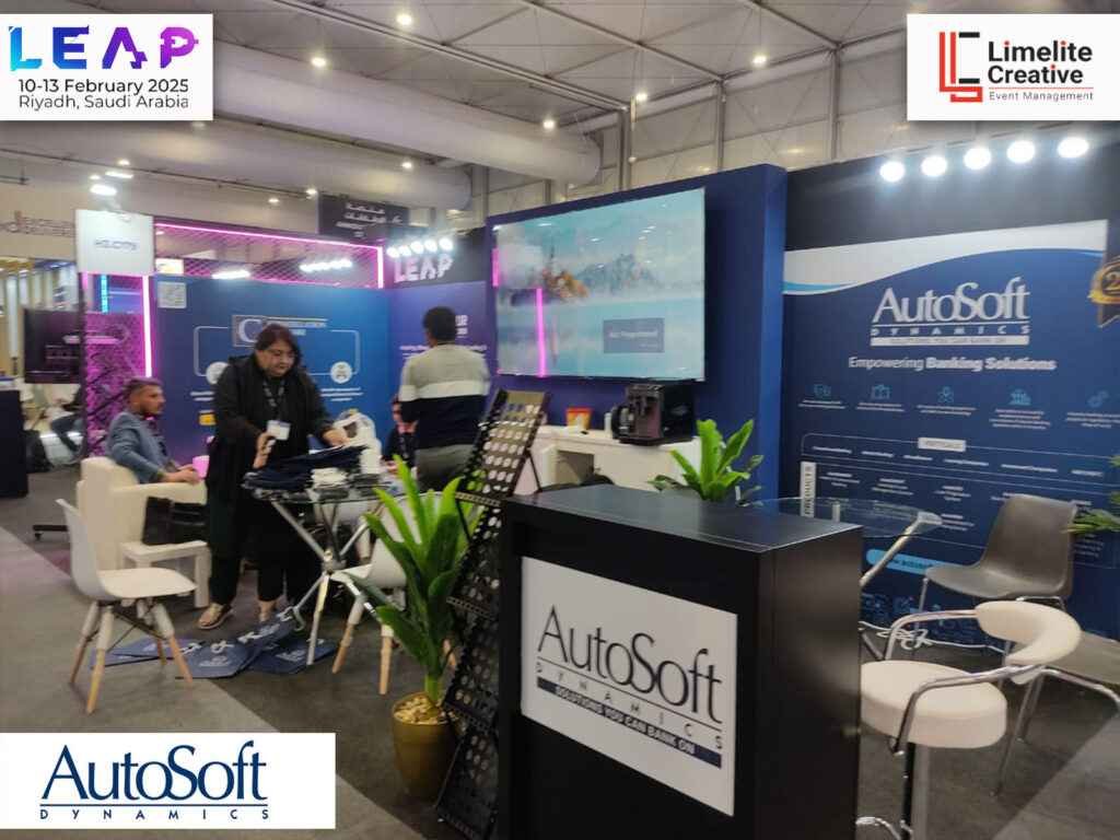 A smart and streamlined booth designed for AutoSoft, showcasing cutting-edge fintech solutions in a clean, modern space. Interactive screens, bold visuals, and focused lighting highlighted the brand’s innovation in automation and banking technology, attracting tech-savvy visitors, partners, and investors.