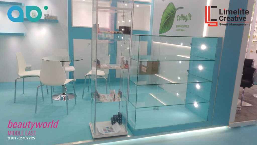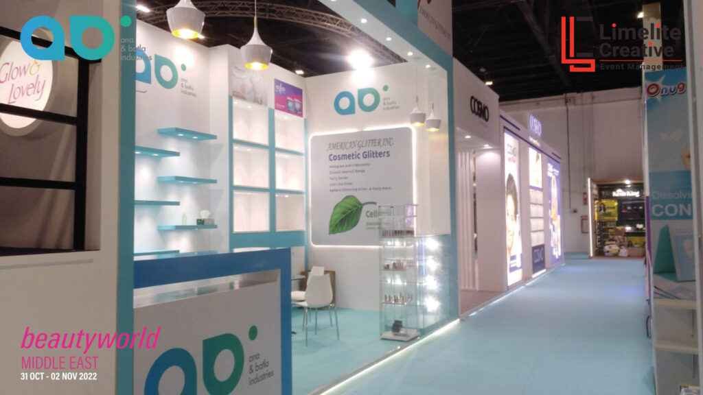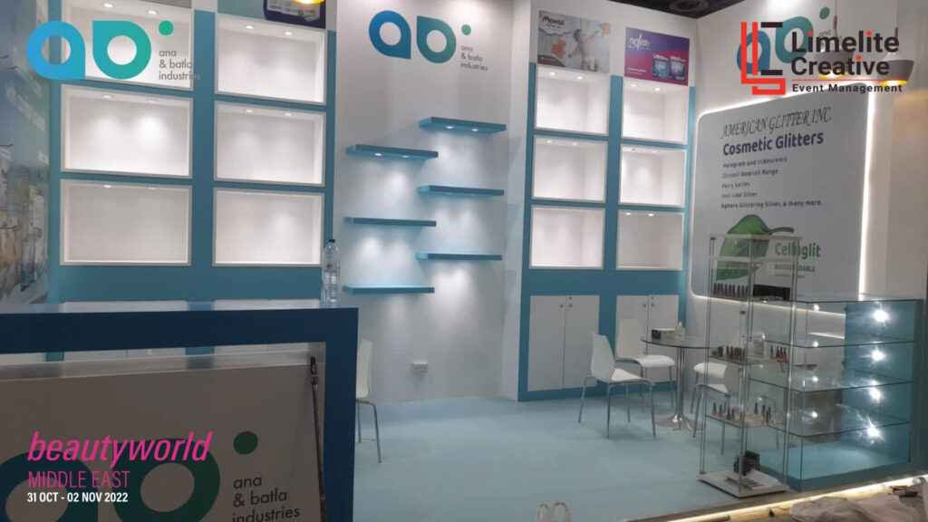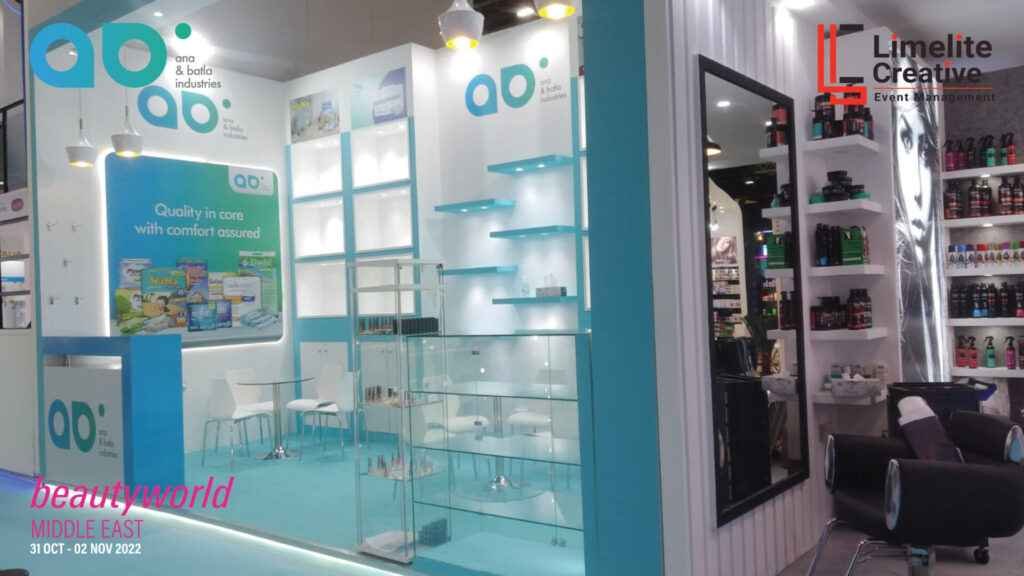 A stylish and modern booth for Ana & Batla, featuring elegant product displays and soft lighting to highlight their beauty offerings. The clean design attracted attention from industry professionals and beauty enthusiasts.