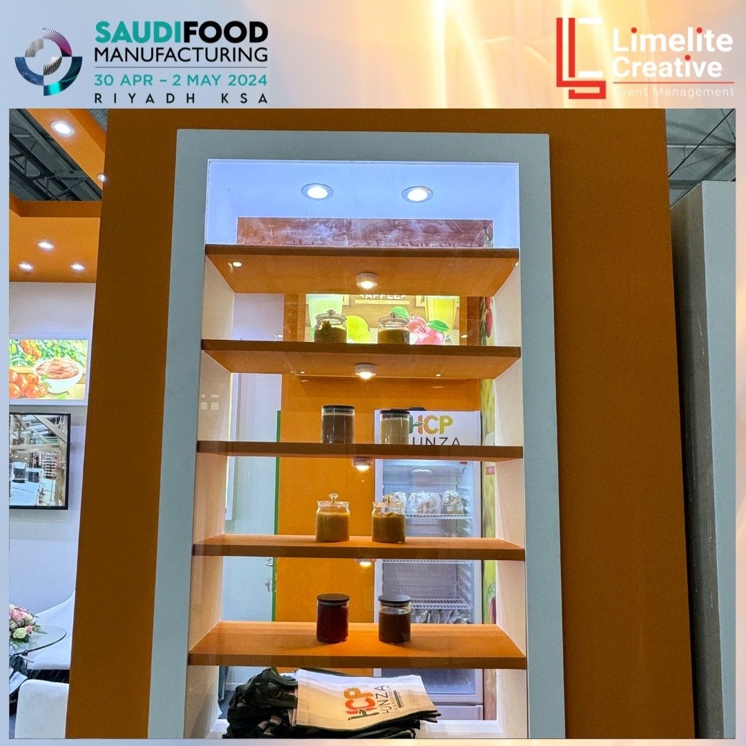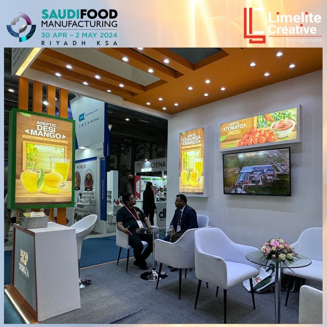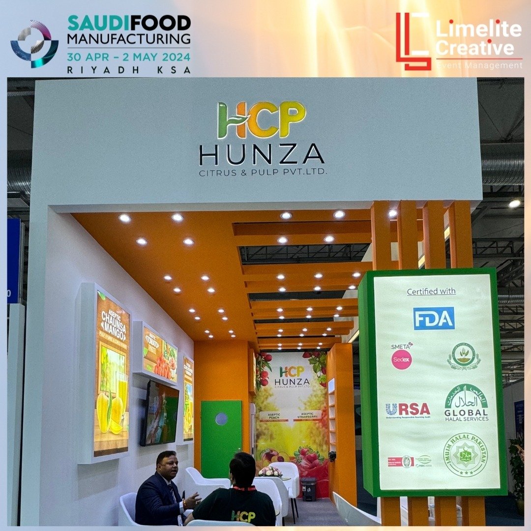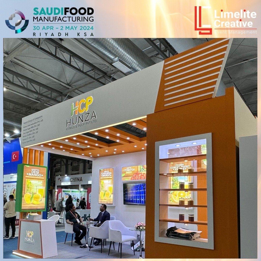 A sleek and functional 18 sqm booth for Hunza at Saudi Food Manufacturing 2024, designed with premium branding, well-organized product displays, and a welcoming layout to engage visitors and showcase quality offerings.