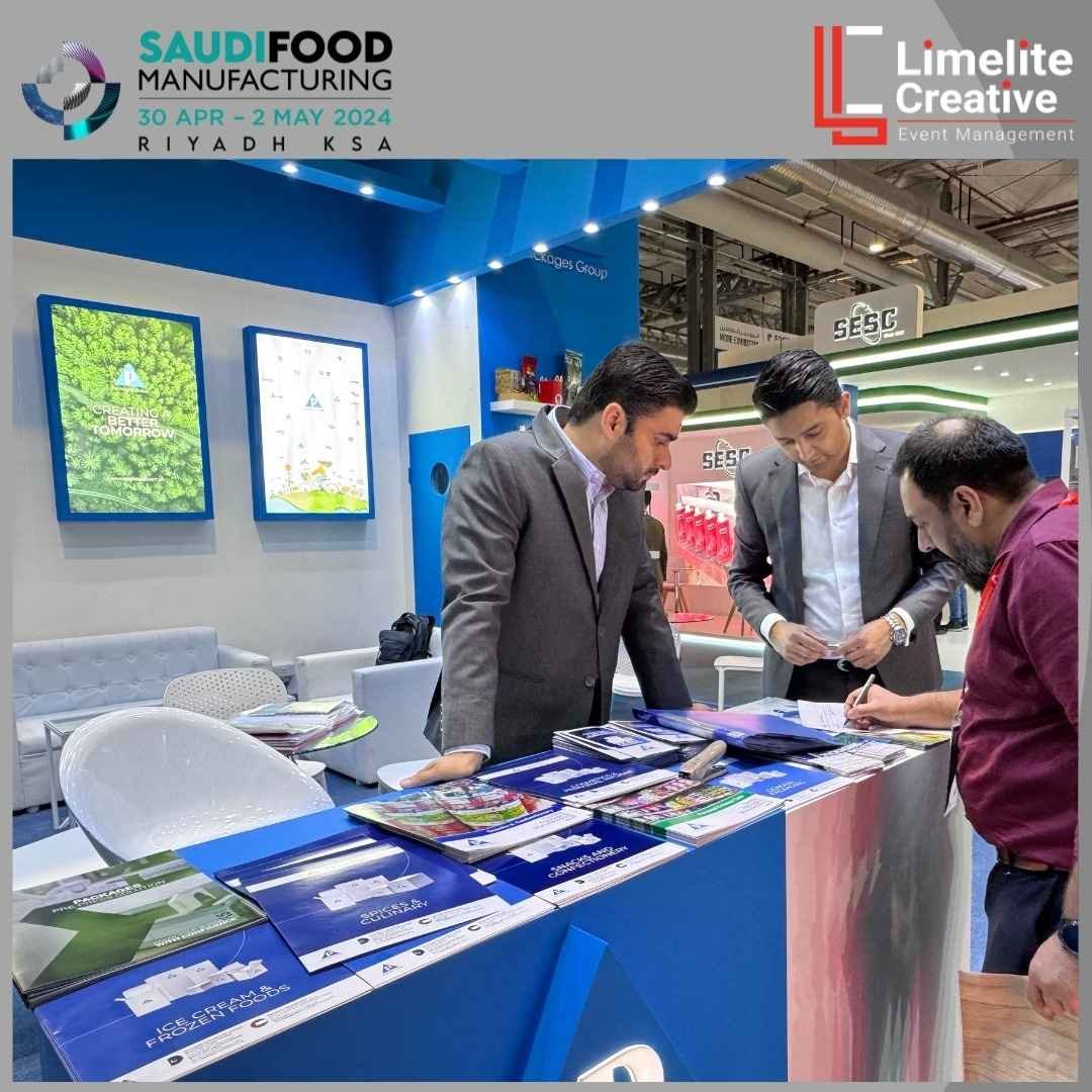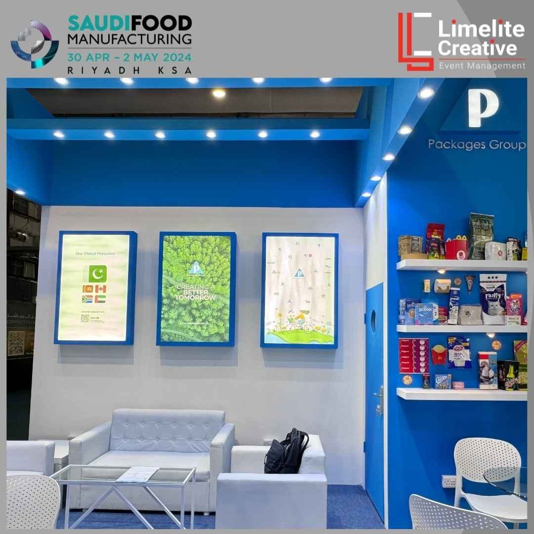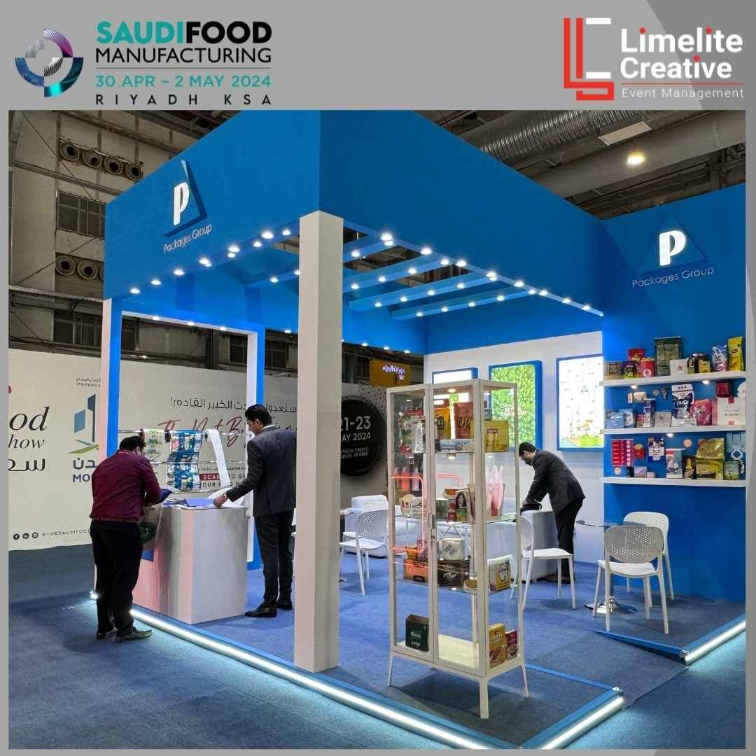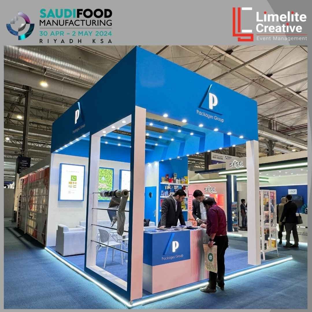A sleek and functional 18 sqm booth for Hunza at Saudi Food Manufacturing 2024, designed with premium branding, well-organized product displays, and a welcoming layout to engage visitors and showcase quality offerings.